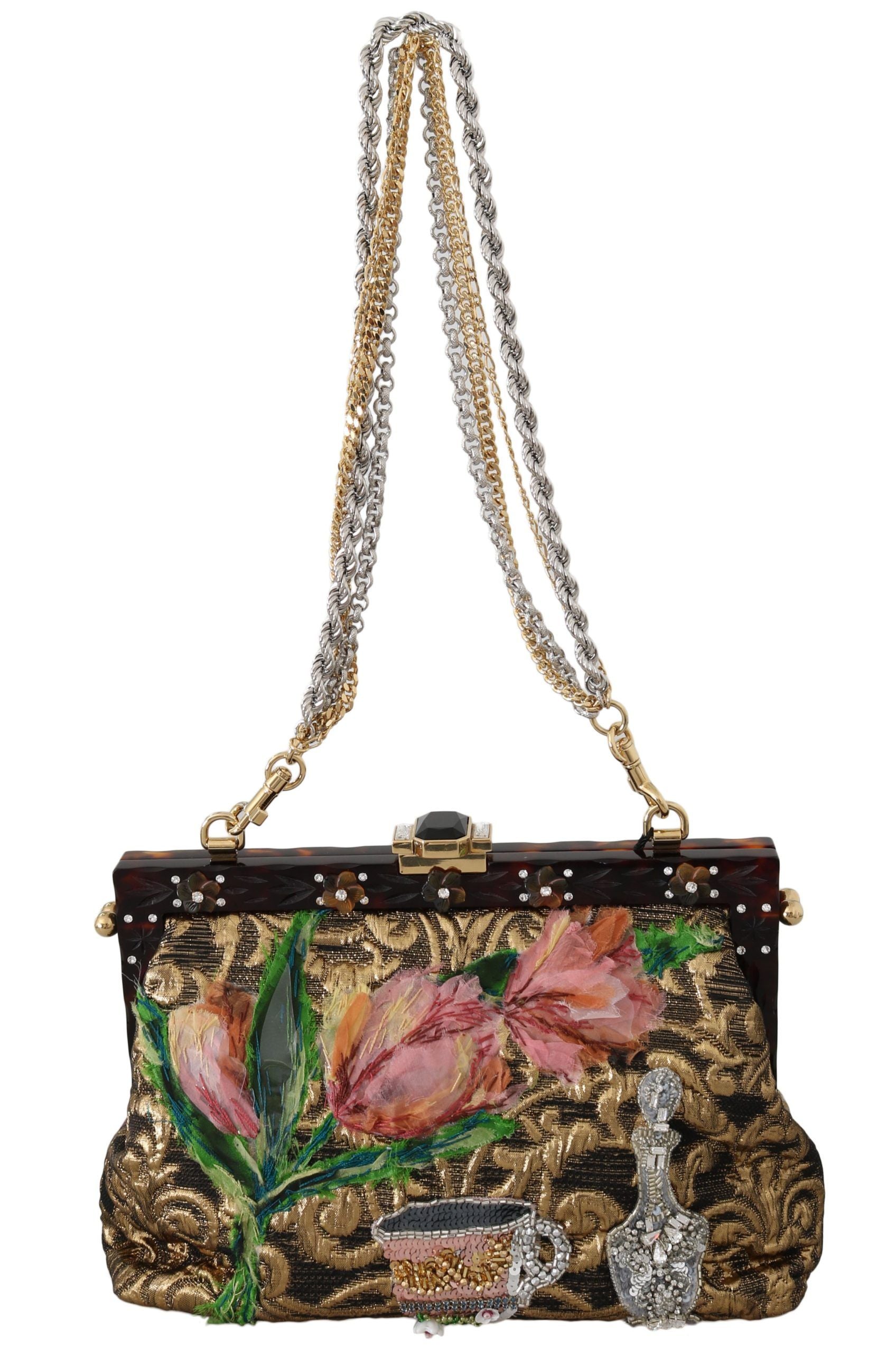 Bask in the brilliance of this exquisite Dolce & Gabbana VANDA evening bag, a symphony of luxury for your most glamorous moments. A gorgeous composition of gold multicolor silk, this clutch is accentuated with a lavish selection of silver and gold metal detailing. The bag’s enchanting aesthetic is further enriched with a vibrant multicolor crystal floral embellishment and delicate embroidery, creating a true statement piece.