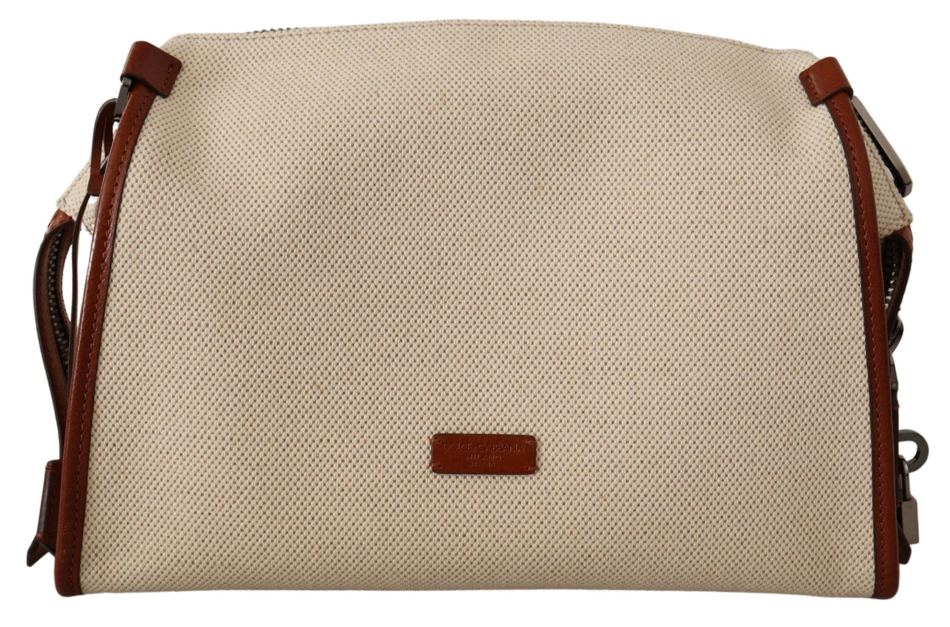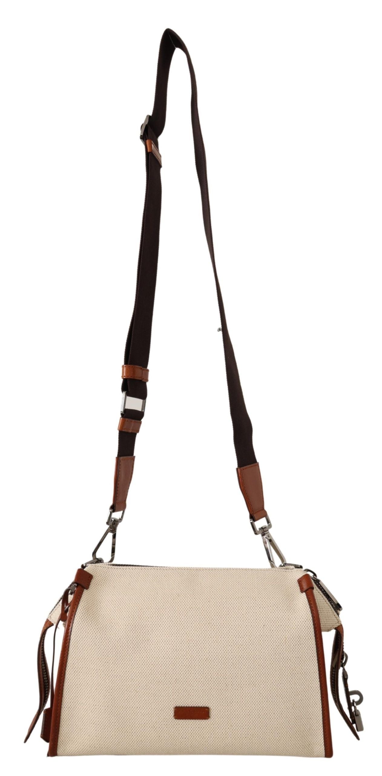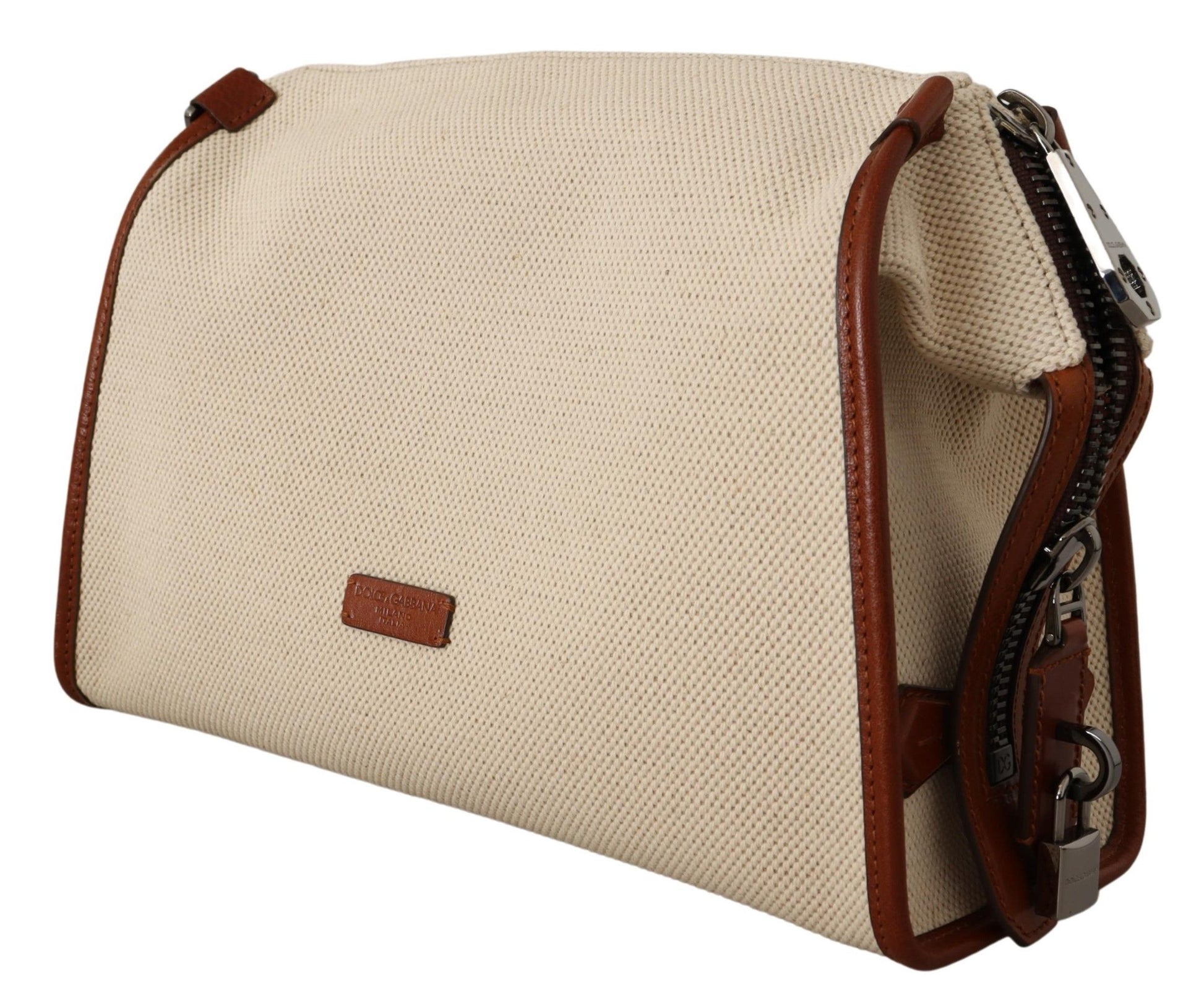 Indulge in the epitome of sophistication with this stunning beige and brown shoulder bag, a testament to the luxurious craftsmanship of Dolce & Gabbana. The eye-catching zip fastening is adorned with an elegant padlock, and the front boasts a distinctive leather logo applique that adds a signature touch to this exquisite accessory. The versatility of the detachable, adjustable shoulder strap makes it an impeccable choice for the discerning fashionista. Organize your essentials with ease thanks to the main internal compartment complemented by two slip pockets and a secure zip pocket.