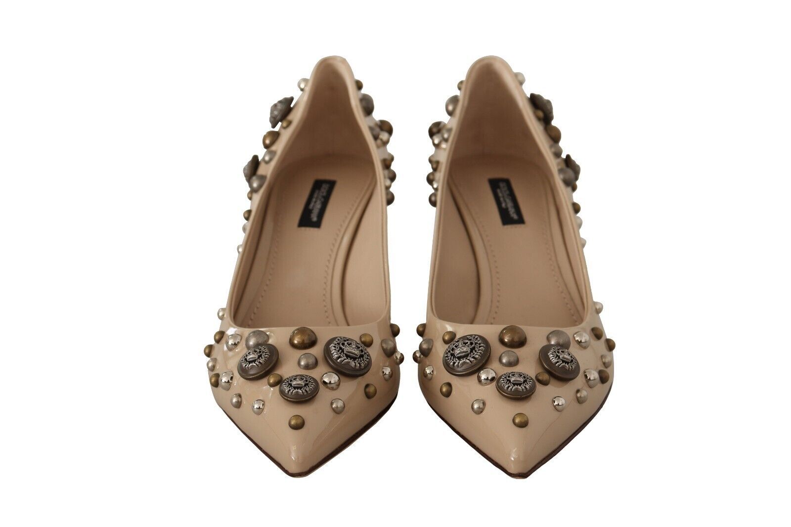 Step into luxury with these exquisite, brand new Dolce & Gabbana leather pumps. Adorned with studs and crafted with precision, these pumps feature an elegant mid kitten heel and a stylish pointed toe, perfect for adding a touch of sophistication to any outfit. The beige leather assures versatility, while the quality of Italian craftsmanship is evident in every detail.