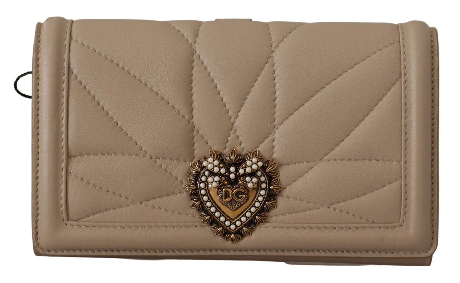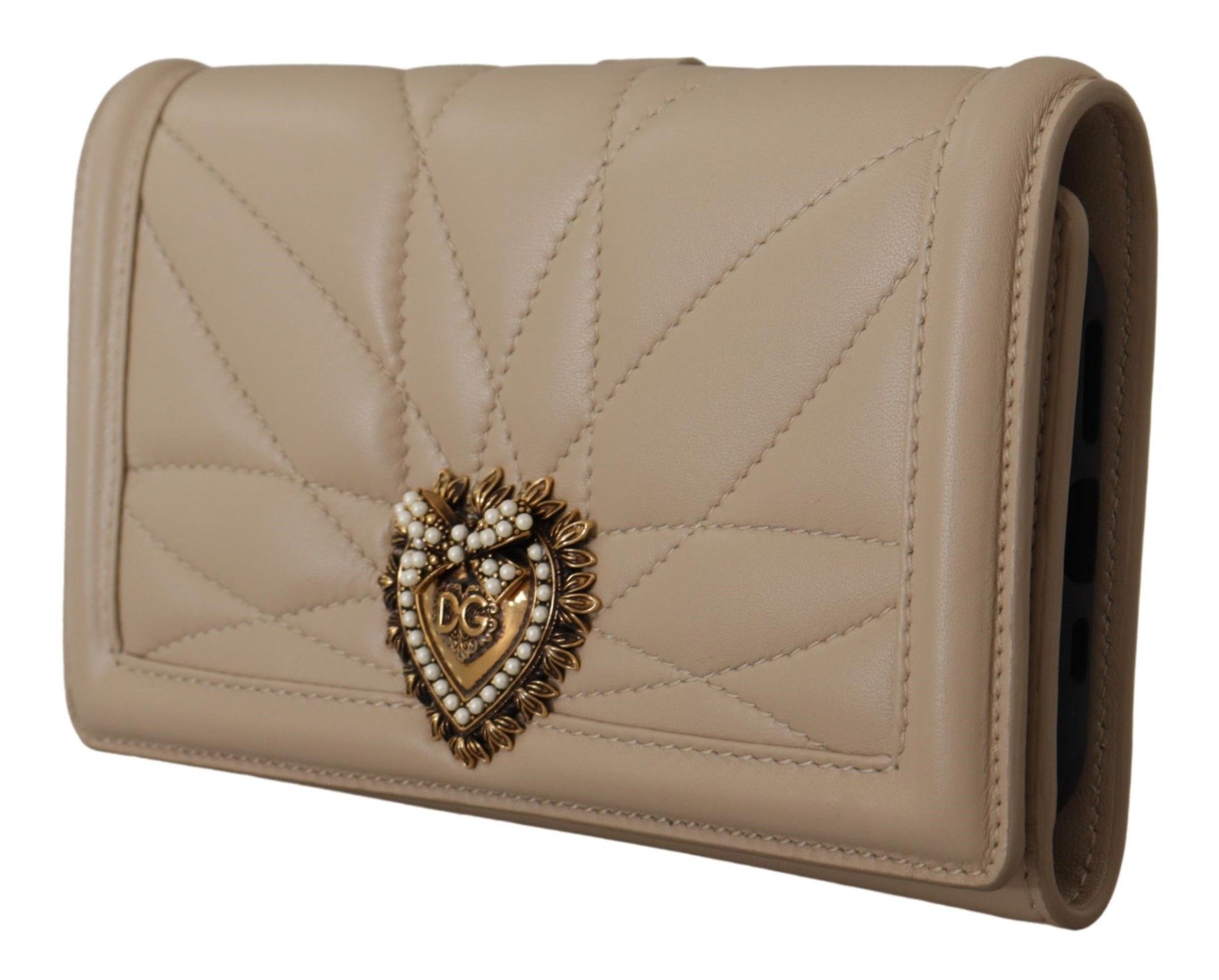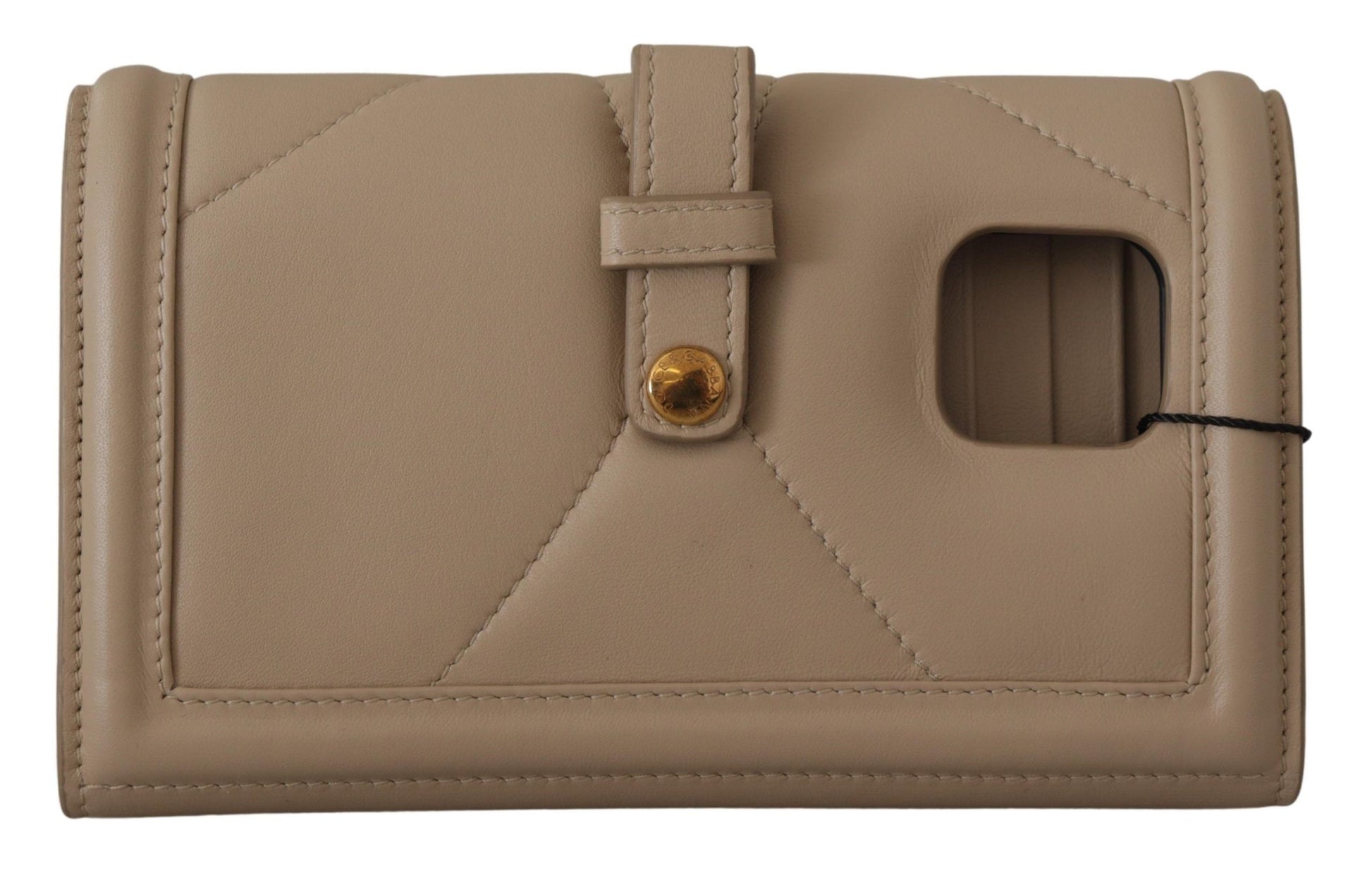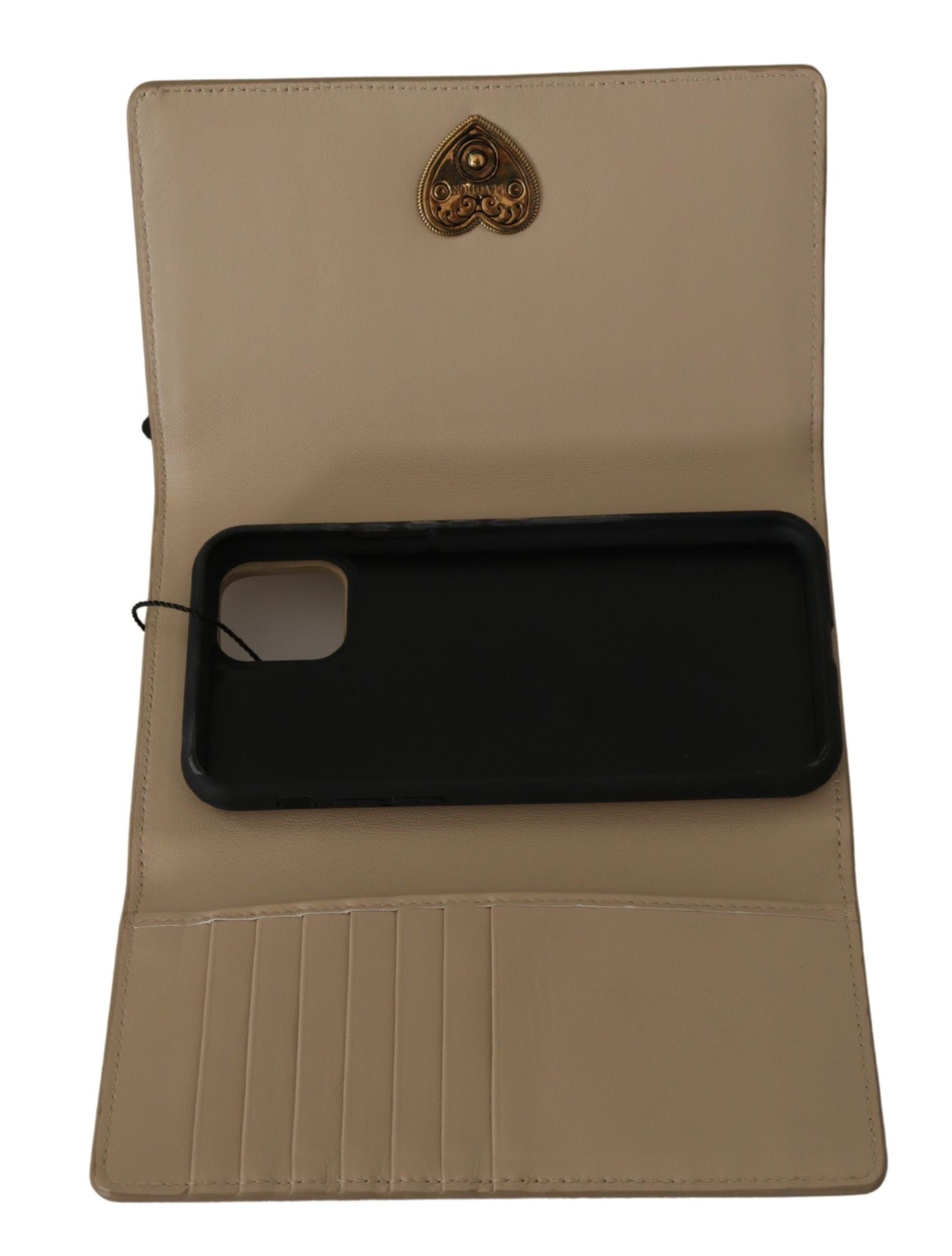 Indulge in the epitome of luxury with this stunning beige leather phone case wallet from the renowned Dolce & Gabbana collection. Designed to add a touch of elegance to your essentials, this case not only protects your iPhone 11 Pro but also serves as a wallet, complete with credit card slots and a secure button flap closure. The gold metal detailing adds an exquisite flair that’s unmistakably Dolce & Gabbana. Crafted in Italy, this accessory is both practical and chic, ensuring your style stands out in every detail.