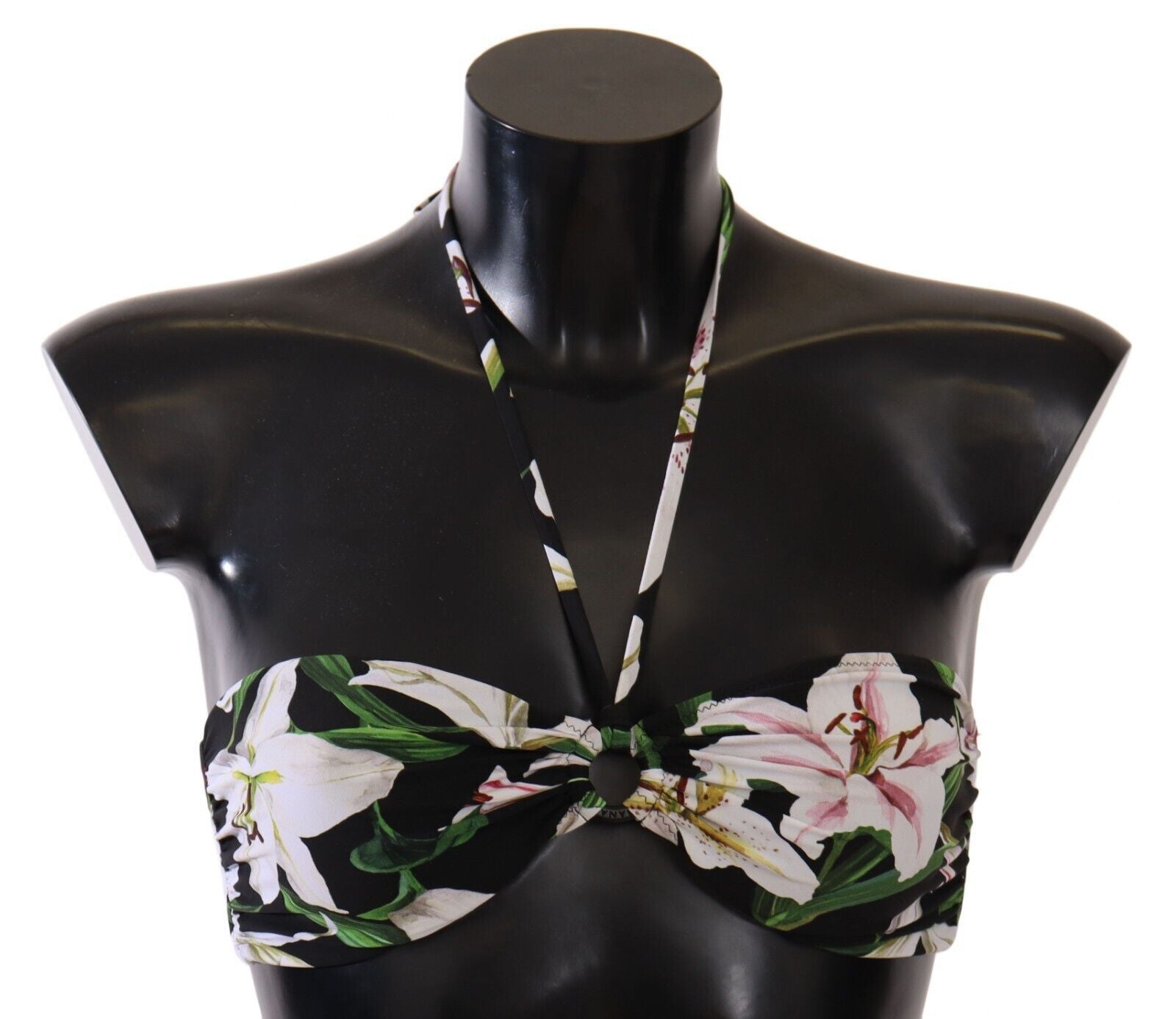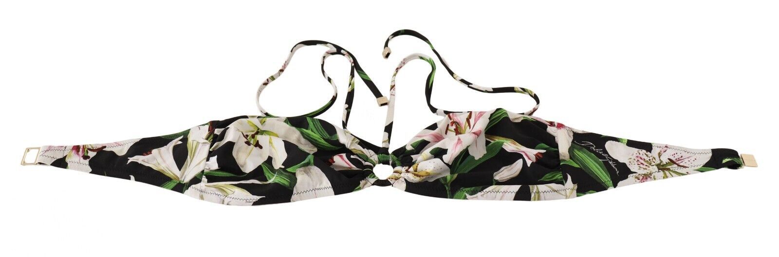 Indulge in the luxury of Dolce & Gabbana with this exquisite lilies print bikini top, brand new with tags. Crafted with a blend of high-quality materials for a comfortable and flattering fit, this piece is perfect for those who appreciate the elegance that comes with Italian design. Its eye-catching black backdrop adorned with the vibrant lilies print provides a striking look that is sure to turn heads. Not only a statement of style, but this bikini top also features the brand’s logo detailing as a mark of authenticity and luxury.