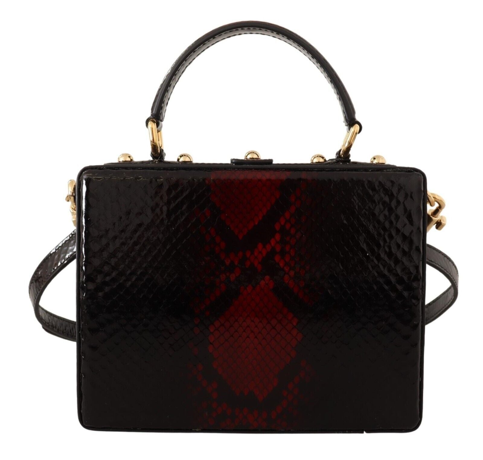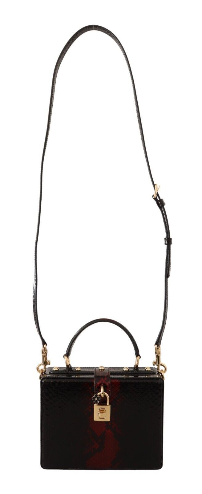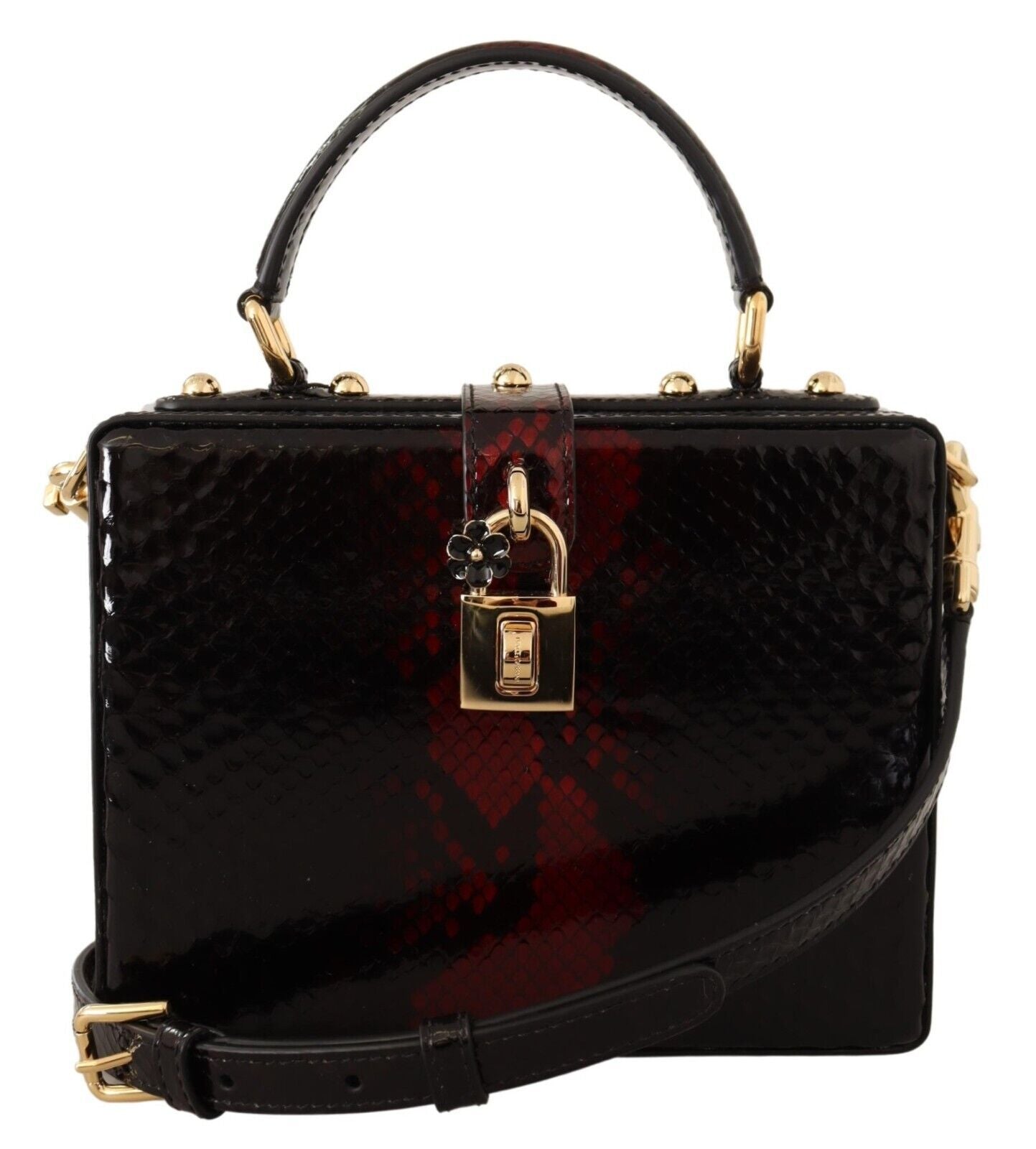 Elevate your accessory collection with this exquisite Dolce & Gabbana box shoulder bag. A perfect blend of elegance and luxury, this handbag features a striking black and bordeaux color combination, complemented by lustrous gold metal detailing. Crafted from the finest leather with exotic skin python accents, the bag opens to a sophisticated black leather interior. Its compact dimensions make it an ideal companion for both day-to-day wear and special occasions. The adjustable and detachable shoulder strap provides various styling options, while the secure twist padlock closure keeps your essentials safe. An iconic piece made in Italy, it exudes fashion-forward sophistication.