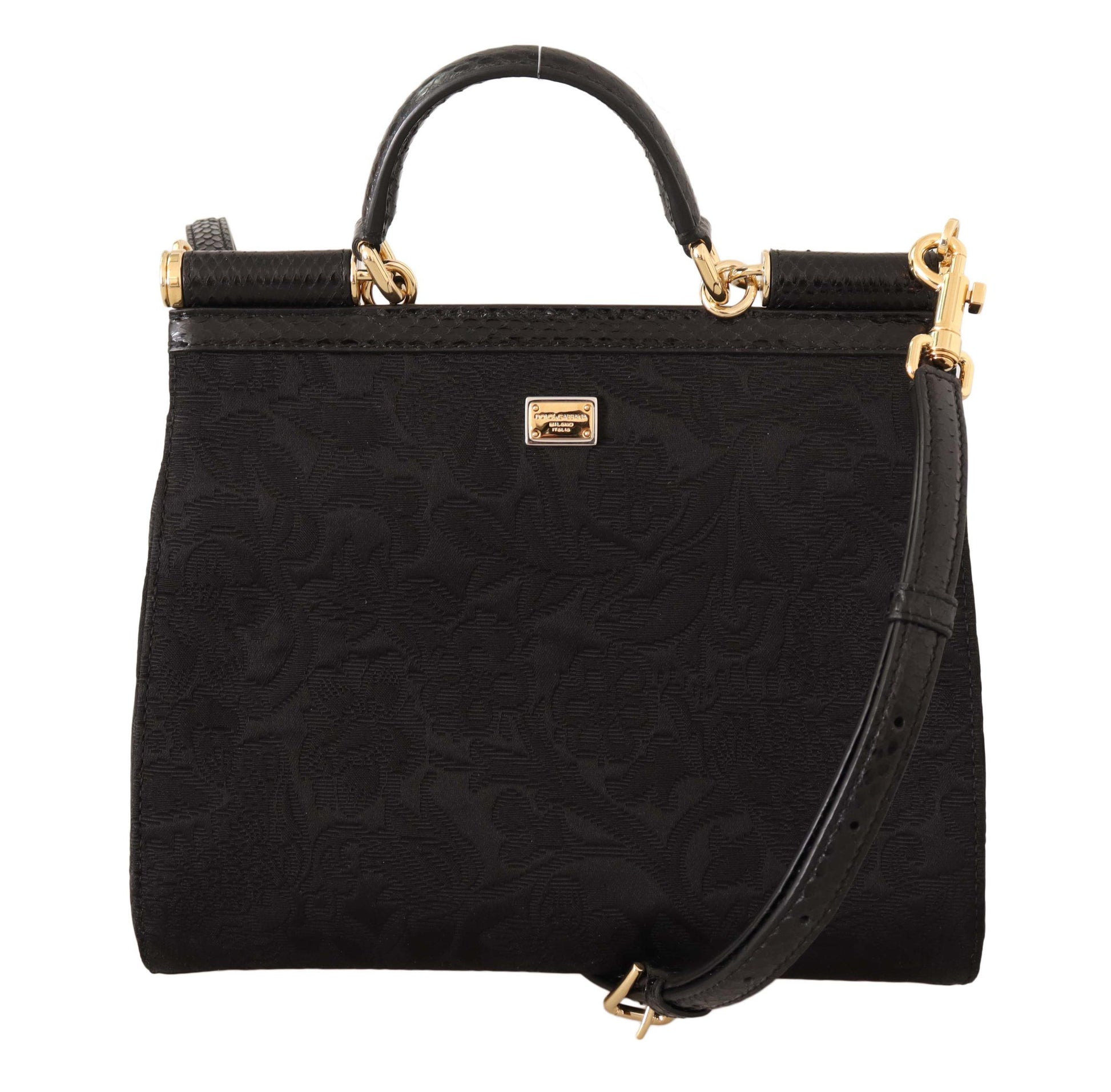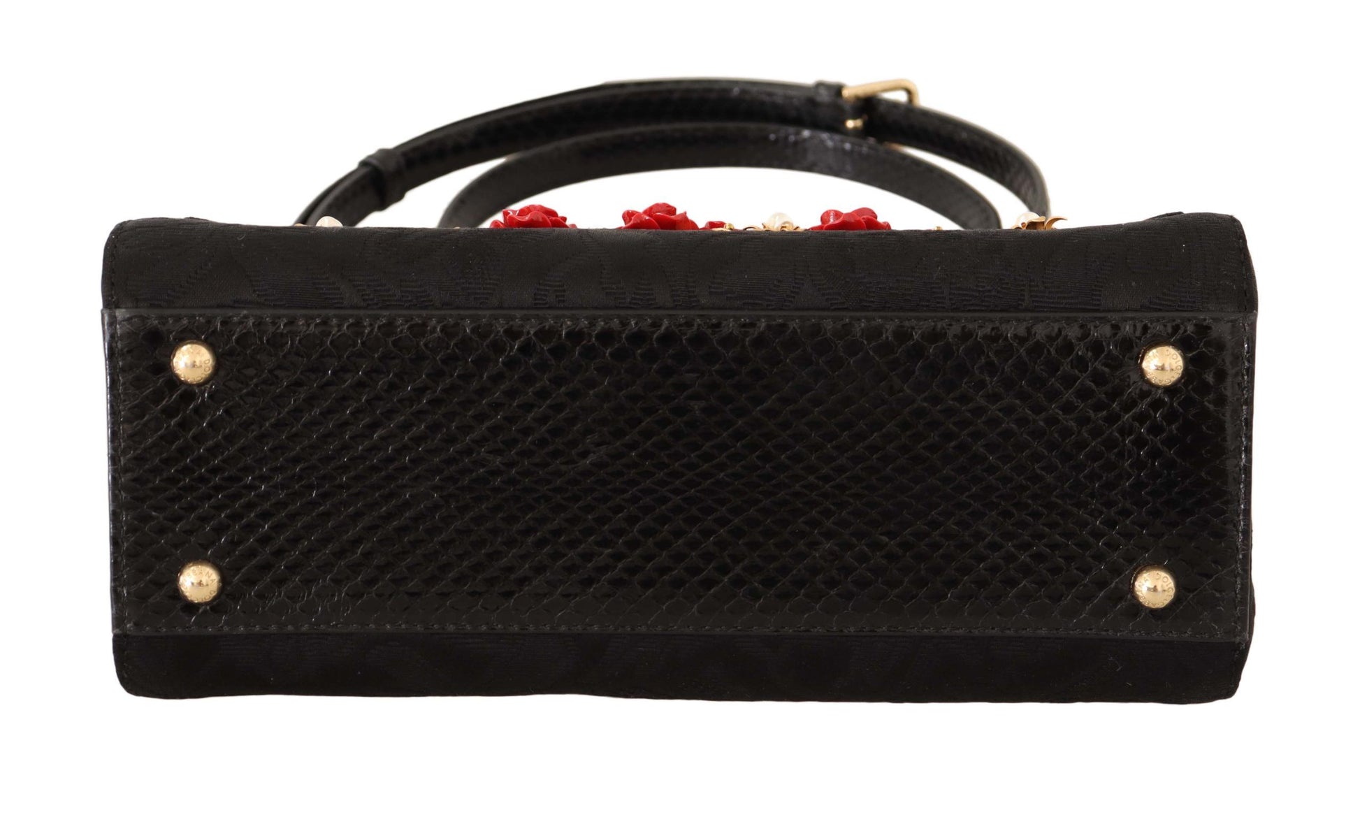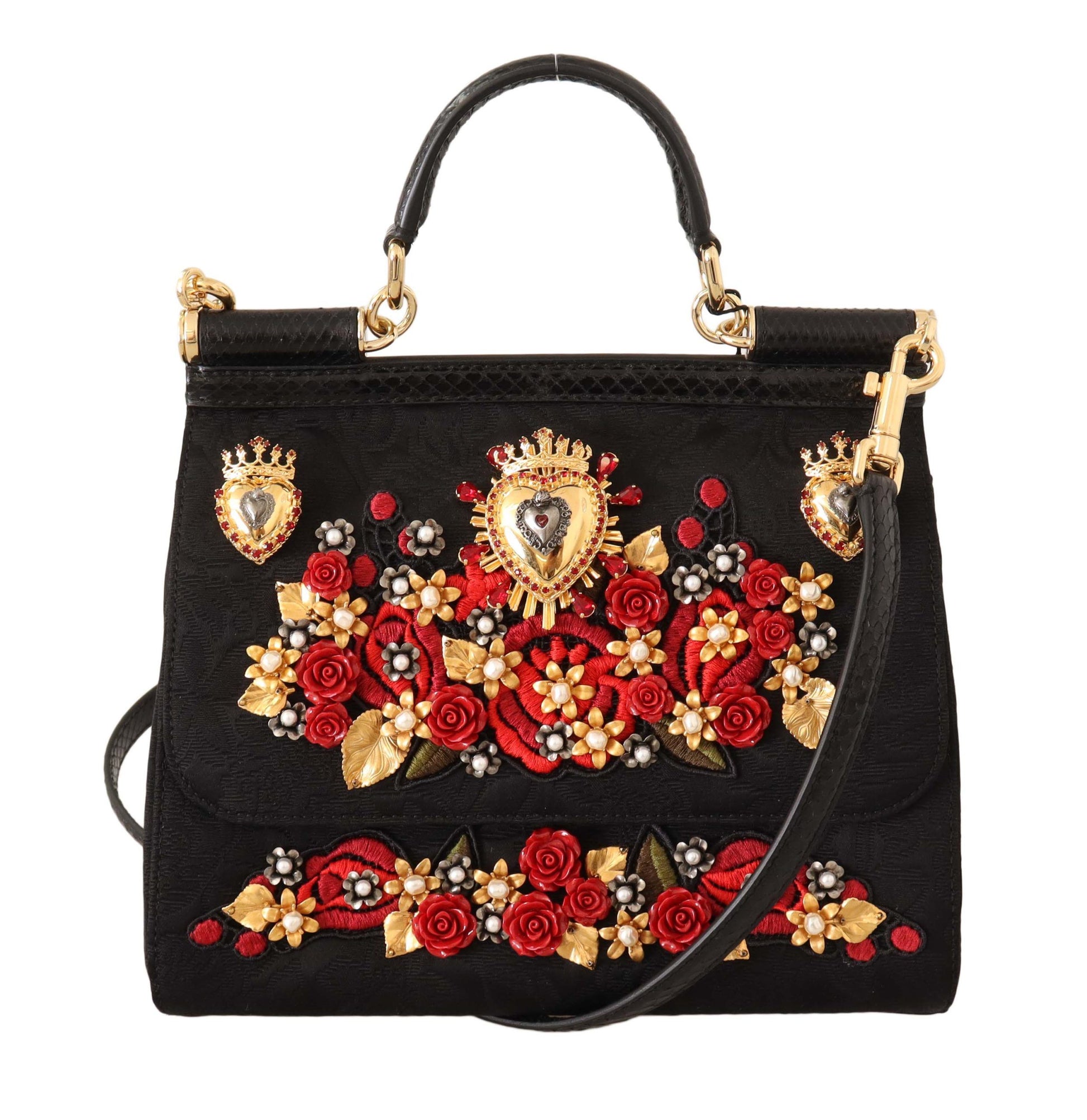 Unveiling timeless elegance with this Dolce & Gabbana Sicily shoulder bag. A statement blend of luxe brocade and exquisite snakeskin leather, adorned with vibrant red roses against a classic black backdrop. This medium-sized Sicily Bag accents your ensemble with its gold metal detailing, while its magnetic closure ensures your treasures are securely stored. A perfect fusion of Italian craftsmanship and high-end fashion, this shoulder bag exudes exclusivity and sophisticated style.