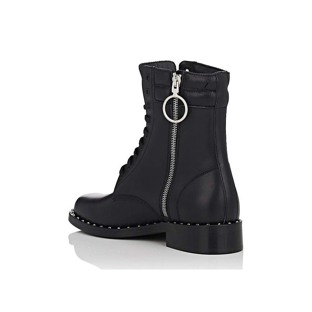 Step out in style with these edgy black calfskin lace-up ankle boots. Perfectly blending luxury with a touch of rebellion, these boots feature a convenient side zip opening and a bold rubber sole accentuated with small, decorative studs along the edge. Crafted with precision and care in Italy, they embody the unique design aesthetic Off-White is renowned for.