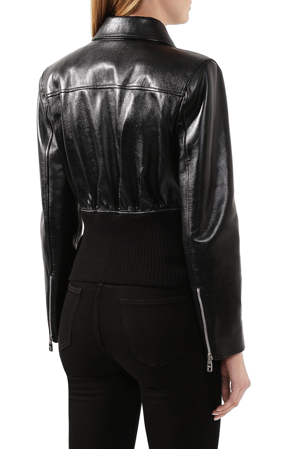 Indulge in the embodiment of sophistication with Dolce & Gabbana’s expertly crafted calfskin jacket—a sartorial statement for those who covet high-end fashion. Designed for the modern woman, this Italian-made piece features an elegantly asymmetrical zip closure, complemented by sleek oblique zipped front pockets. The silhouette radiates a chic, tight fit, accentuating your form with an air of boldness. Exude confidence and luxury in a jacket that’s as timeless as it is trendy.