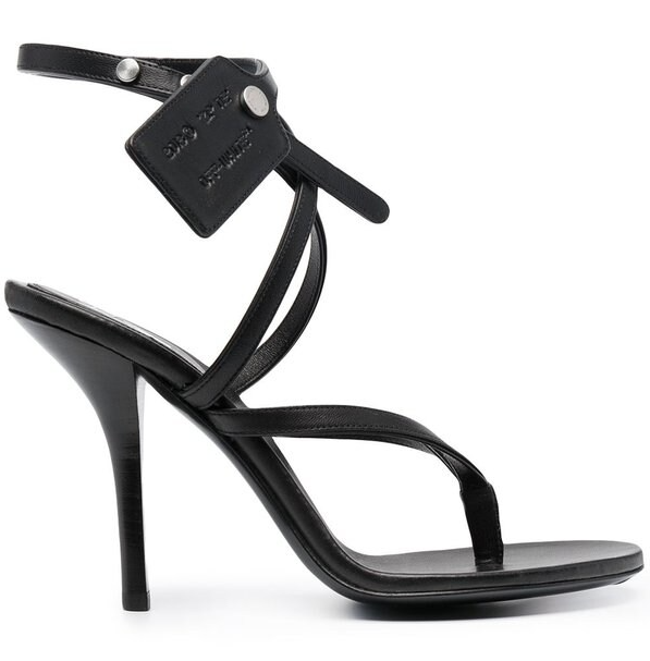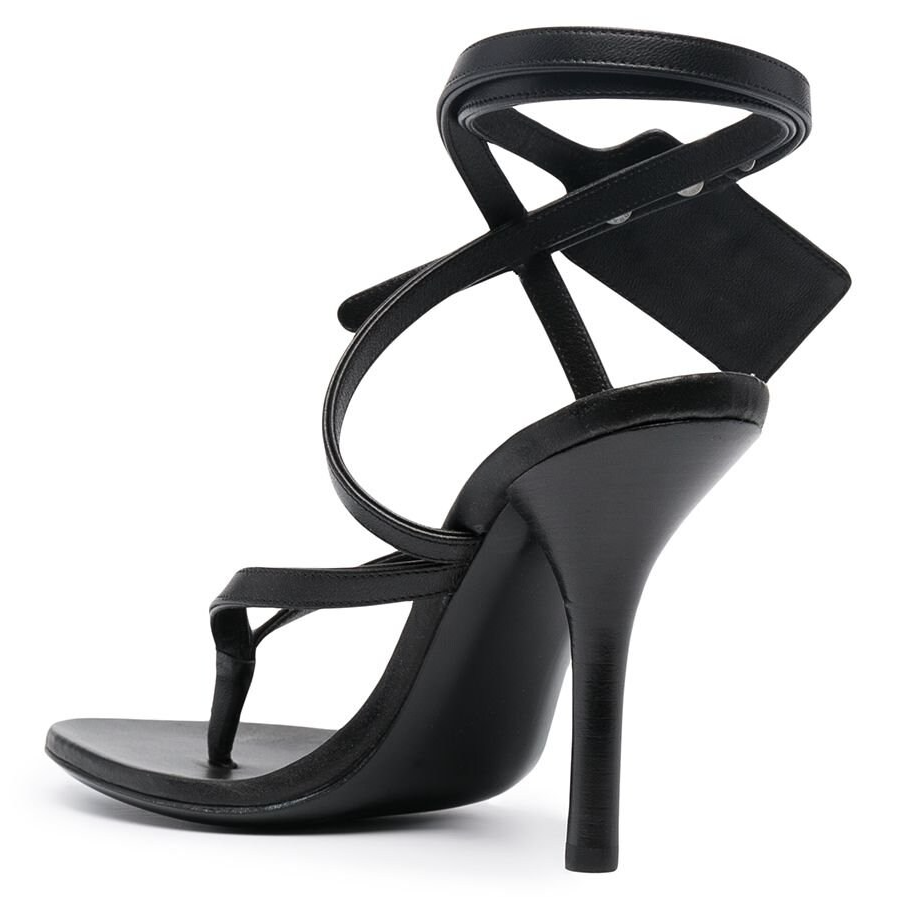 Step into luxury with these exquisite calf leather sandals, designed to elevate your style with a signature high-heel elegance. The notable Zip Tie logo plate adds a touch of unique branding, while the chic toe band and open-toe silhouette showcase your impeccable taste. Anchored by a sophisticated stiletto heel, adorned with a subtle logo print, these sandals are a testament to Italian craftsmanship and haute couture allure.
