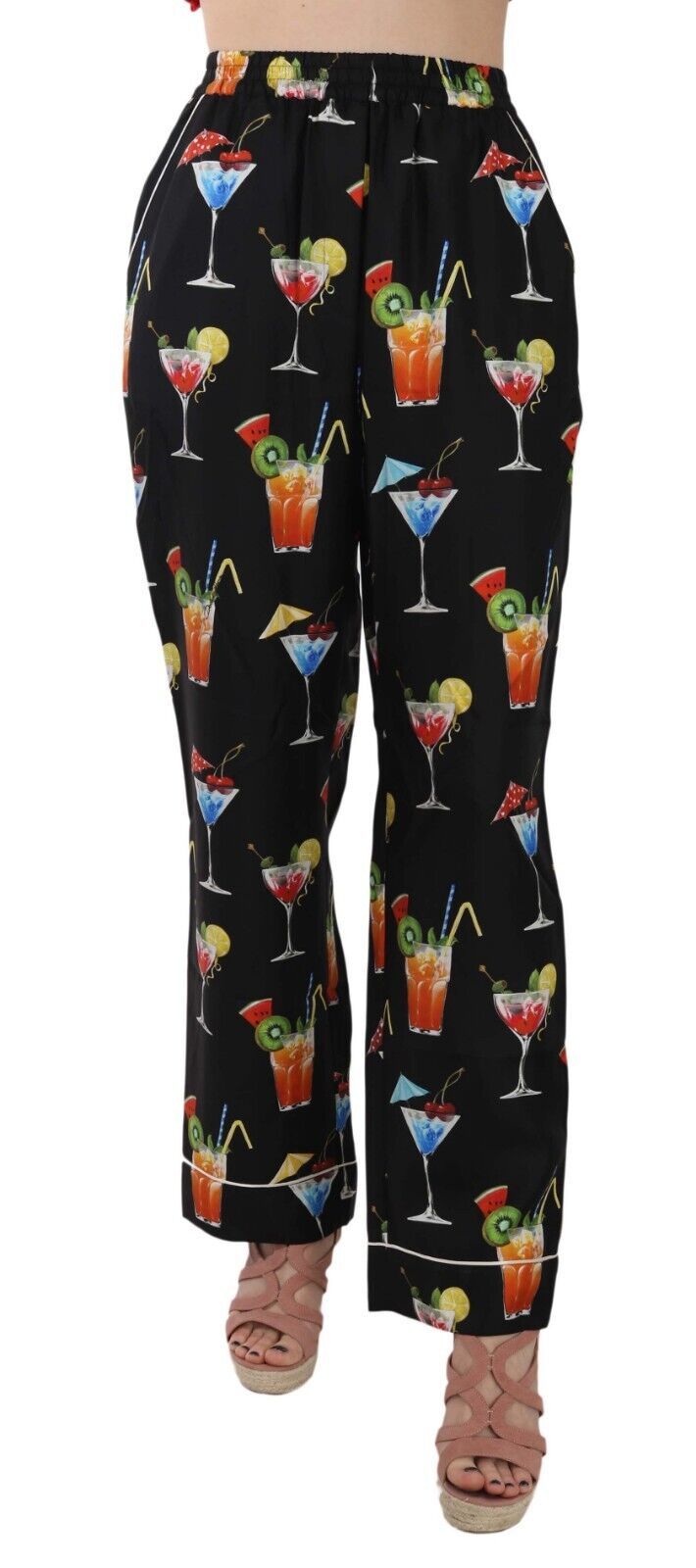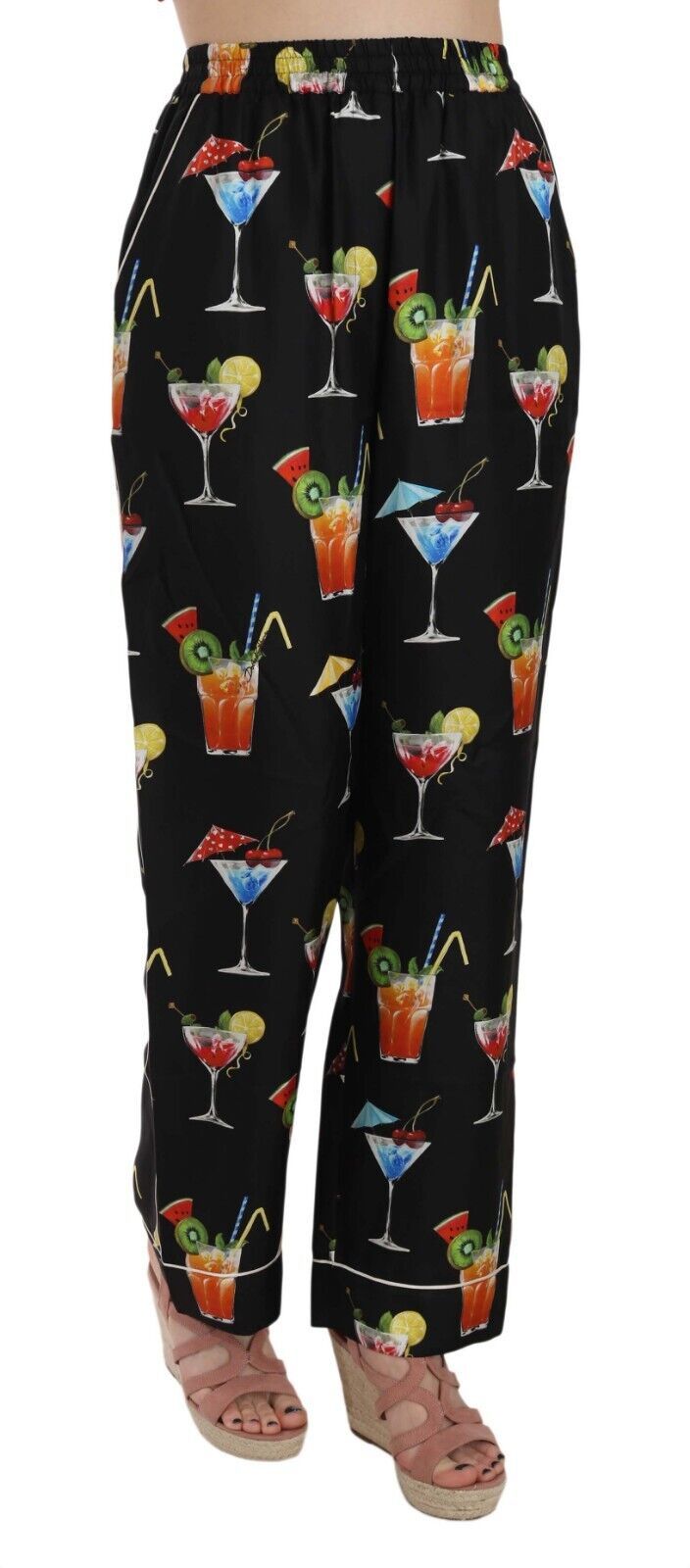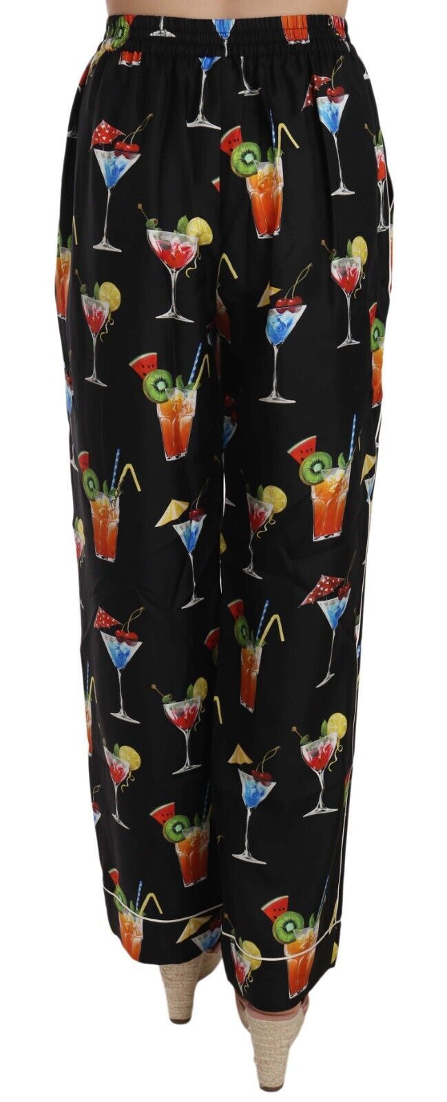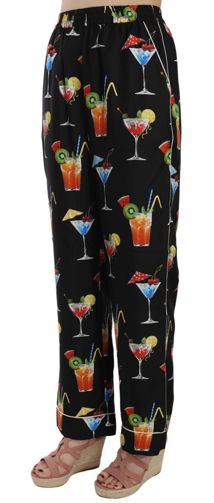 Indulge in the opulence of Dolce & Gabbana with these gorgeous new black lounge pants adorned with a vibrant cocktail print. Crafted from the finest 100% silk, these pants offer an effortlessly chic relaxed silhouette, secured with an elasticated waist for superior comfort. Detailed with white piped trims, they epitomize luxury leisurewear. Perfect for adding a splash of fun to your elegant wardrobe.