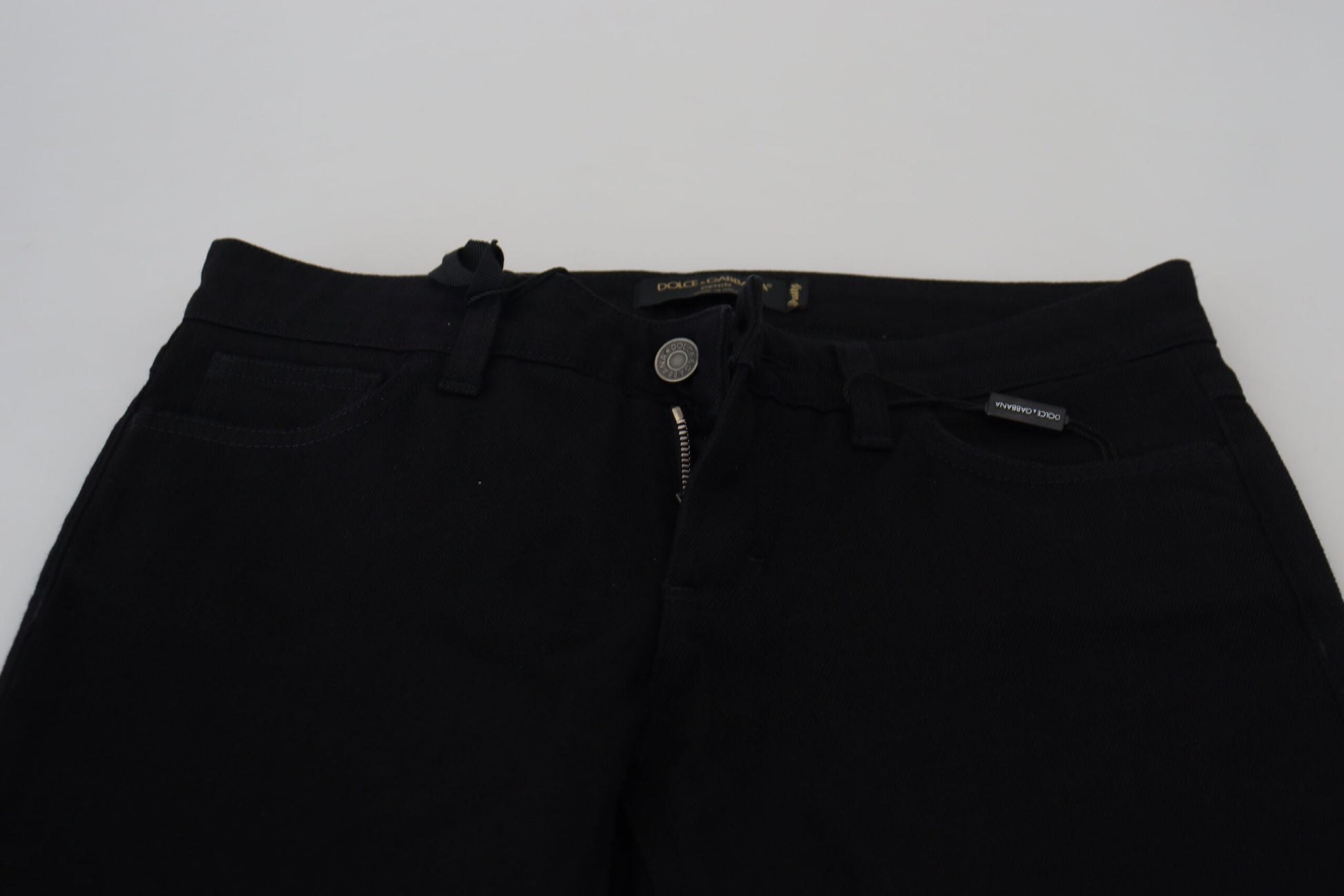 Indulge in the epitome of Italian craftsmanship with these striking slim fit jeans, brought to you by the prestigious Dolce & Gabbana. These jeans are more than just a garment; they’re a statement of style and a testament to luxury. Designed to be a perfect fusion of fashion and comfort, they are made from a high-quality blend of cotton and elastane for that snug, flexible fit that flatters your silhouette. Their sleek black color ensures they are versatile enough to be dressed up or down for any occasion. These premium jeans feature a classic zipper and button closure, as well as practical front and back pockets, all embellished with the discreet yet distinguishable Dolce & Gabbana logo details. Experience true Italian elegance, with these jeans that are sure to be a treasured addition to any wardrobe.