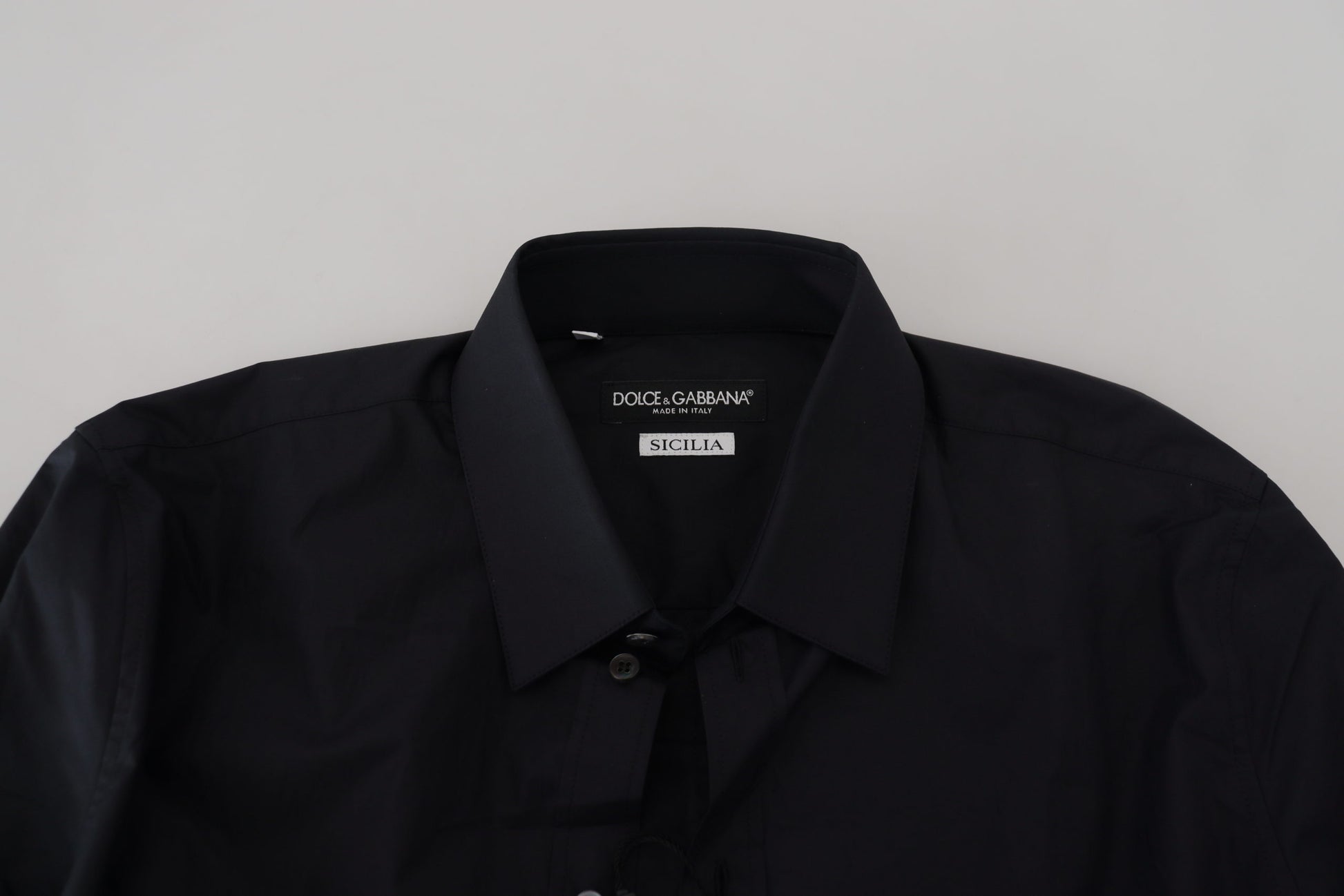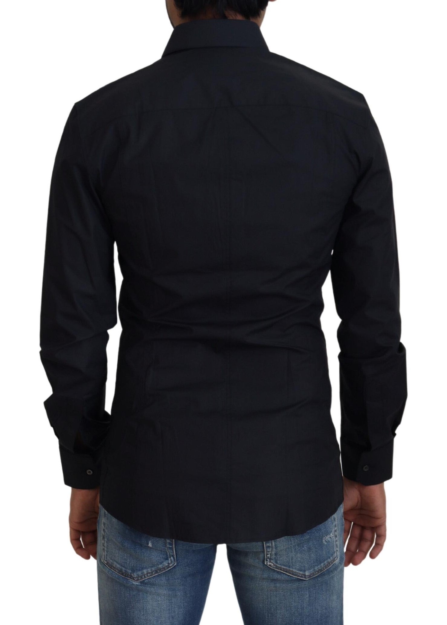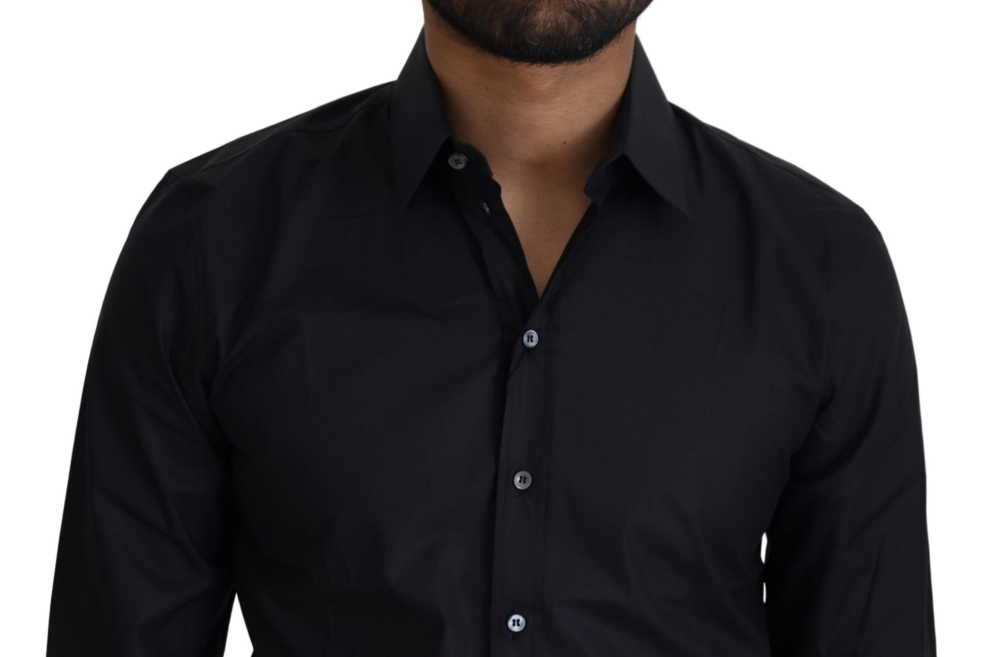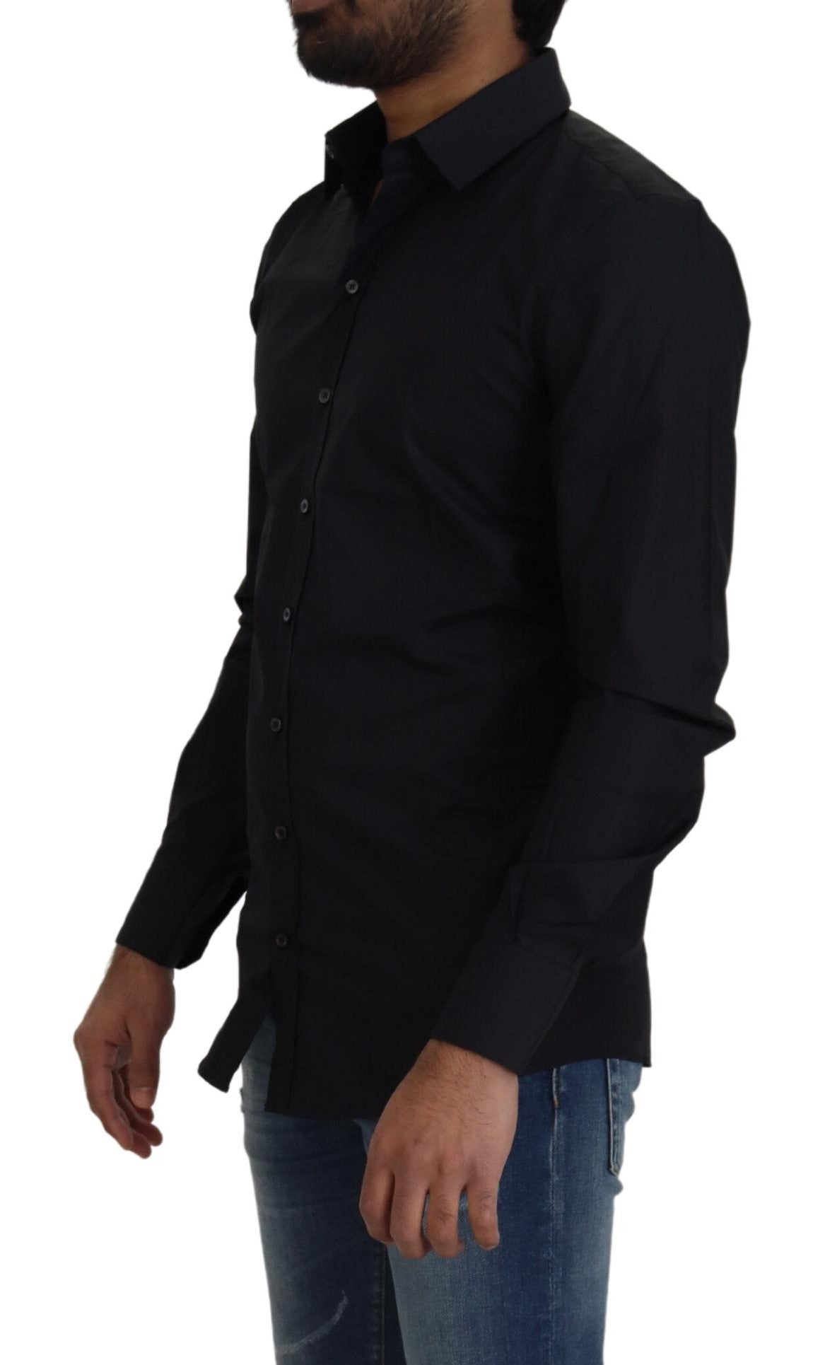 Embrace the essence of Italian elegance with this stunning Dolce & Gabbana dress shirt. Boasting a slim fit silhouette that offers a sleek and polished look, this shirt is an absolute must-have for the discerning gentleman. Made from a luxurious blend of cotton and elastane, it provides both supreme comfort and a touch of stretch for the perfect fit. This shirt features a classic collar, long sleeves, and a sharp front button closure, all enveloped in a timeless black hue that exudes sophistication.