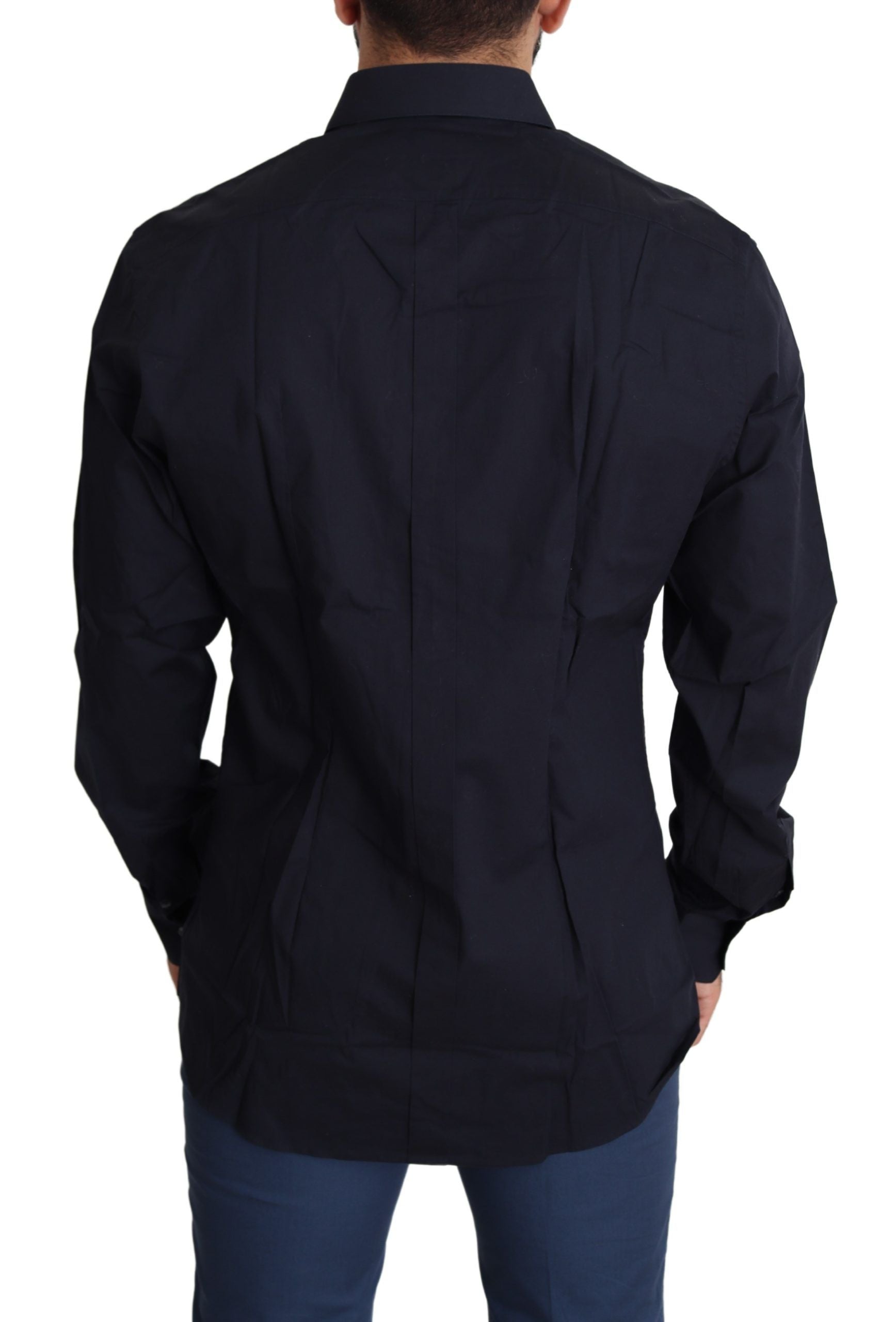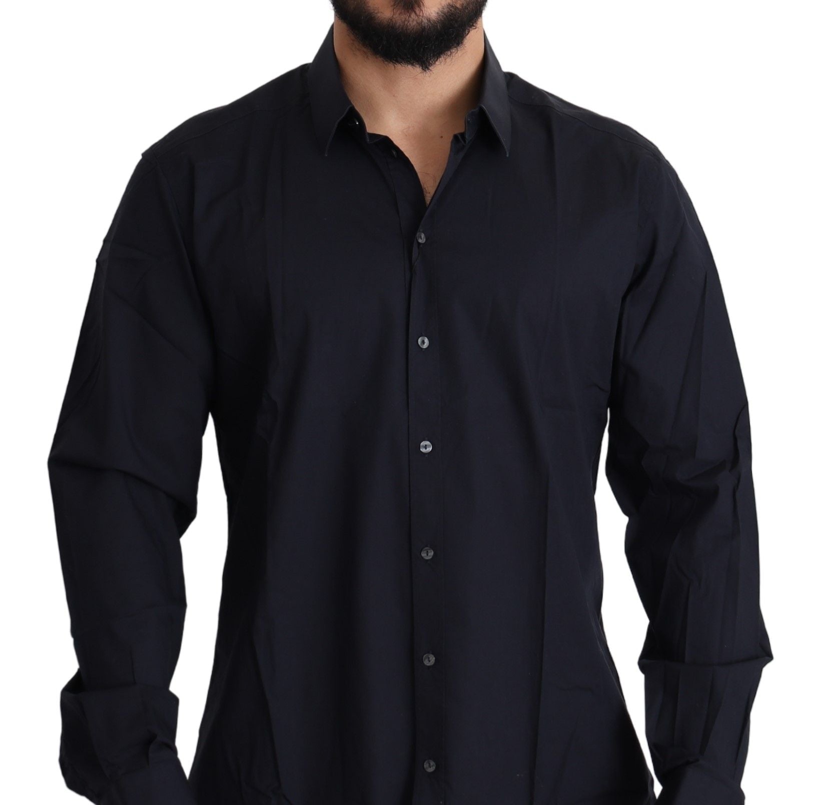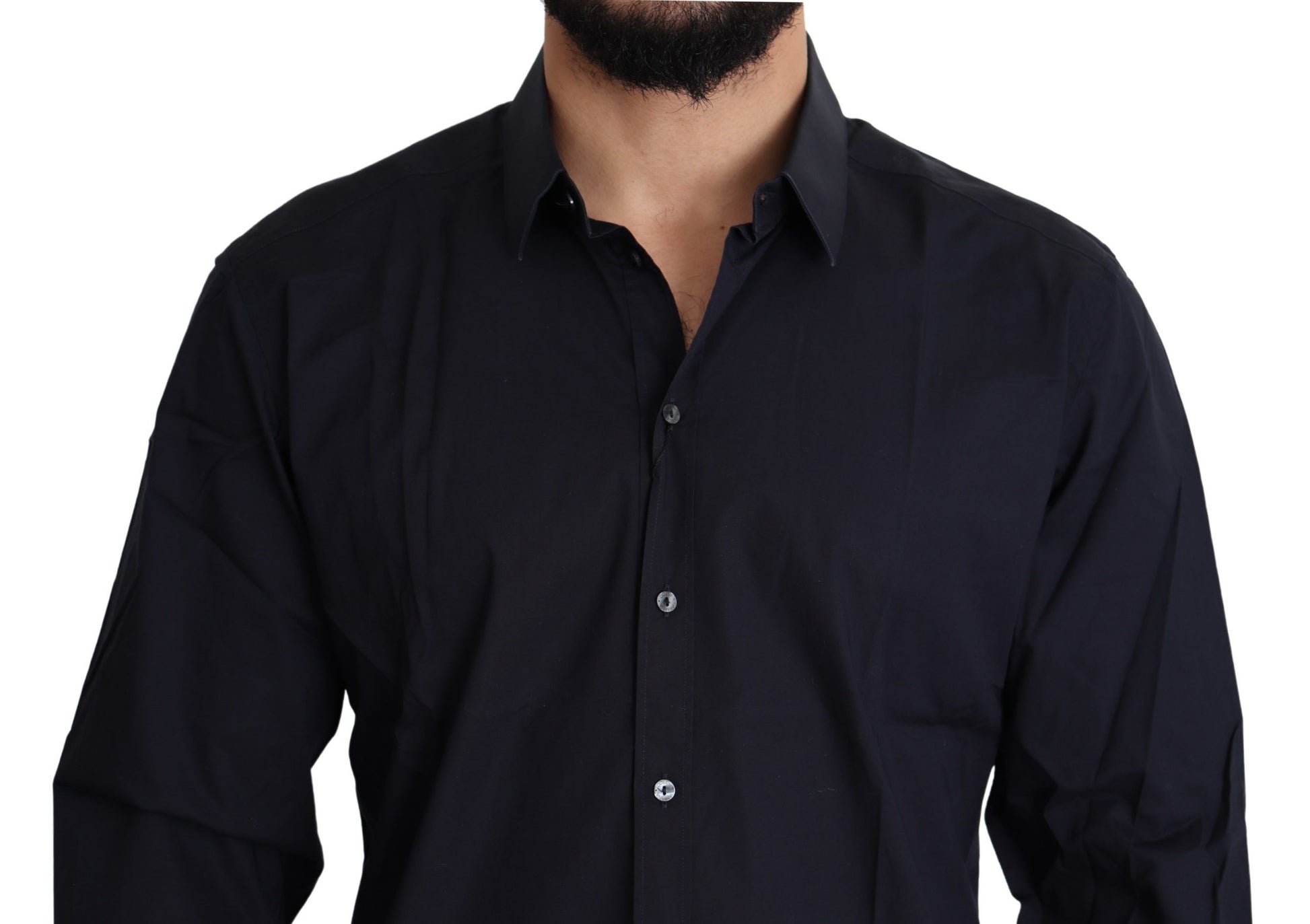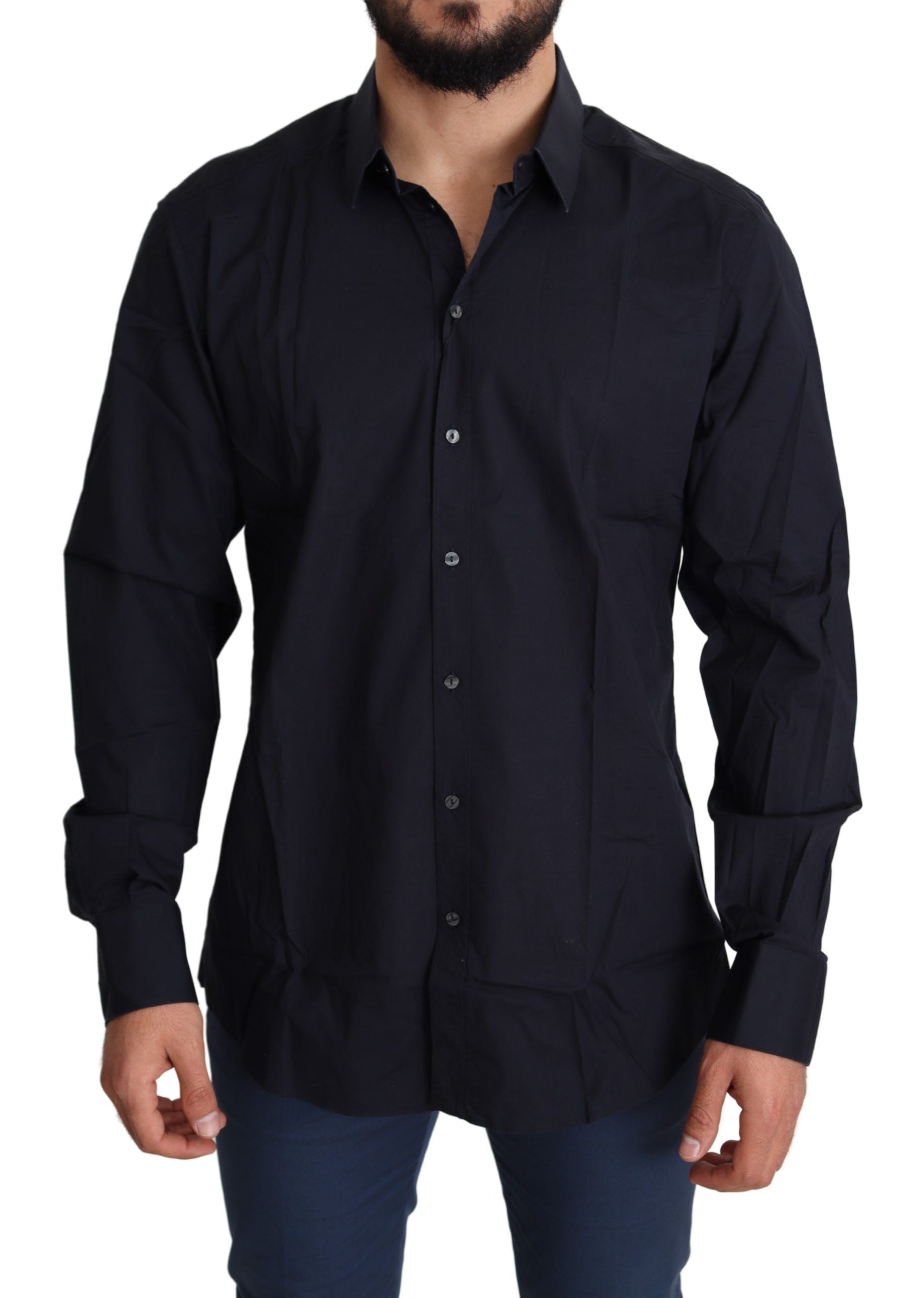 Indulge in the epitome of sophistication with this stunning, 100% Authentic Dolce & Gabbana black dress shirt. Perfectly tailored for a slim fit, this luxurious piece is crafted from a soft and comfortable blend of cotton and elastane, allowing for a slight stretch. Its sleek design is completed with a spread collar, one-button barrel cuffs, and a full button front closure, ensuring a sharp and polished look for any formal occasion. Carefully constructed in Italy, this shirt echoes refinement and designer craftsmanship.