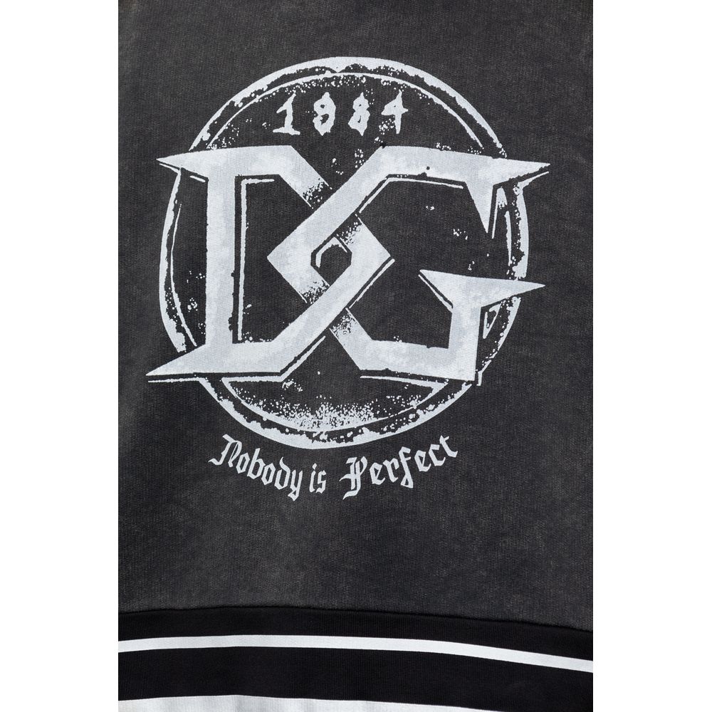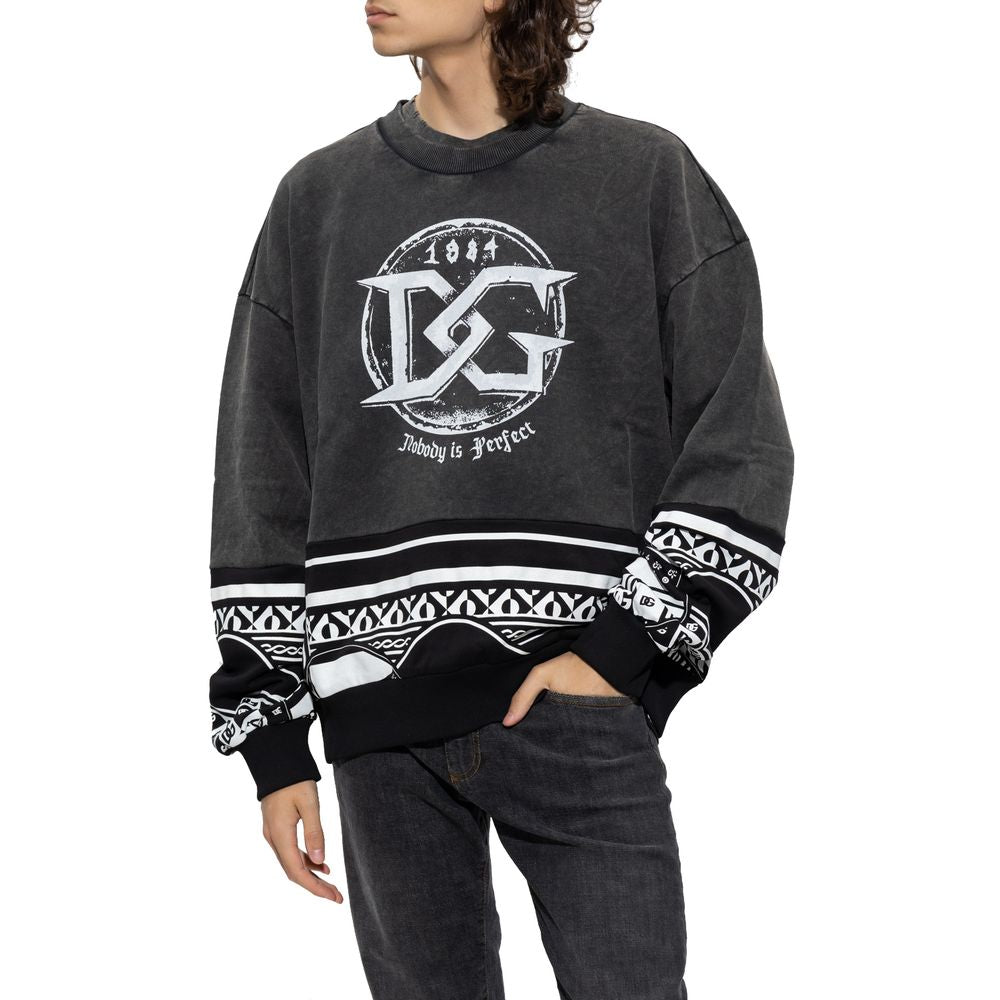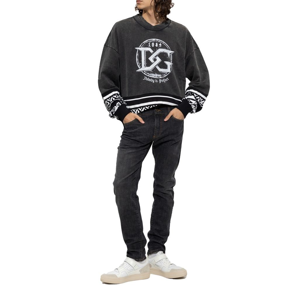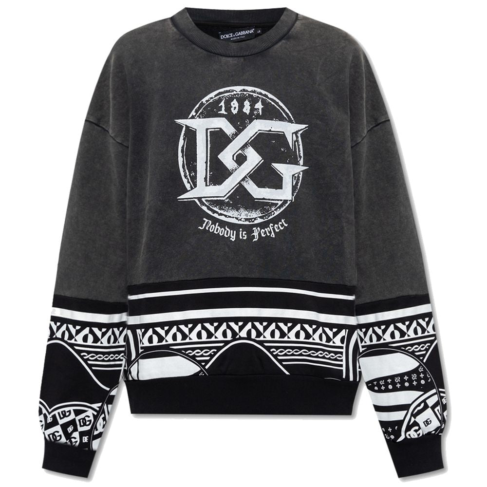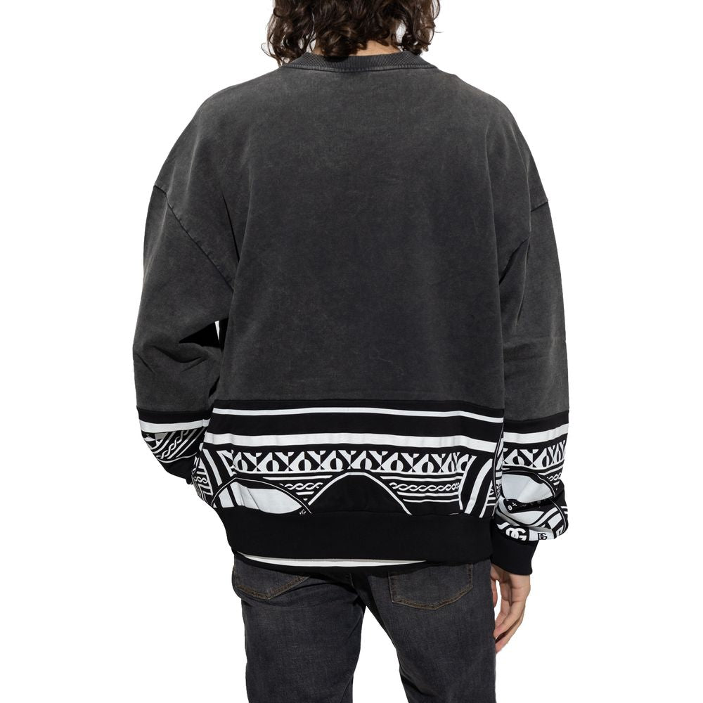 Dolce & Gabbana crewneck sweatshirt in black cotton slightly washed out on top, front DG logo print in white and geometric pattern print on bottom and sleeves