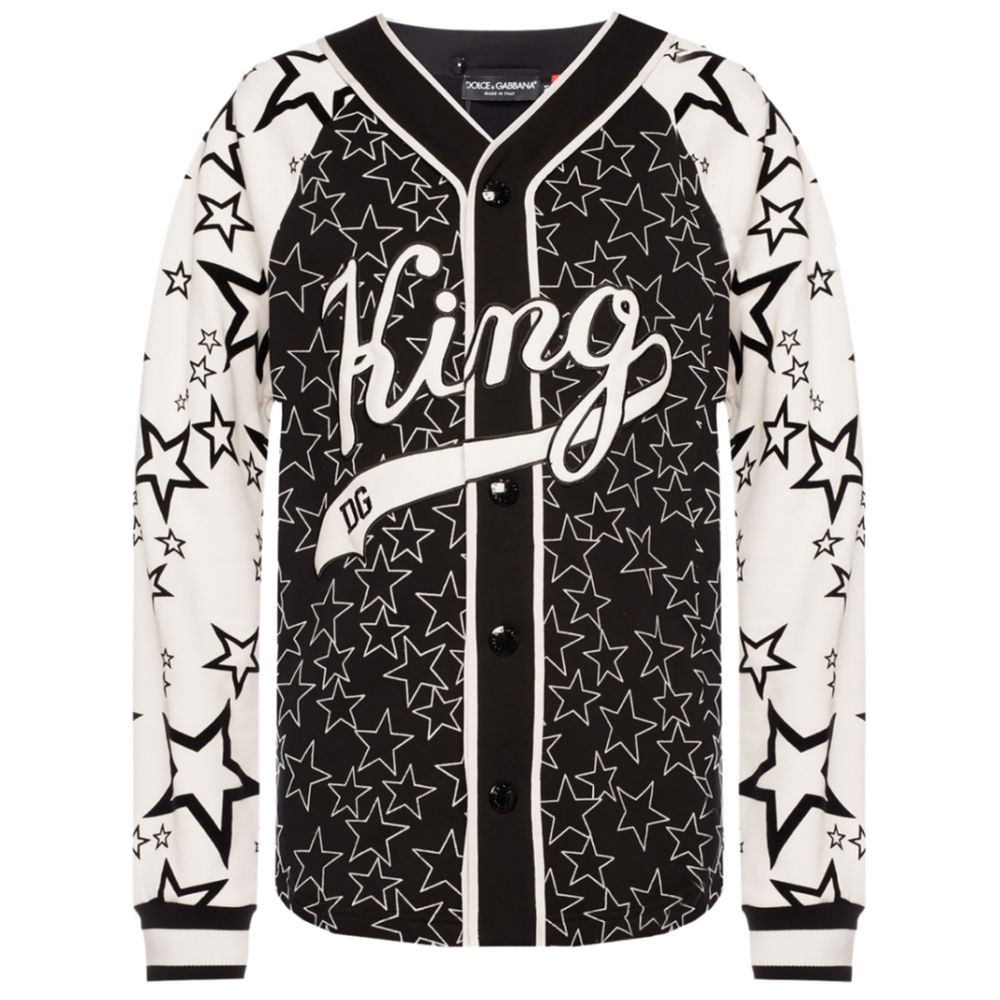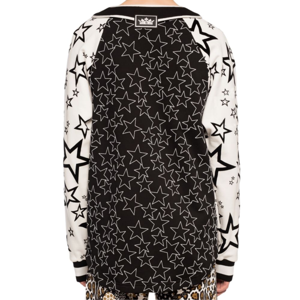Dolce & Gabbana cotton cardigan sweatshirt with V-neck and button closure, central King embroidery and velvet star print all over the surface, ribbed cuffs