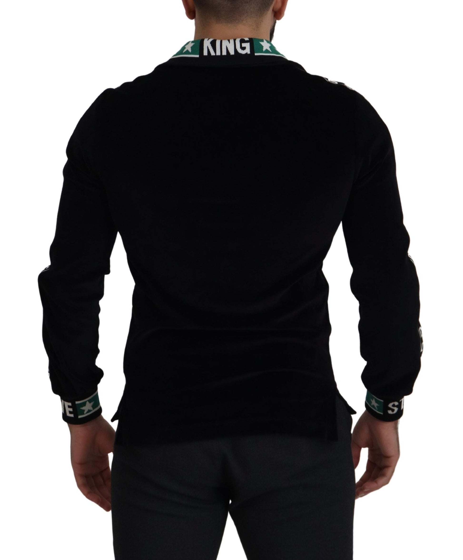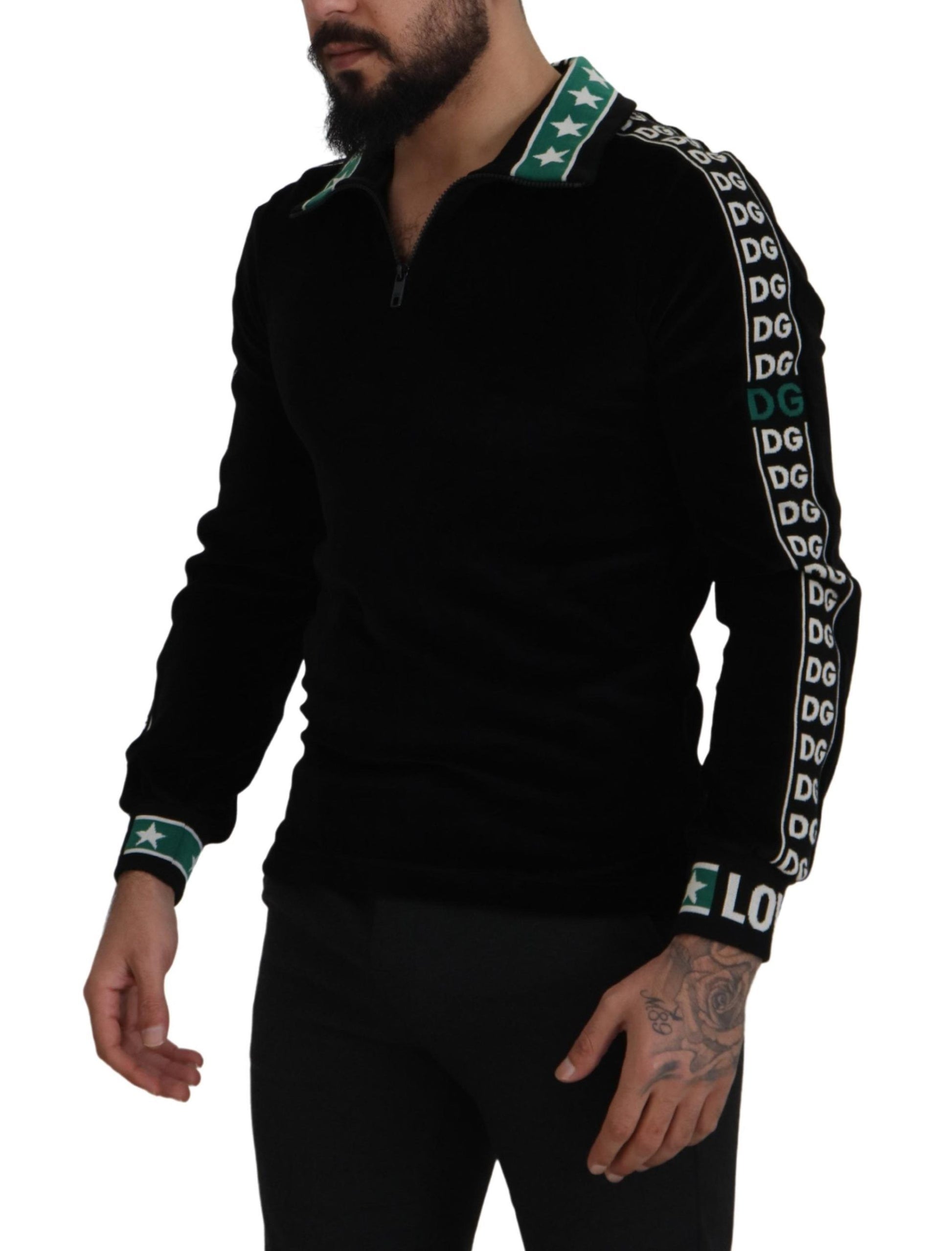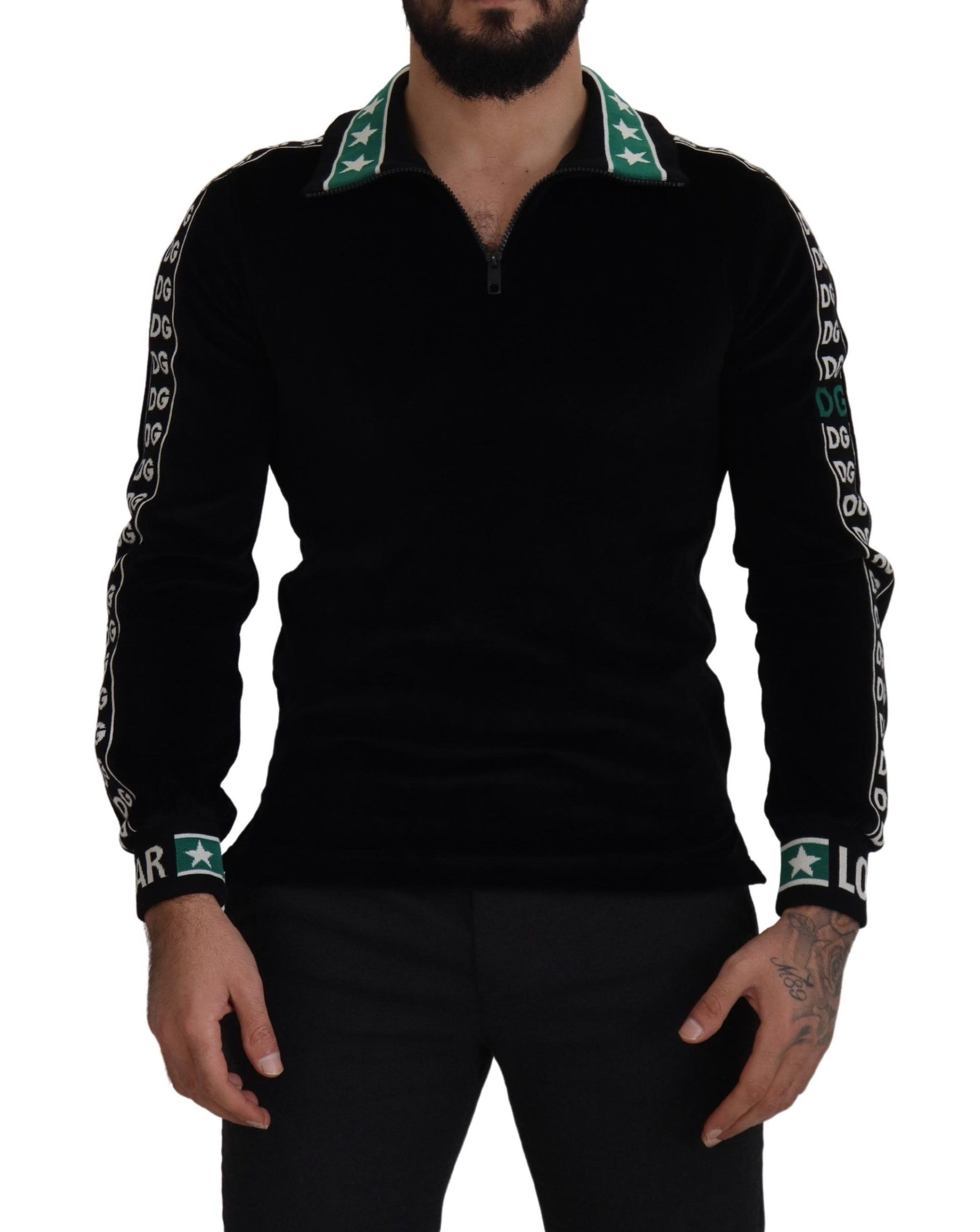 Indulge in the epitome of luxury with this stunning Dolce & Gabbana Black velvet sweatshirt. This garment boasts impeccable craftsmanship, utilizing a plush cotton-velvet blend that promises both comfort and elegance. The sweater is adorned with jacquard ribbons featuring a unique white and green monogram, harmoniously paired with star motifs and inscriptions on the cuffs, creating a truly exclusive piece. Crafted by the finest Italian artisans, this pullover polo sweater is a testament to sophisticated tailoring and chic style. Elevate your wardrobe with this exquisite item that reflects your unparalleled taste for premium fashion.