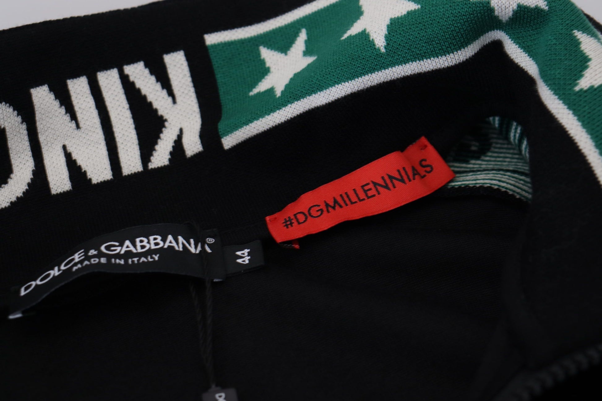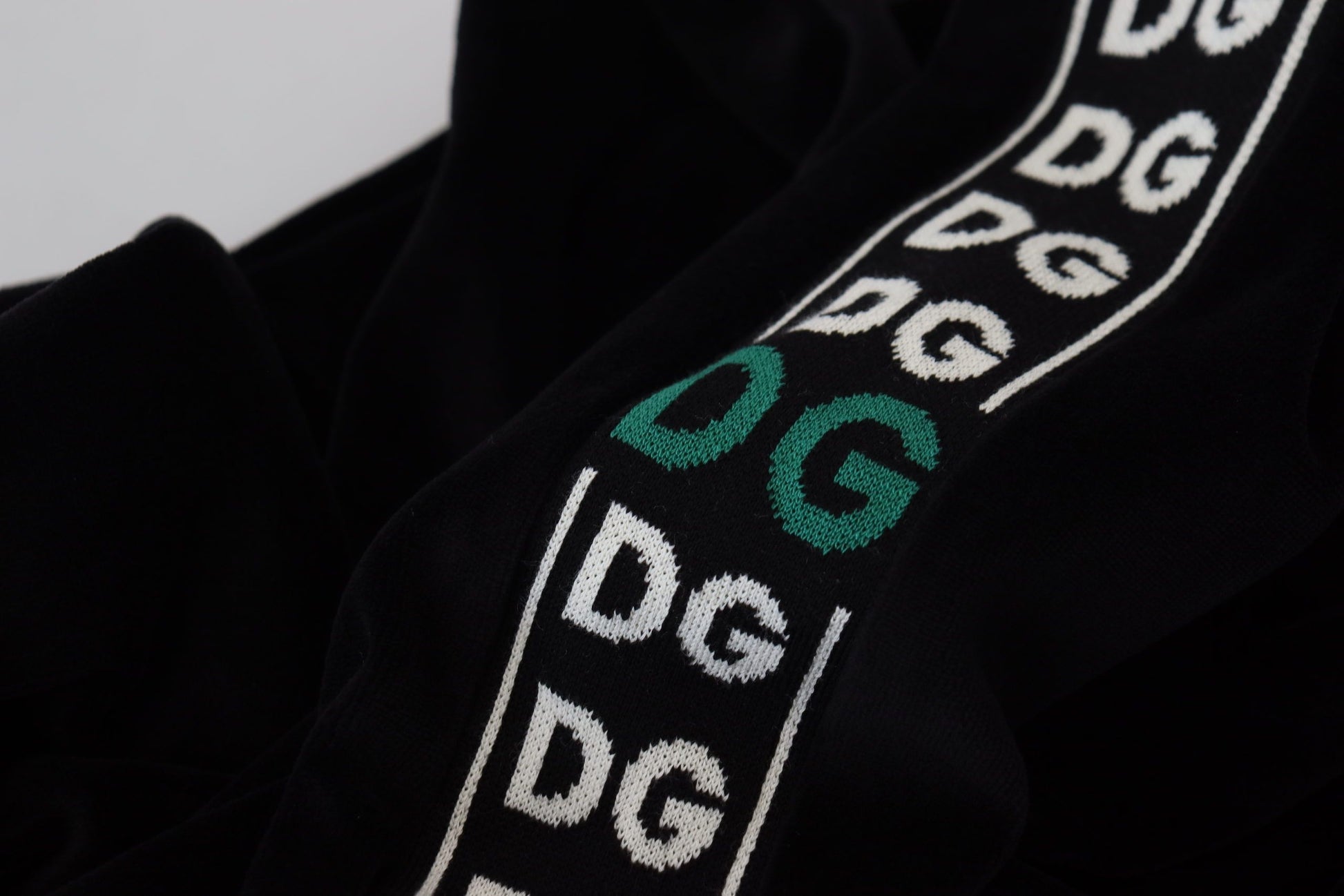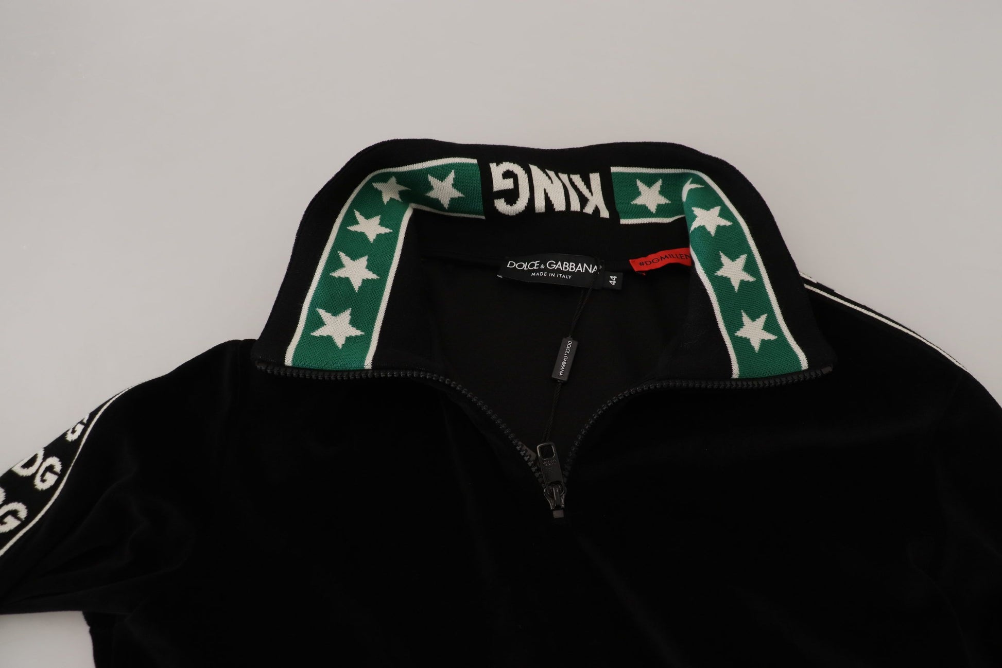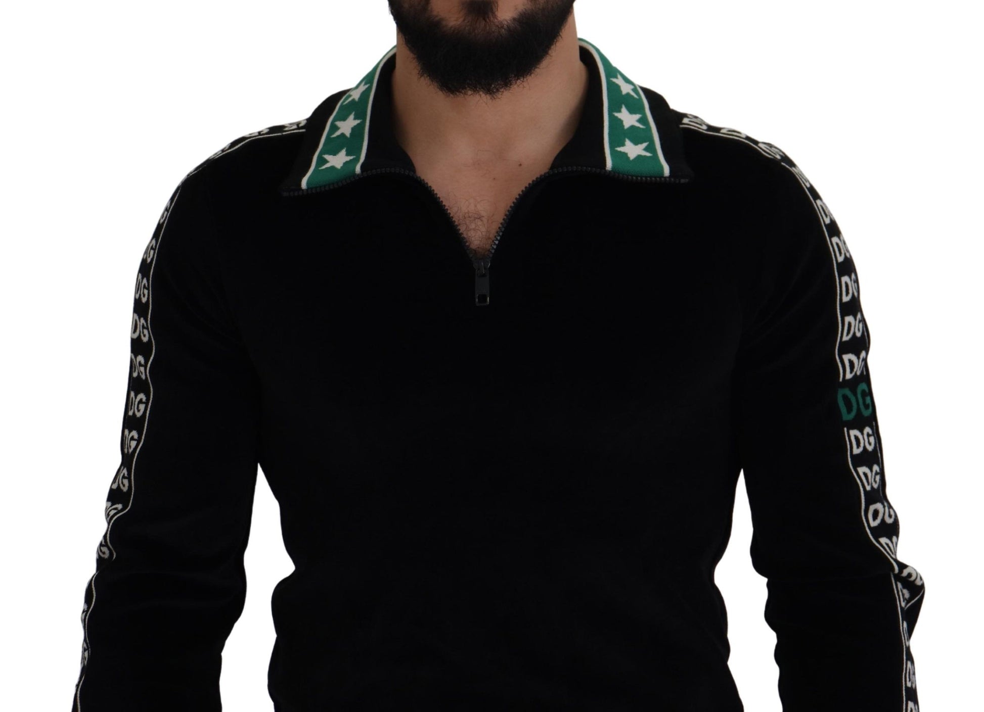 Indulge in the epitome of luxury with this stunning Dolce & Gabbana Black velvet sweatshirt. This garment boasts impeccable craftsmanship, utilizing a plush cotton-velvet blend that promises both comfort and elegance. The sweater is adorned with jacquard ribbons featuring a unique white and green monogram, harmoniously paired with star motifs and inscriptions on the cuffs, creating a truly exclusive piece. Crafted by the finest Italian artisans, this pullover polo sweater is a testament to sophisticated tailoring and chic style. Elevate your wardrobe with this exquisite item that reflects your unparalleled taste for premium fashion.