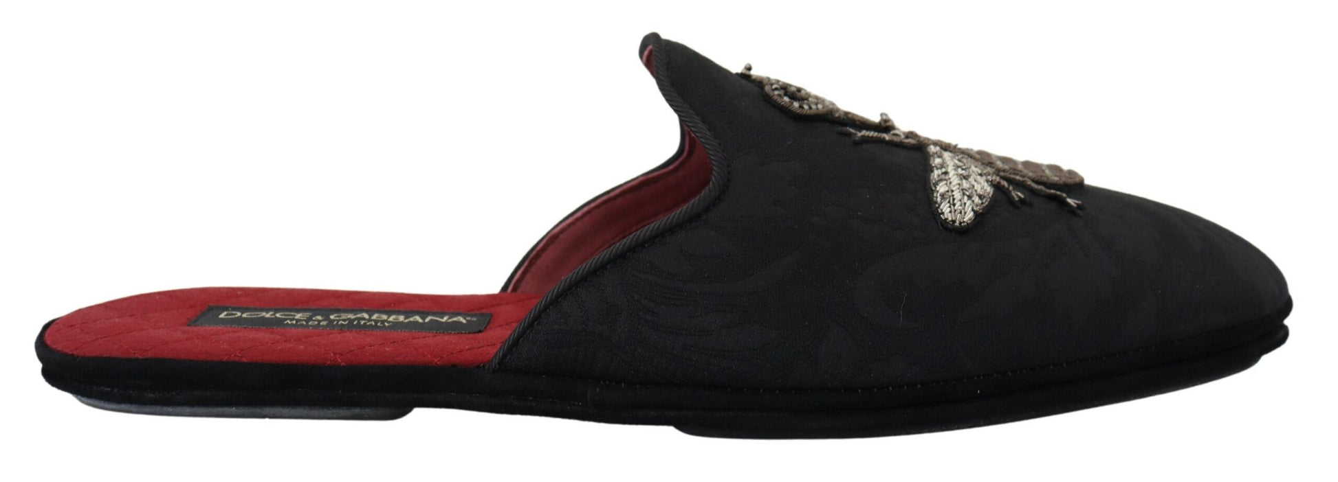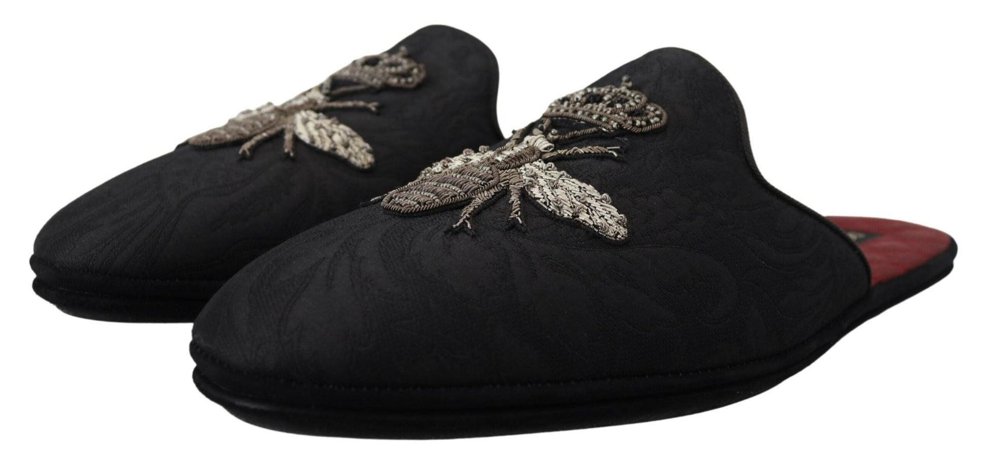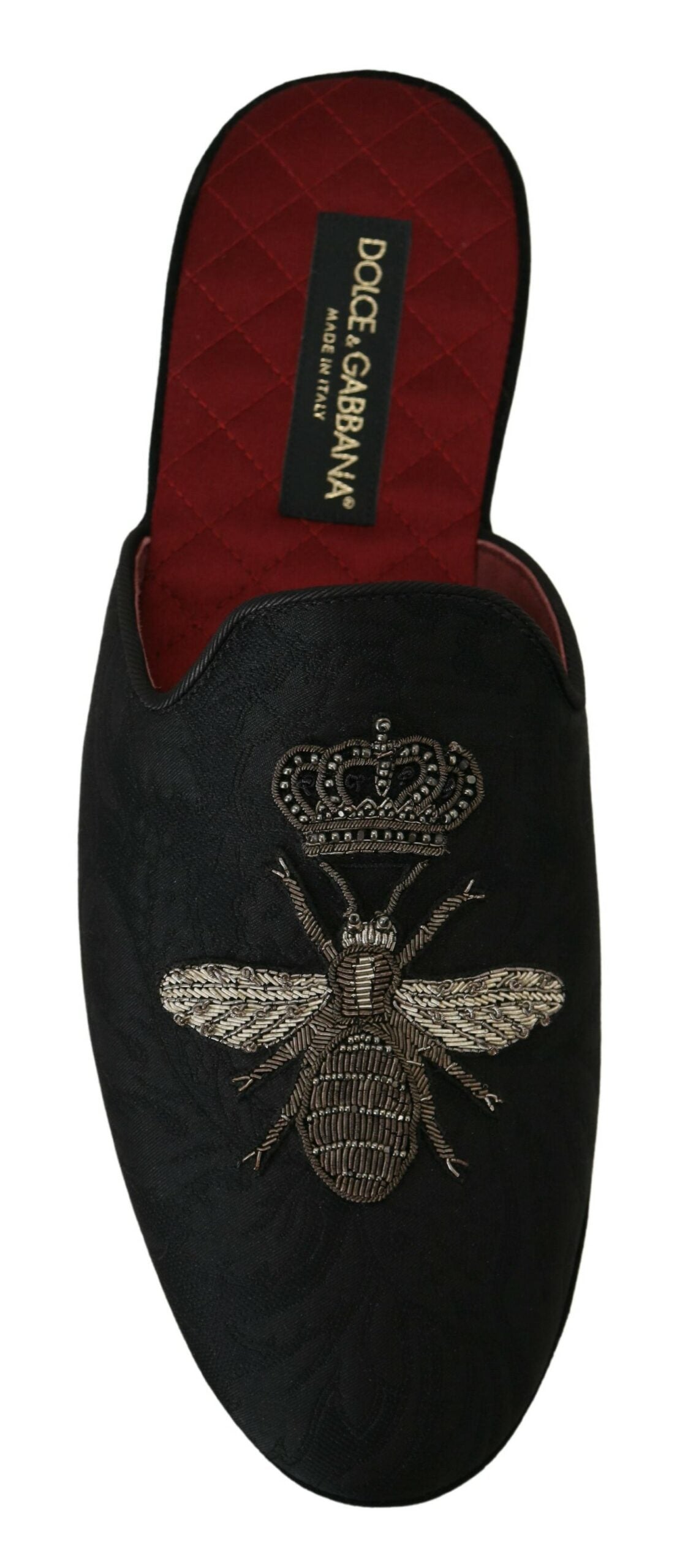 Step into luxury with these exquisite slides from Dolce & Gabbana. These slides aren’t just footwear; they are a statement of elegance with their stunning silver Bee Crown embroidery set against a sleek black backdrop with a contrasting red inner lining. Crafted with a blend of high-quality materials and designed for comfort without compromising on style, they are perfect for adding a touch of sophistication to your casual ensemble. The rubber sole ensures durability and grip, making these sandals as practical as they are stylish. Experience the blend of fashion and functionality, handcrafted in Italy.