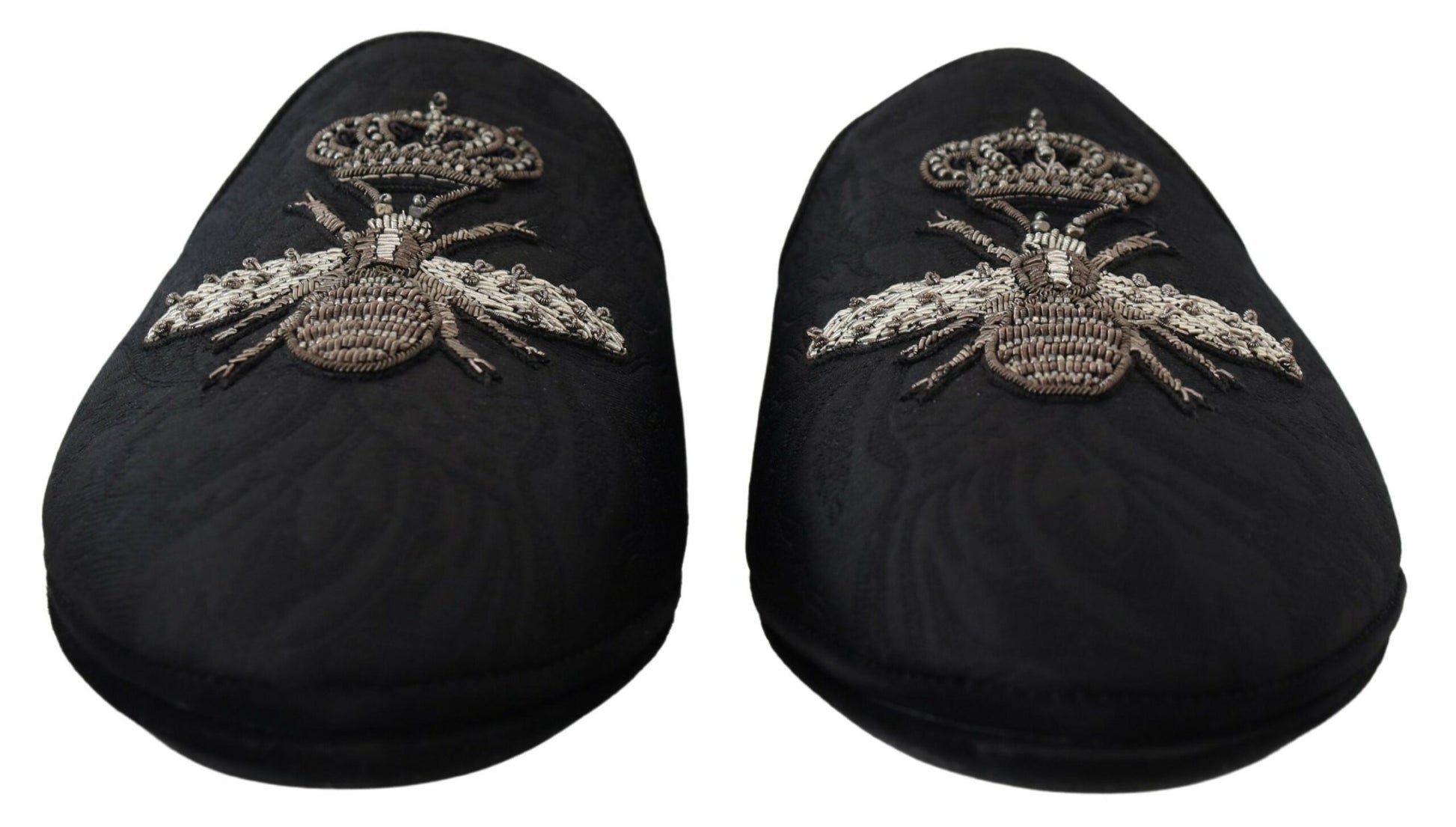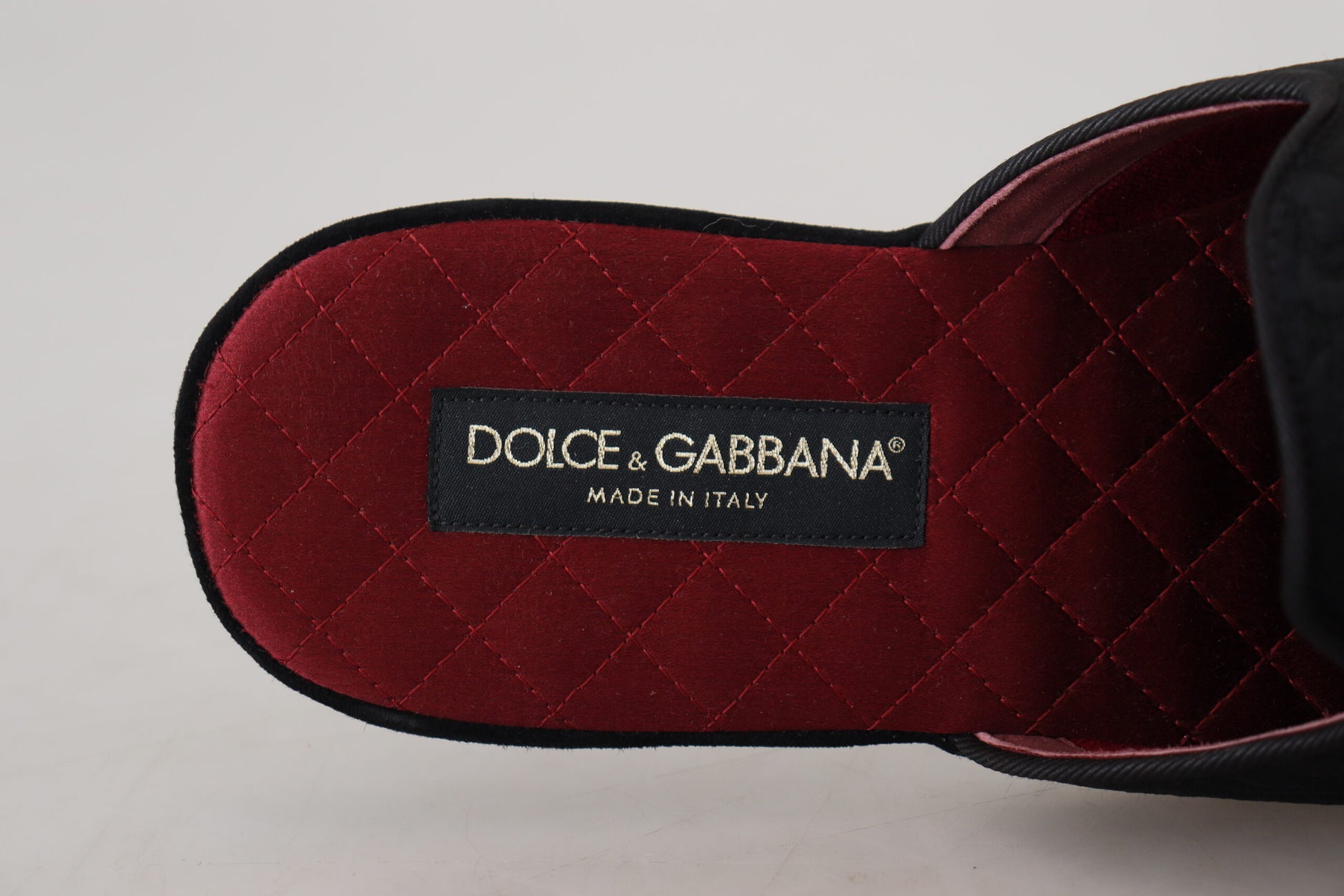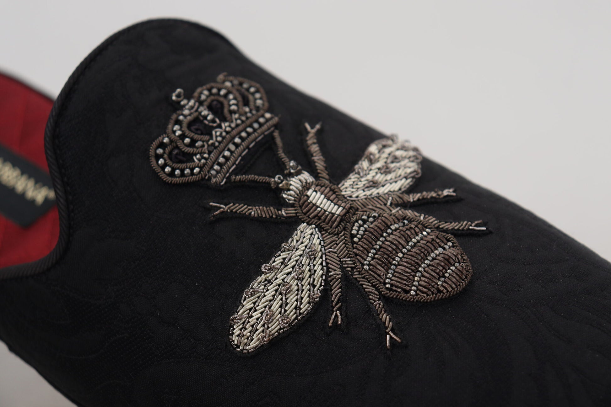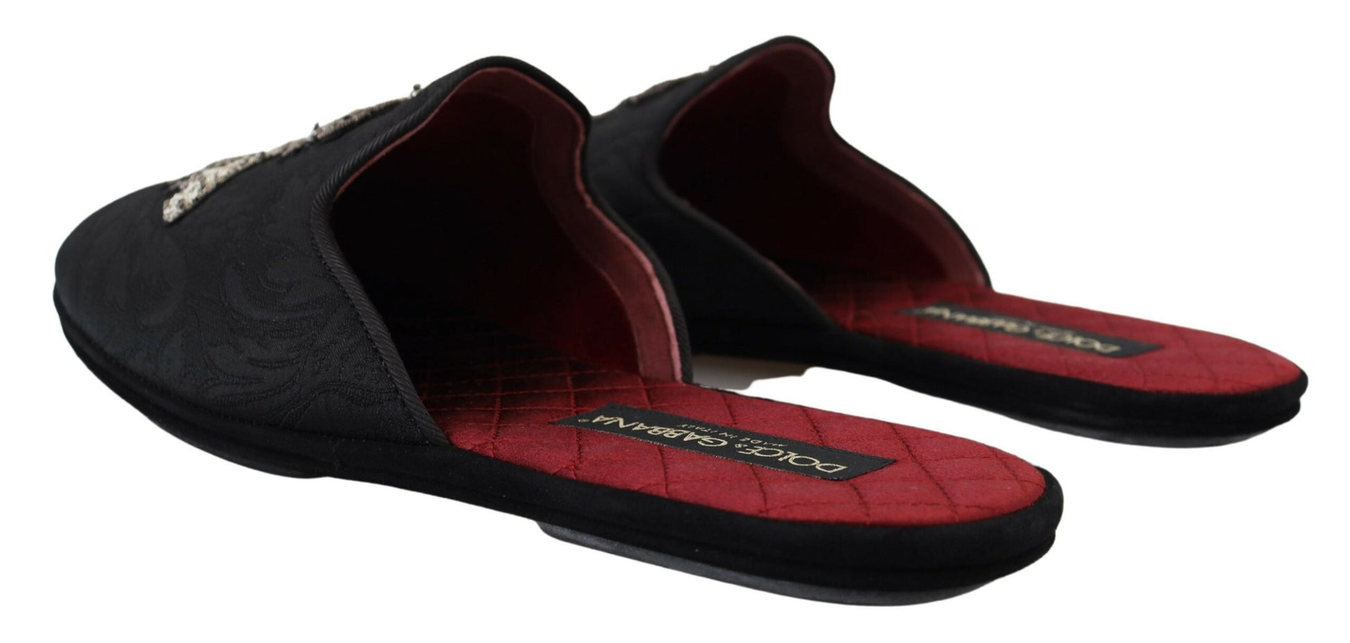 Step into luxury with these exquisite slides from Dolce & Gabbana. These slides aren’t just footwear; they are a statement of elegance with their stunning silver Bee Crown embroidery set against a sleek black backdrop with a contrasting red inner lining. Crafted with a blend of high-quality materials and designed for comfort without compromising on style, they are perfect for adding a touch of sophistication to your casual ensemble. The rubber sole ensures durability and grip, making these sandals as practical as they are stylish. Experience the blend of fashion and functionality, handcrafted in Italy.