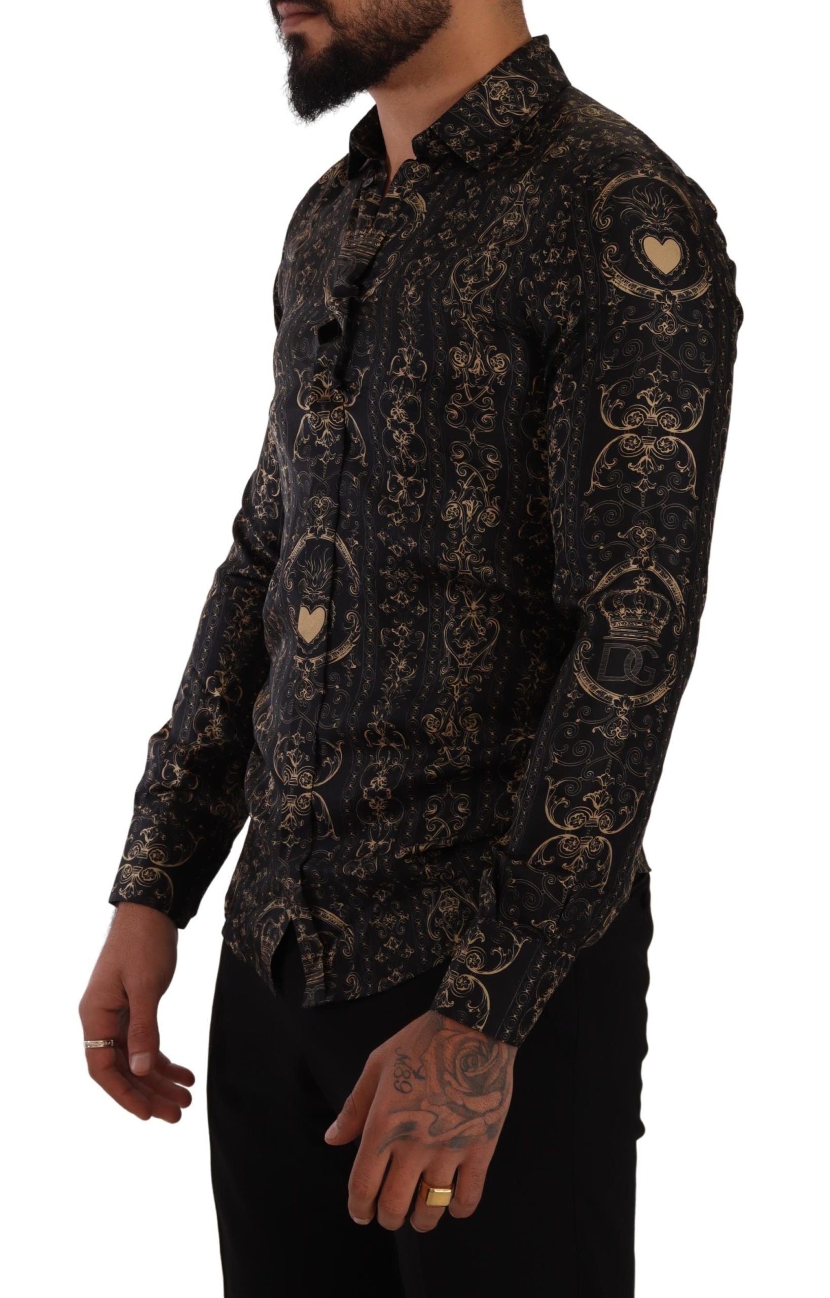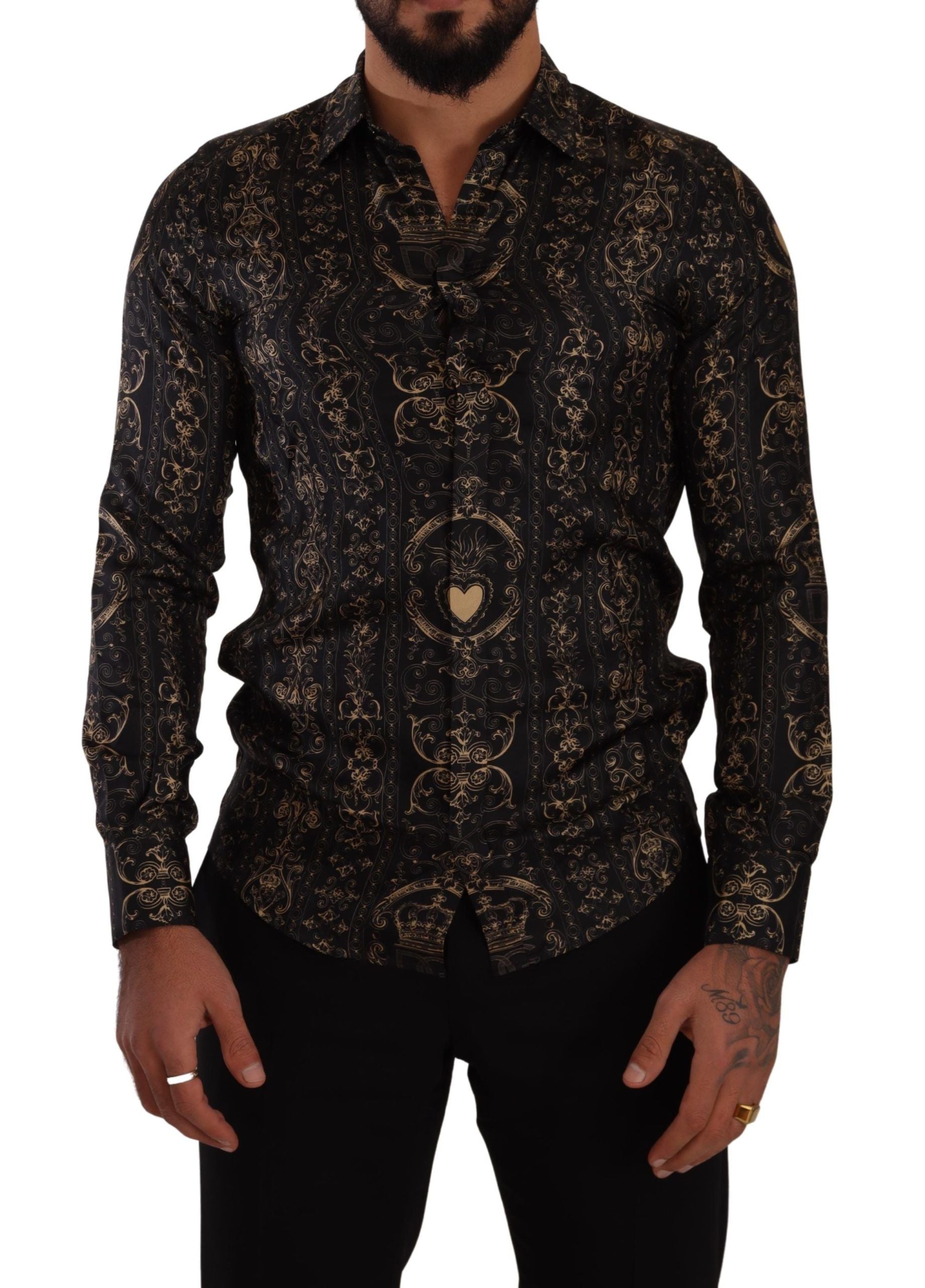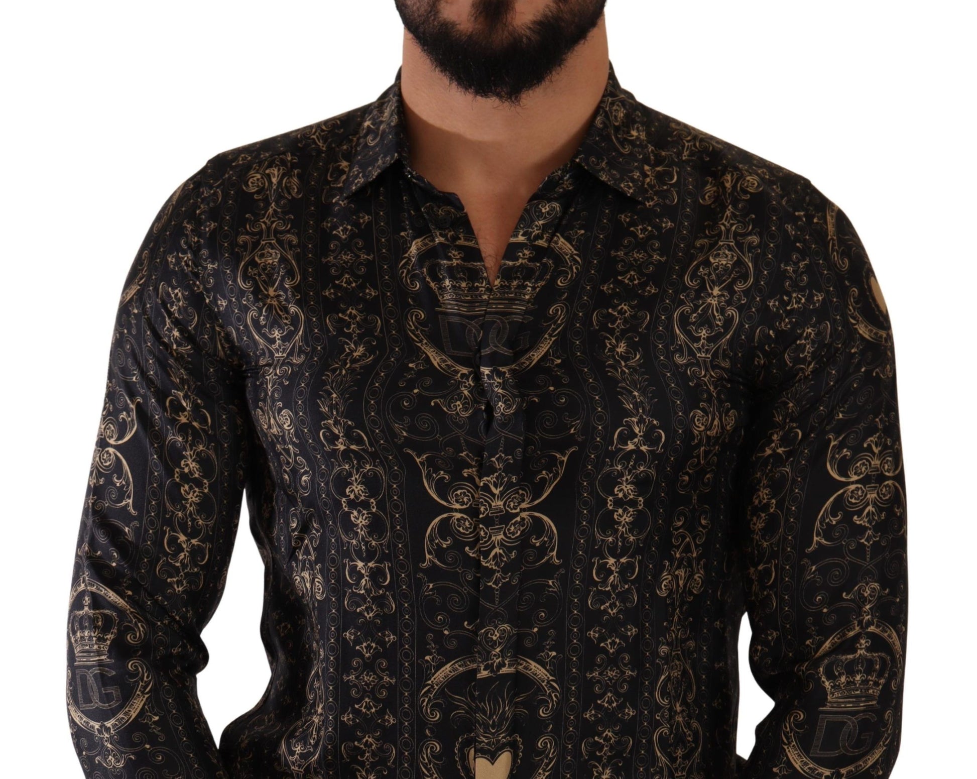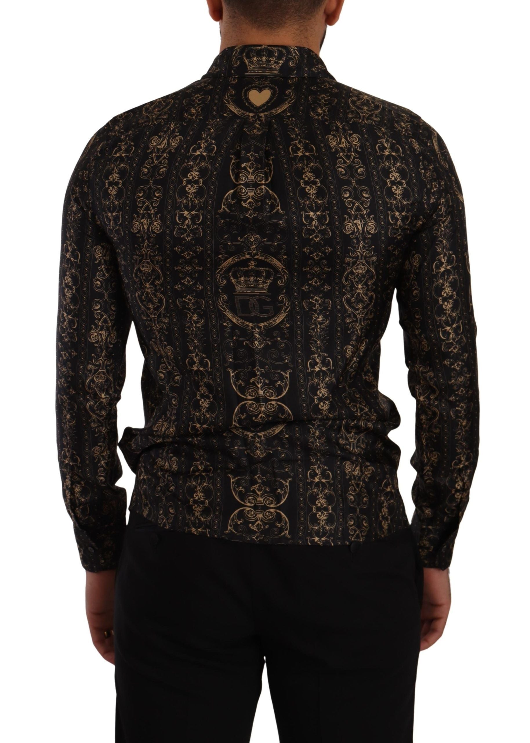 Discover the epitome of luxury with this exquisite slim fit shirt from Dolce & Gabbana. Crafted from the finest 100% silk, this designer piece features a regal crown print set against a sophisticated black canvas. With meticulous attention to detail, this shirt showcases full front button closure and the iconic logo that signifies high-end fashion. Made in Italy, this shirt exemplifies the elegance and style synonymous with Dolce & Gabbana.