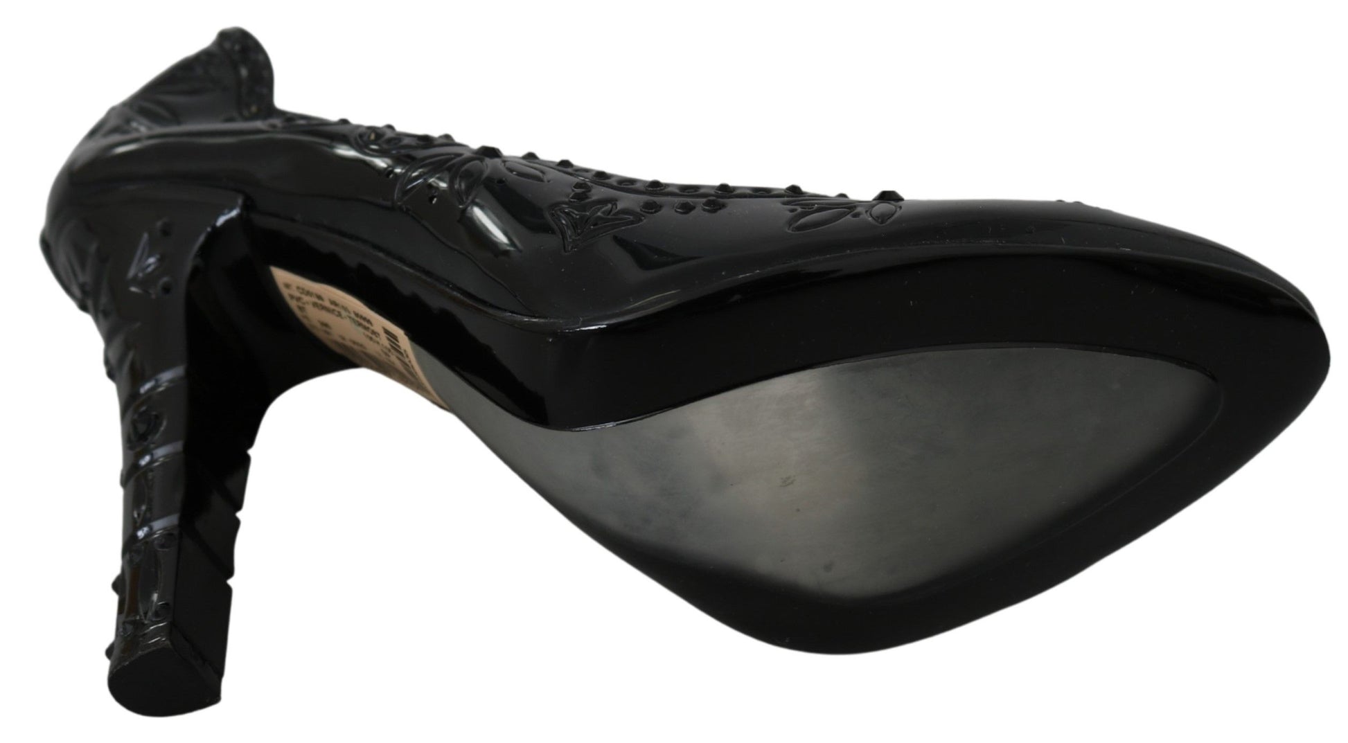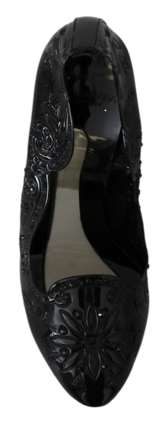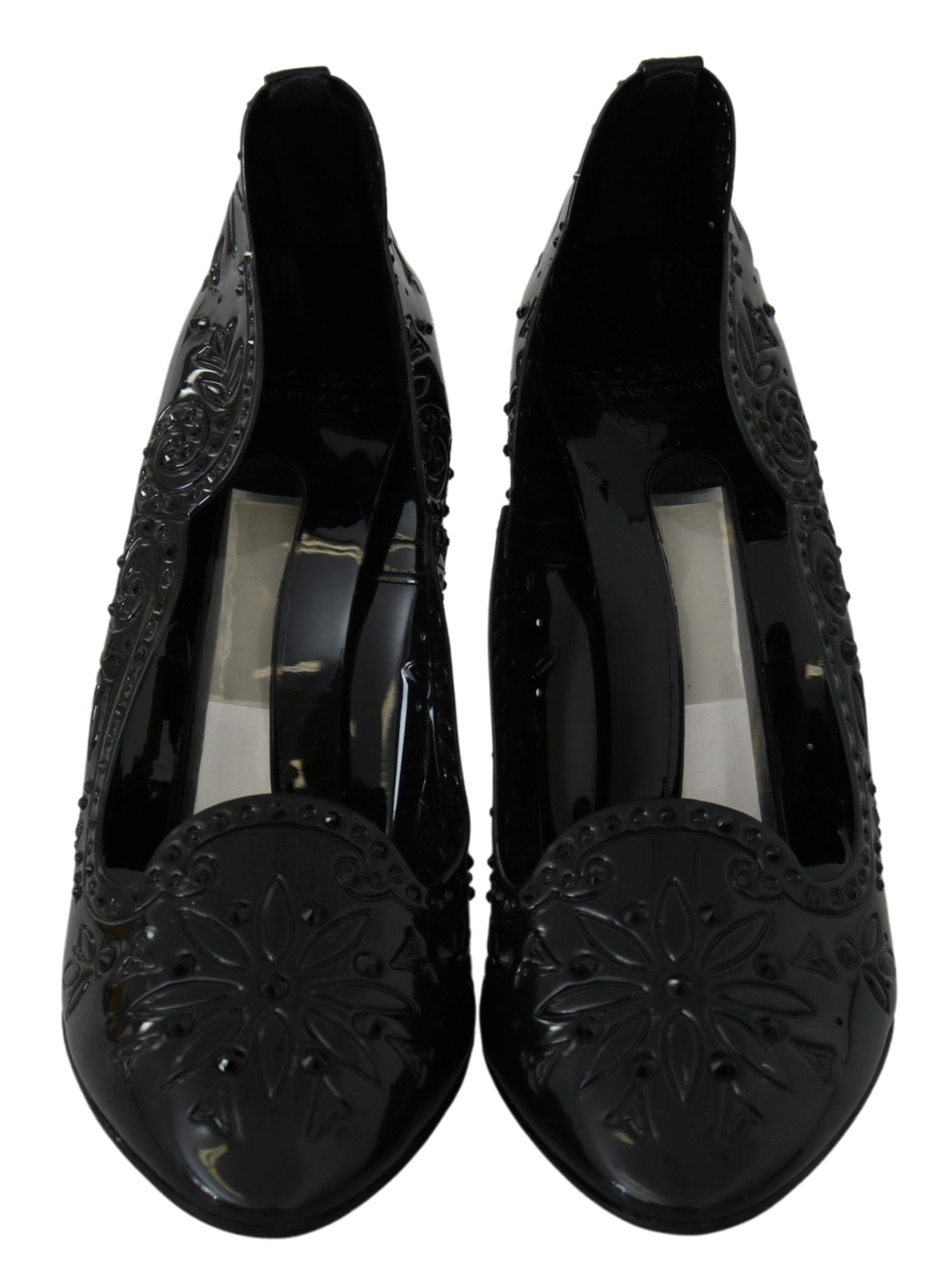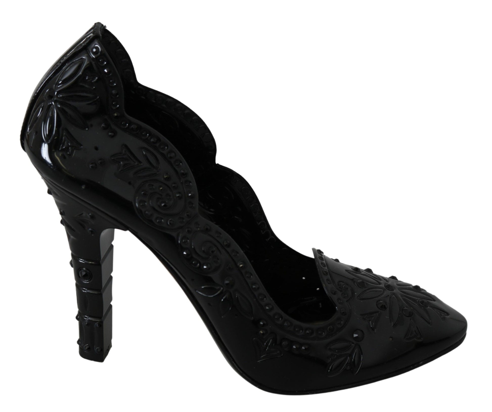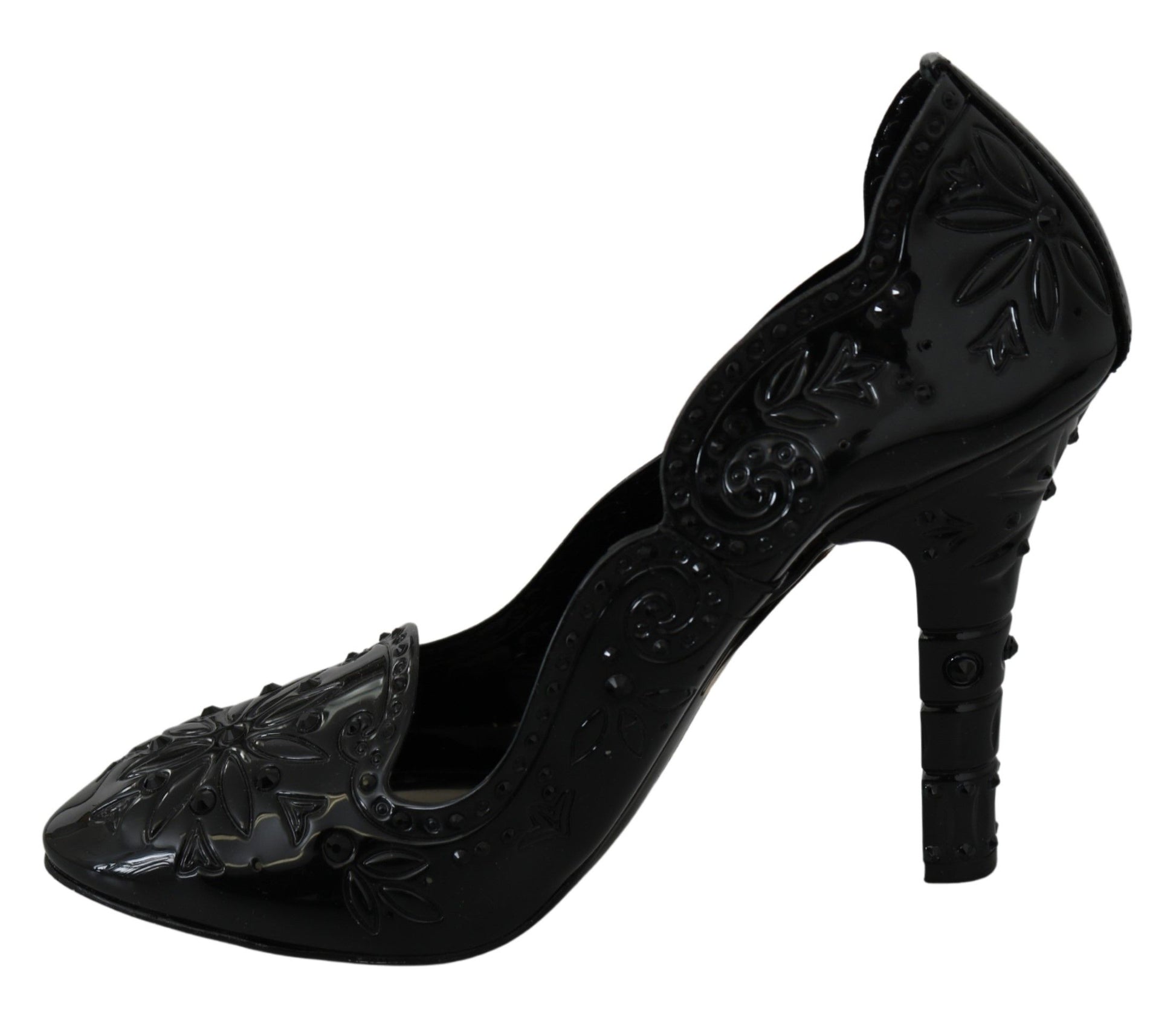 Step into a fairy tale with the exquisite Dolce & Gabbana Cinderella crystal pumps. These stunning shoes feature a sparkling black crystal embellishment, ensuring you’ll be the belle of any ball. The luxe combination of 90% PVC and 10% leather materials guarantees both style and comfort. Crafted in Italy, these pumps epitomize elegance and sophistication. Perfect for glamorous evenings or special occasions, they’re a timeless addition to any wardrobe.