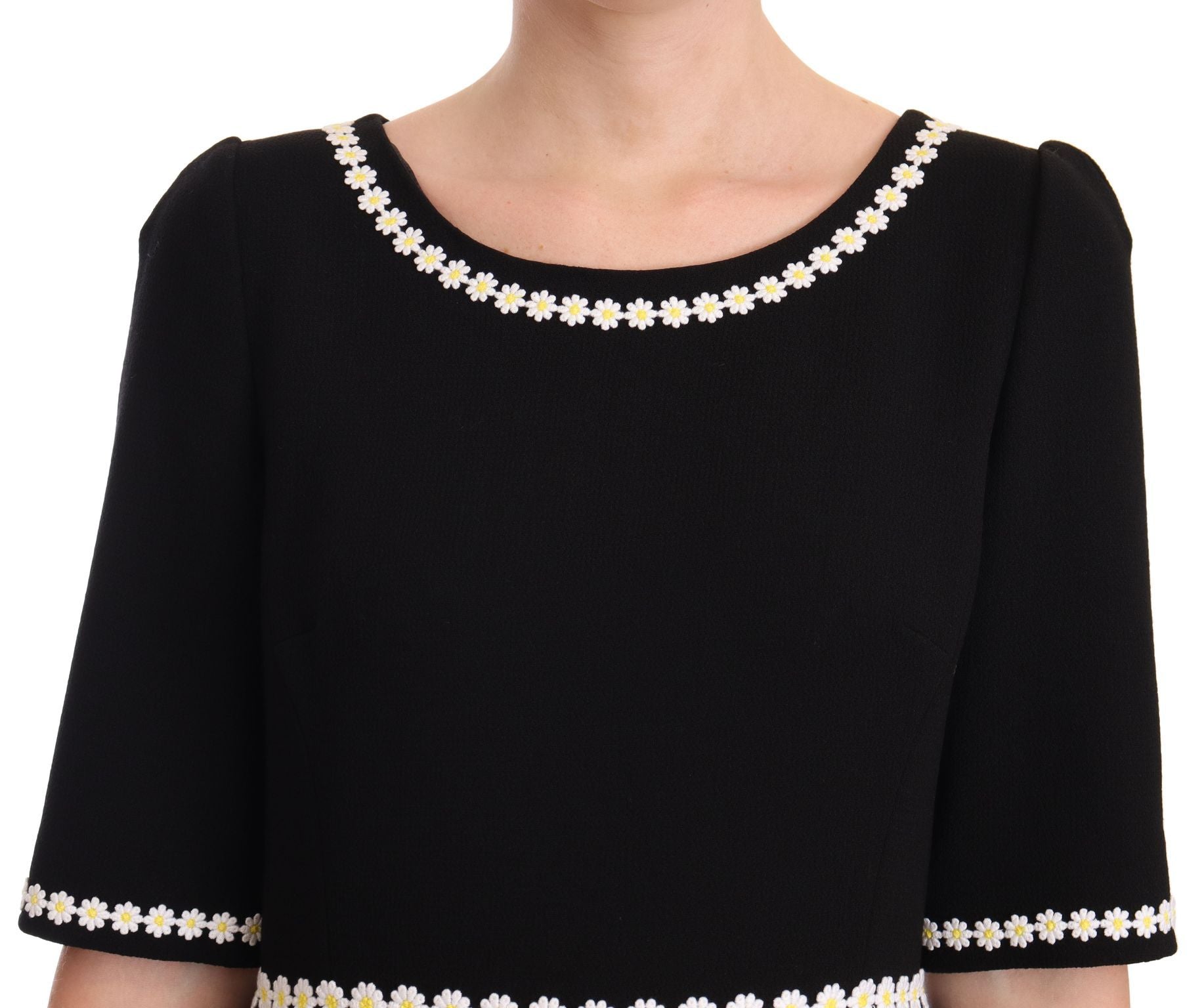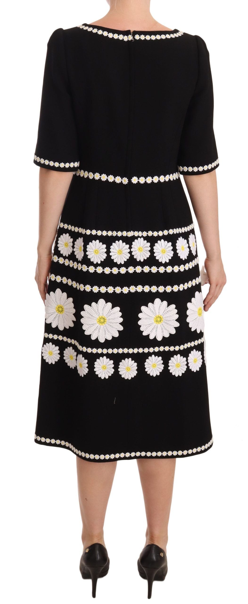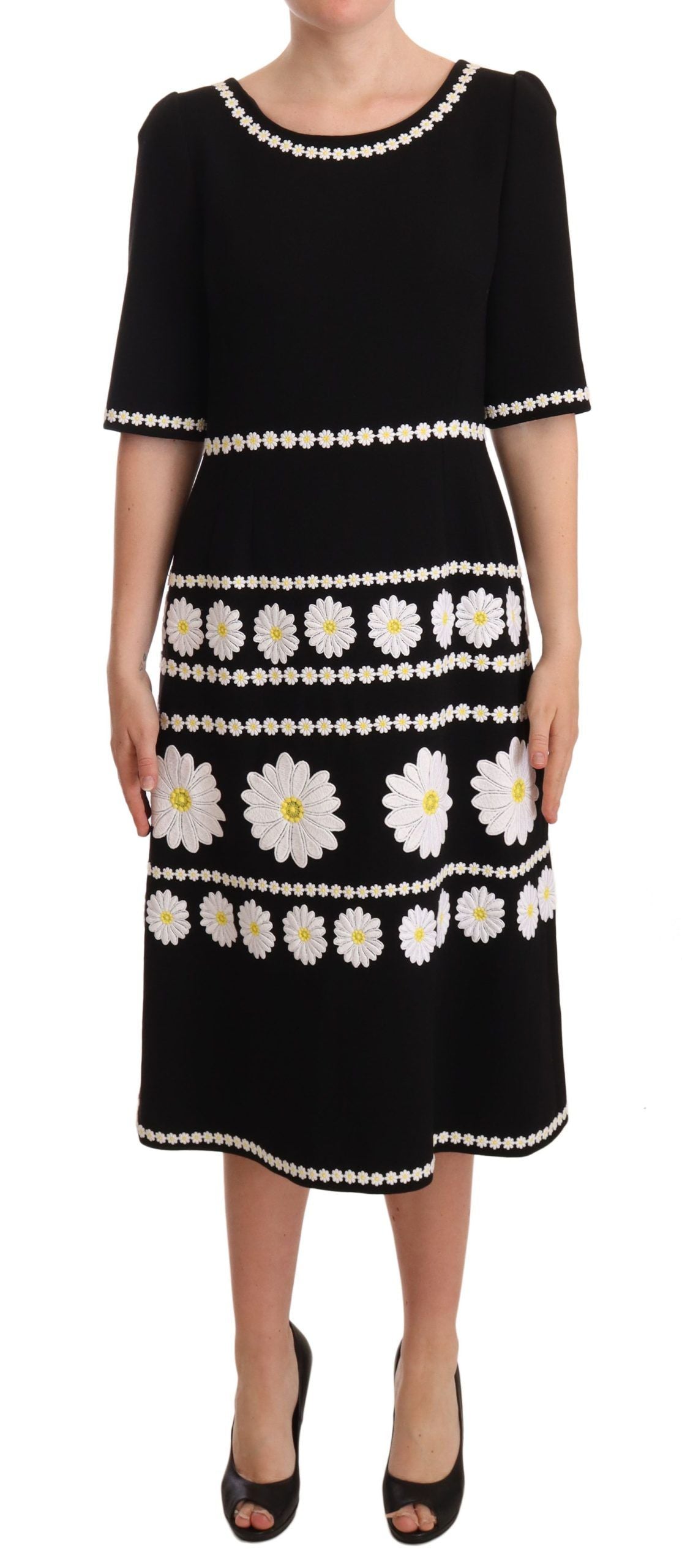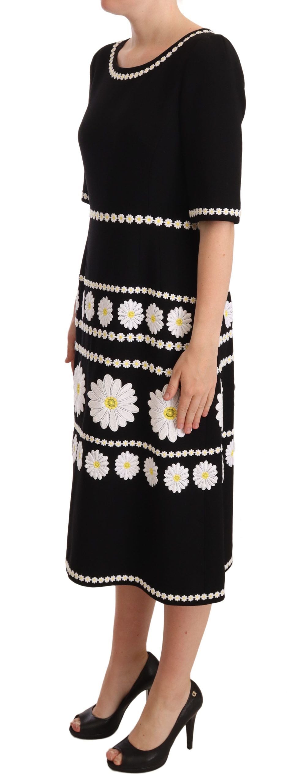 Step into luxury with this exquisite Dolce & Gabbana A-line Midi Dress. Impeccably crafted in Italy, this stunning piece boasts intricate daisy embroidery, flaunting your sophisticated style with its sleek black color and flawless design. Finely constructed from 100% premium wool, this captivating dress epitomizes elegance perfect for any special event. Bringing together a fitted bodice and a gracefully flared skirt, it’s the epitome of high-end craftsmanship and exclusive fashion.