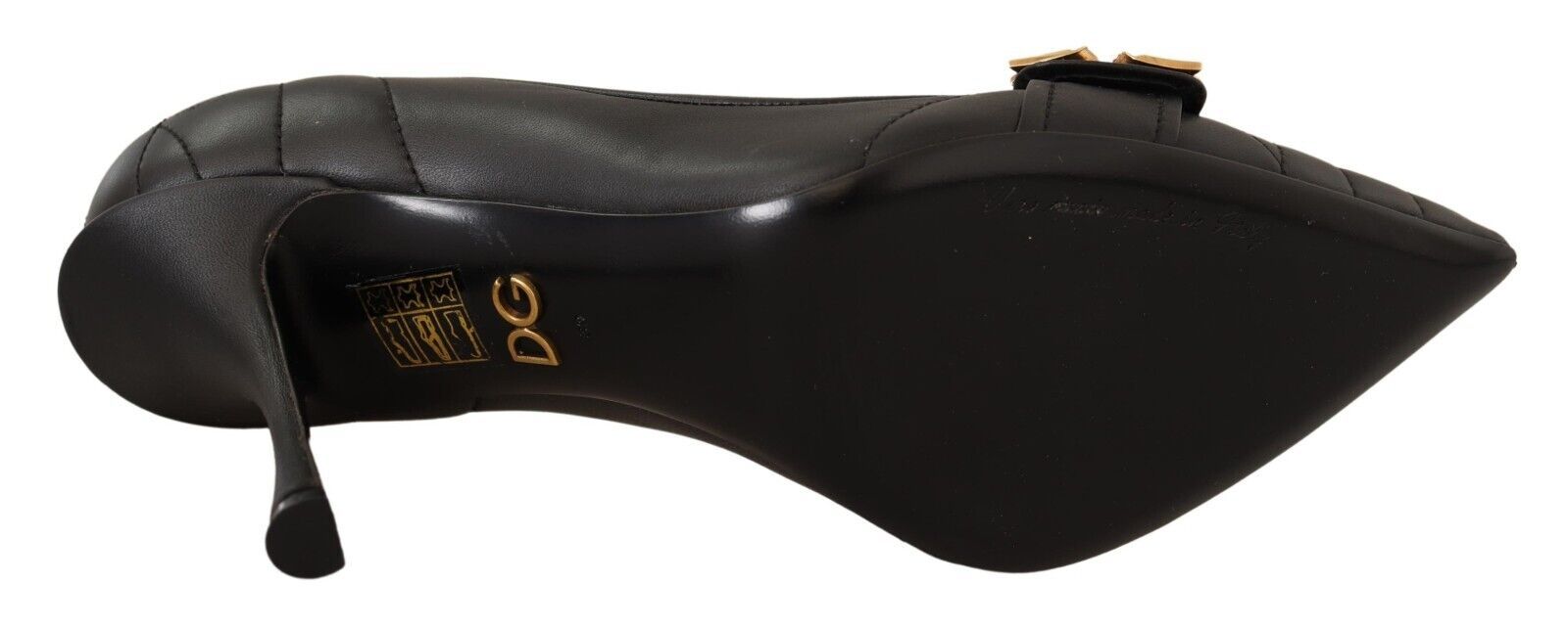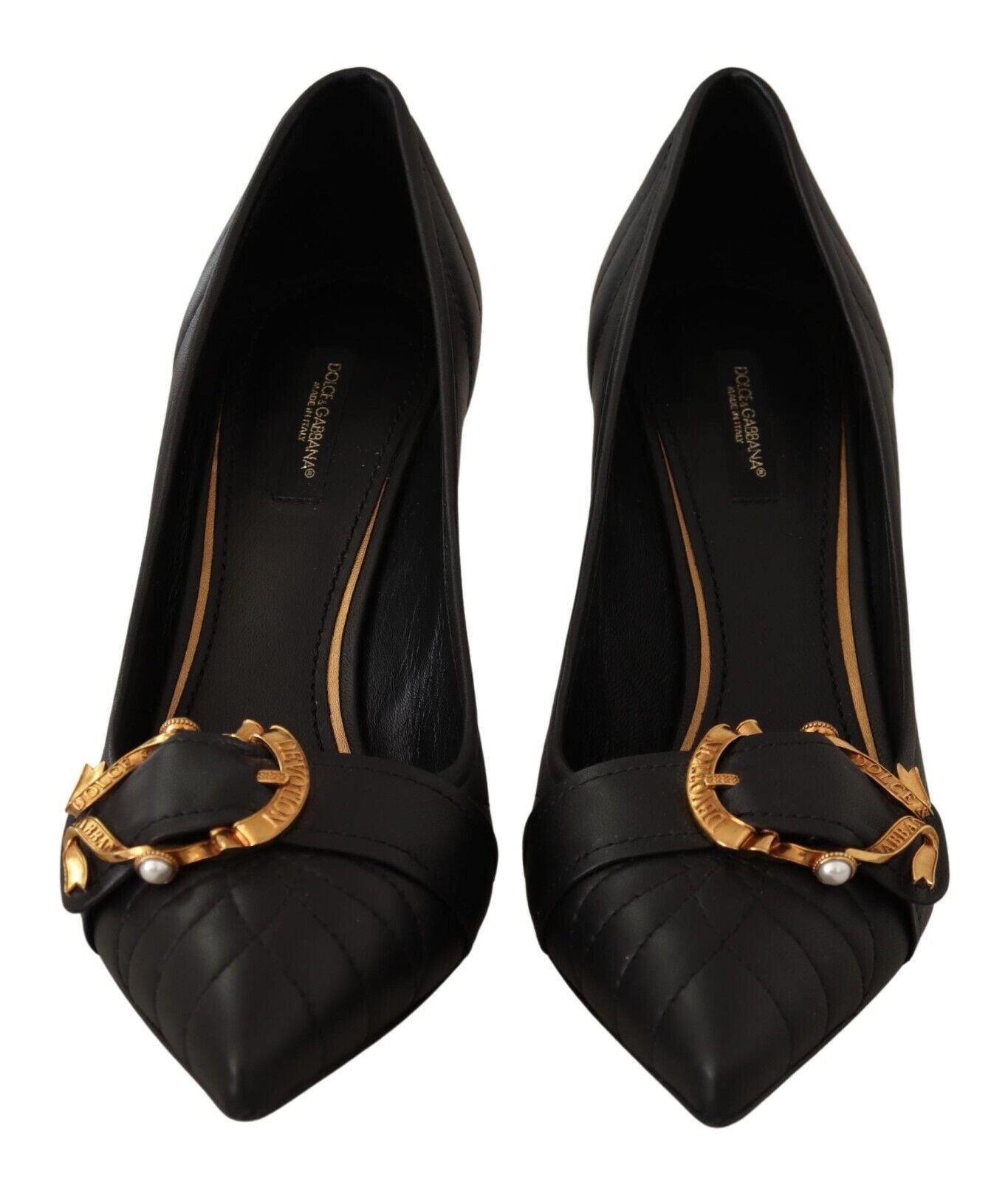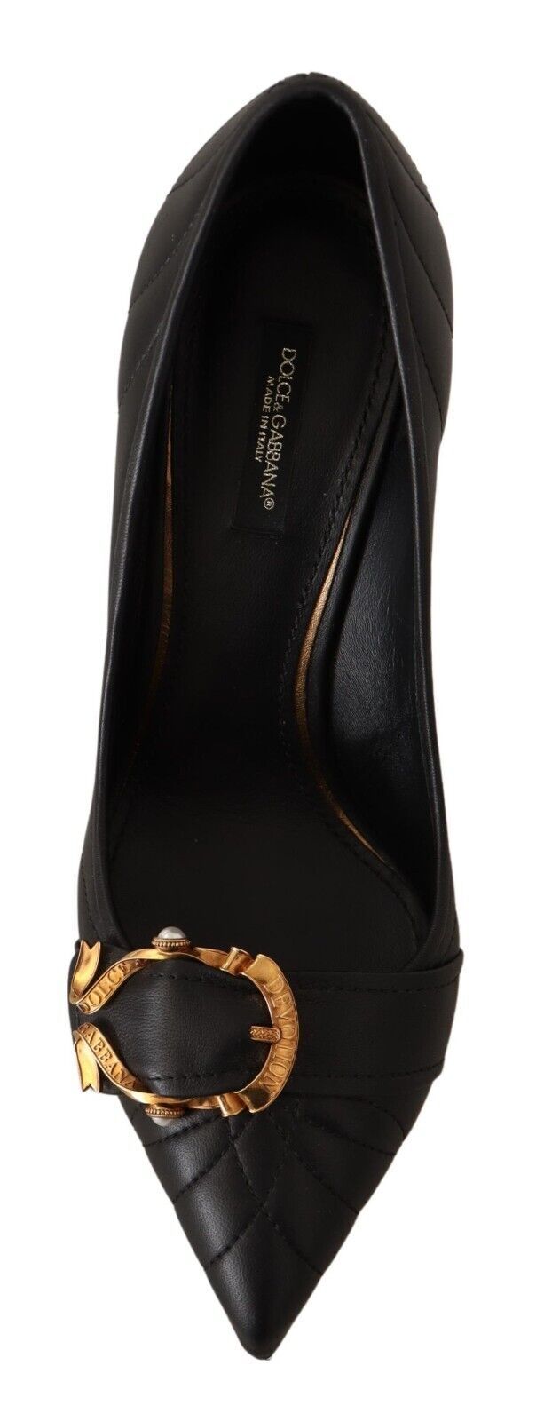 Step into luxury with these gorgeous, authentic leather pumps, a must-have for any fashion-forward wardrobe. Perfect for adding a touch of sophistication to any ensemble, they feature a chic brass buckle and pointed toe design. The wrapped heel offers an elegant silhouette, while the leather sole boasts a discreet logo, indicating true quality and craftsmanship. Exquisitely made in Italy, these pumps are a testament to Dolce & Gabbana’s commitment to luxury and style.