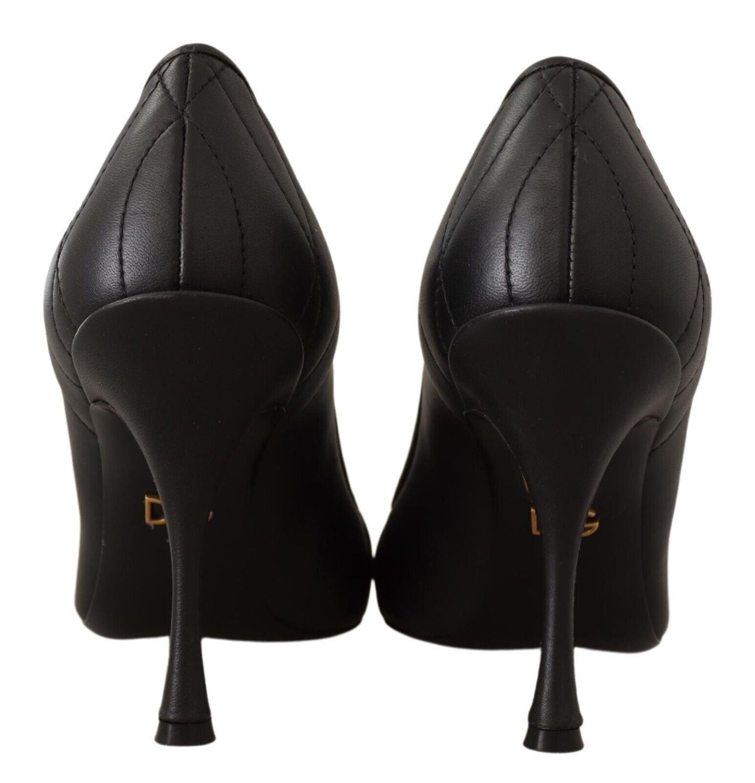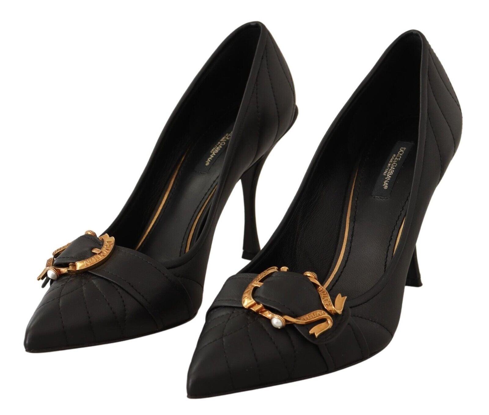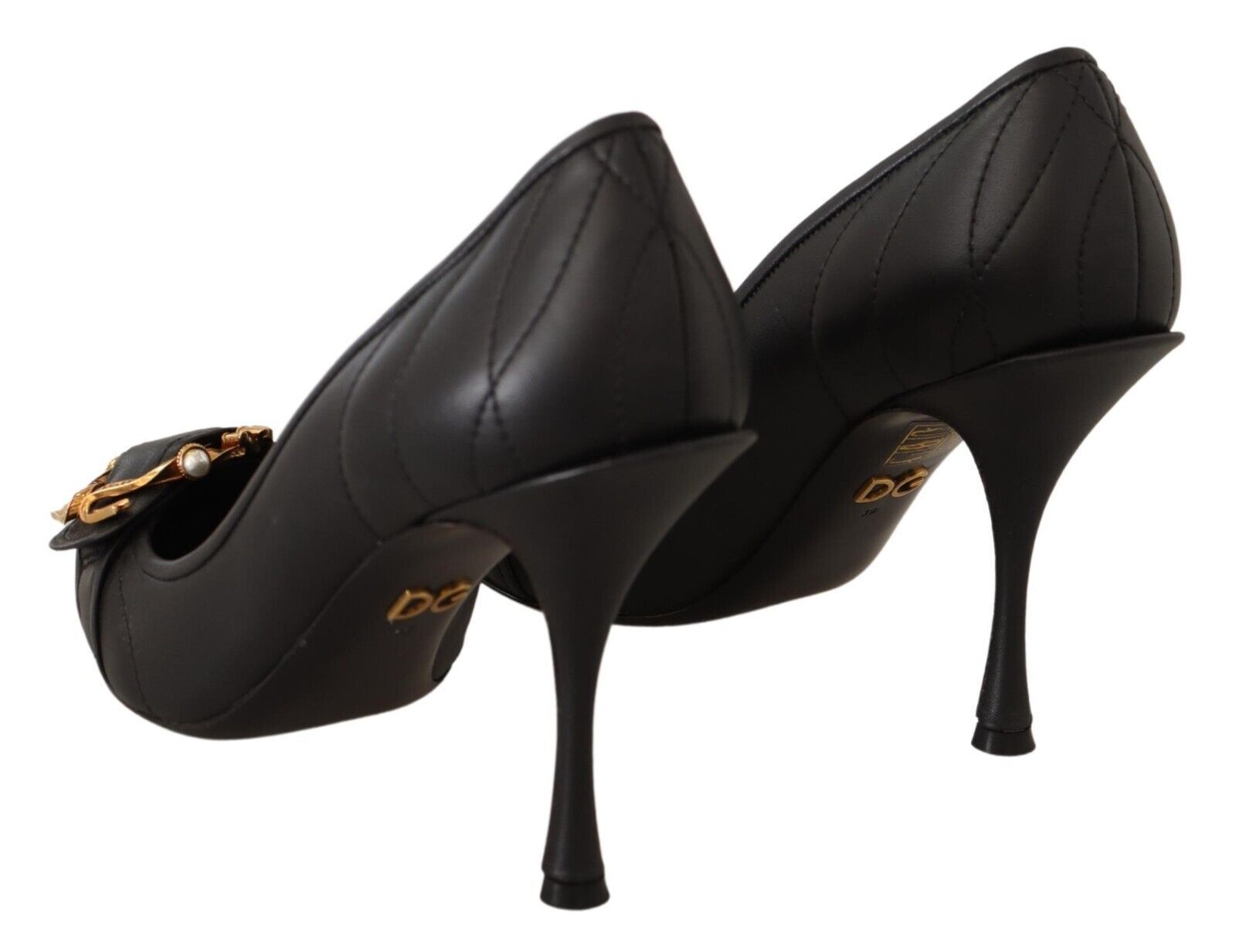 Step into luxury with these gorgeous, authentic leather pumps, a must-have for any fashion-forward wardrobe. Perfect for adding a touch of sophistication to any ensemble, they feature a chic brass buckle and pointed toe design. The wrapped heel offers an elegant silhouette, while the leather sole boasts a discreet logo, indicating true quality and craftsmanship. Exquisitely made in Italy, these pumps are a testament to Dolce & Gabbana’s commitment to luxury and style.