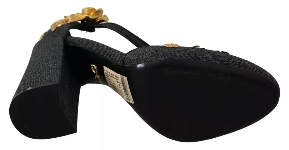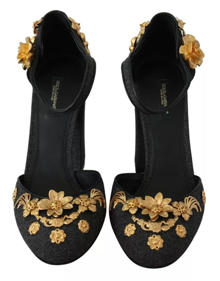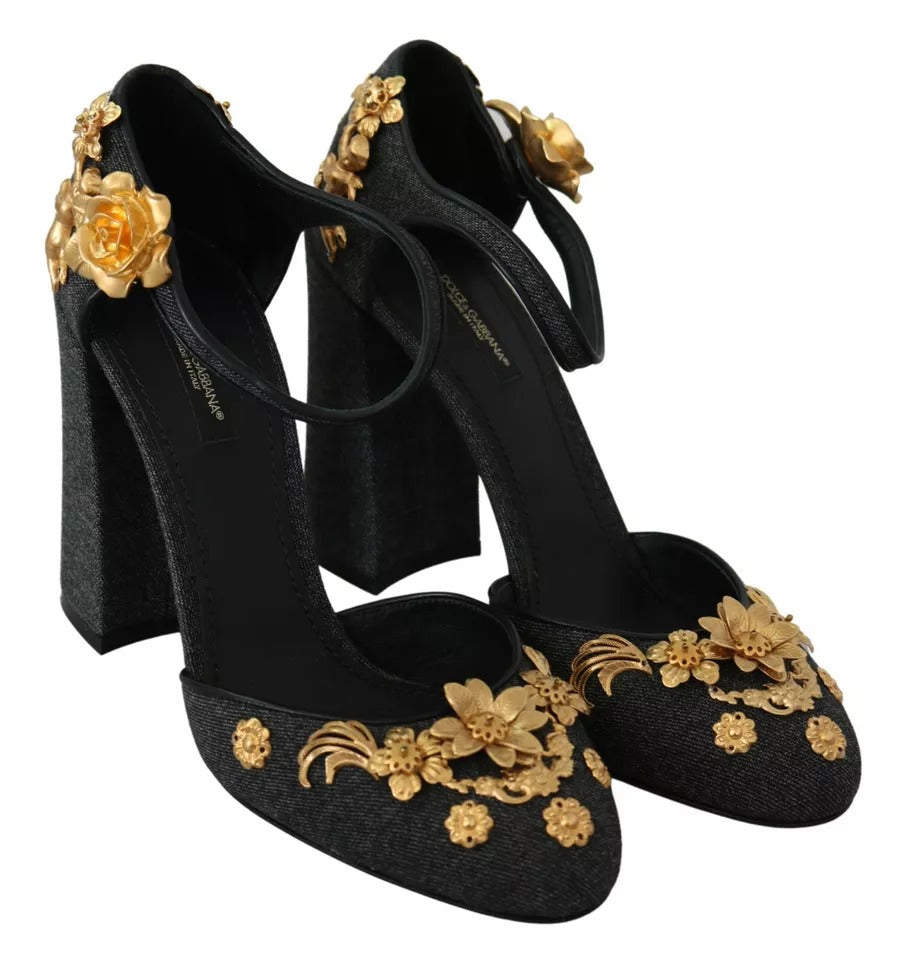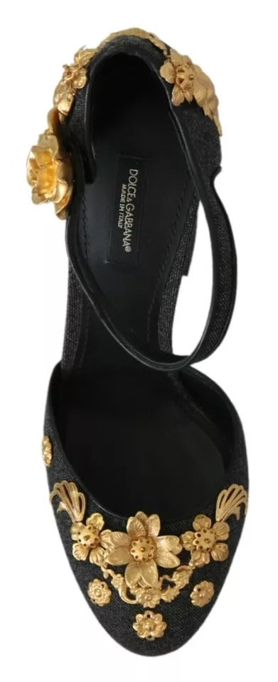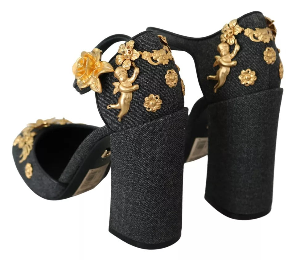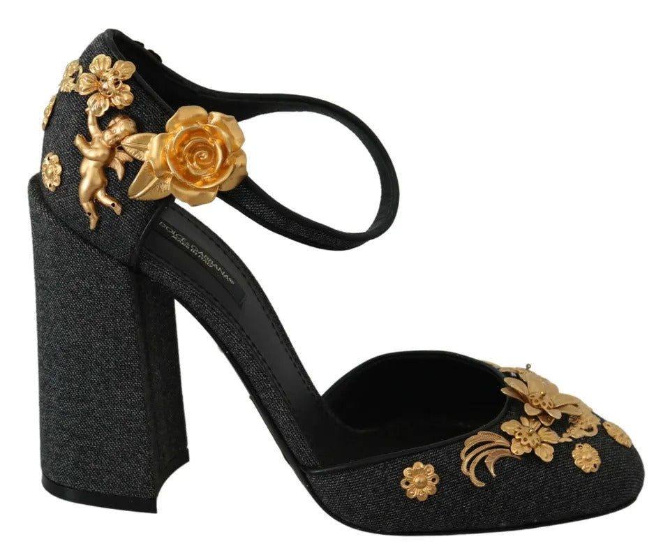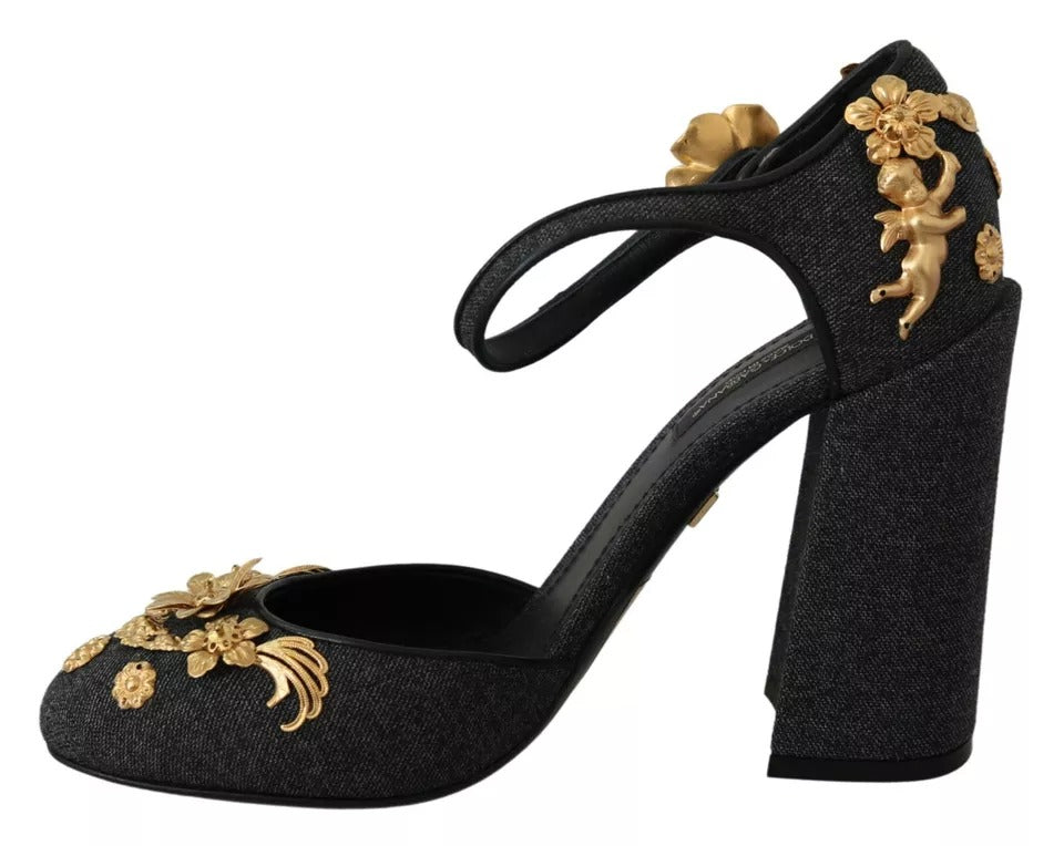 Gorgeous brand new with tags, 100% Authentic Dolce & Gabbana Black Ankle Strap Shoes with Gold Floral and Angel Applique.