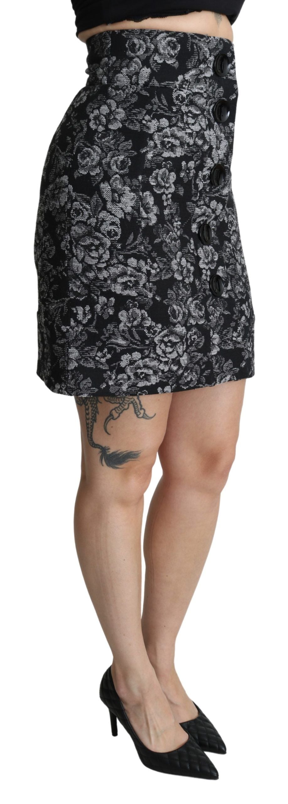 Discover timeless elegance with this Dolce & Gabbana black floral brocade skirt. Perfect for making a chic statement, this luxurious skirt boasts a stunning brocade pattern, enhanced by decorative buttons, an A-line silhouette, and a discreet back zip closure. Crafted with exquisite attention to detail in Italy, it adds a touch of glamour to any ensemble.