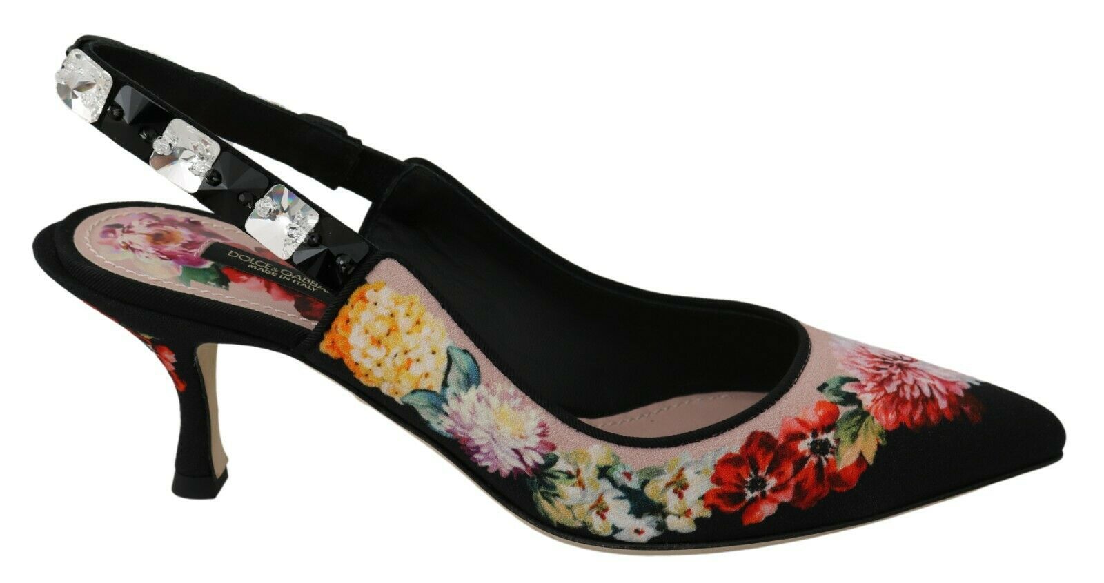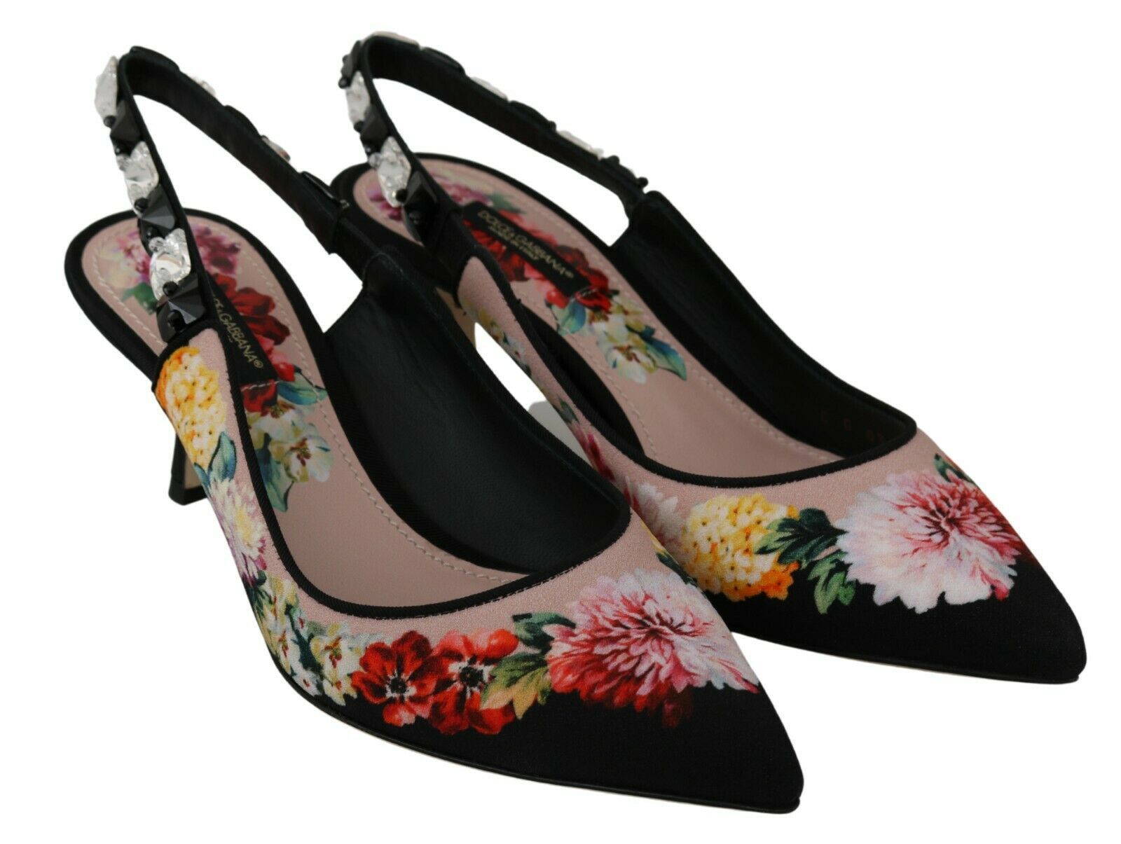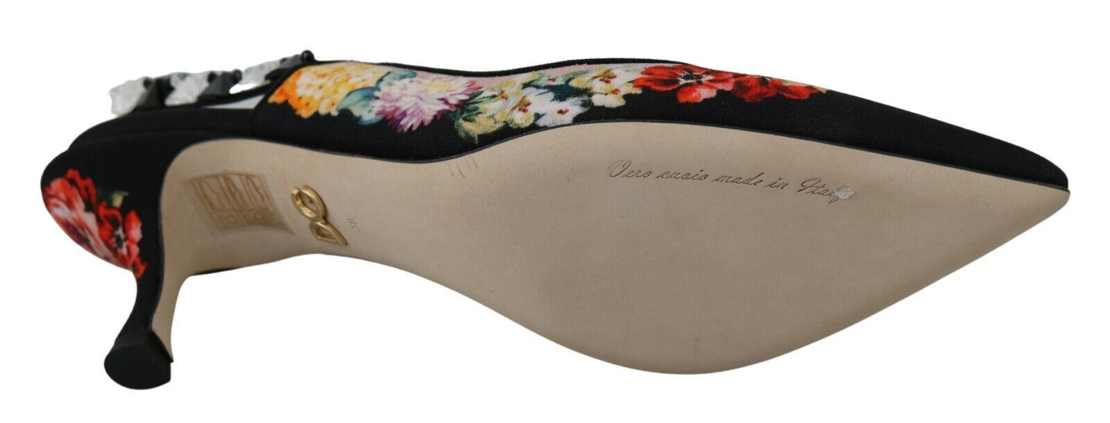 Step into luxury with these exquisite floral slingback heels from Dolce & Gabbana. Crafted with the utmost attention to detail, these black heels feature a vibrant, multicolor floral print that exudes elegance for any high-end outing or event. Enhanced with sparkling white and black crystals, these shoes don’t just make a statement, they whisper sophistication. Experience the blend of high-quality materials and unrivaled Italian craftsmanship that ensure both comfort and style.