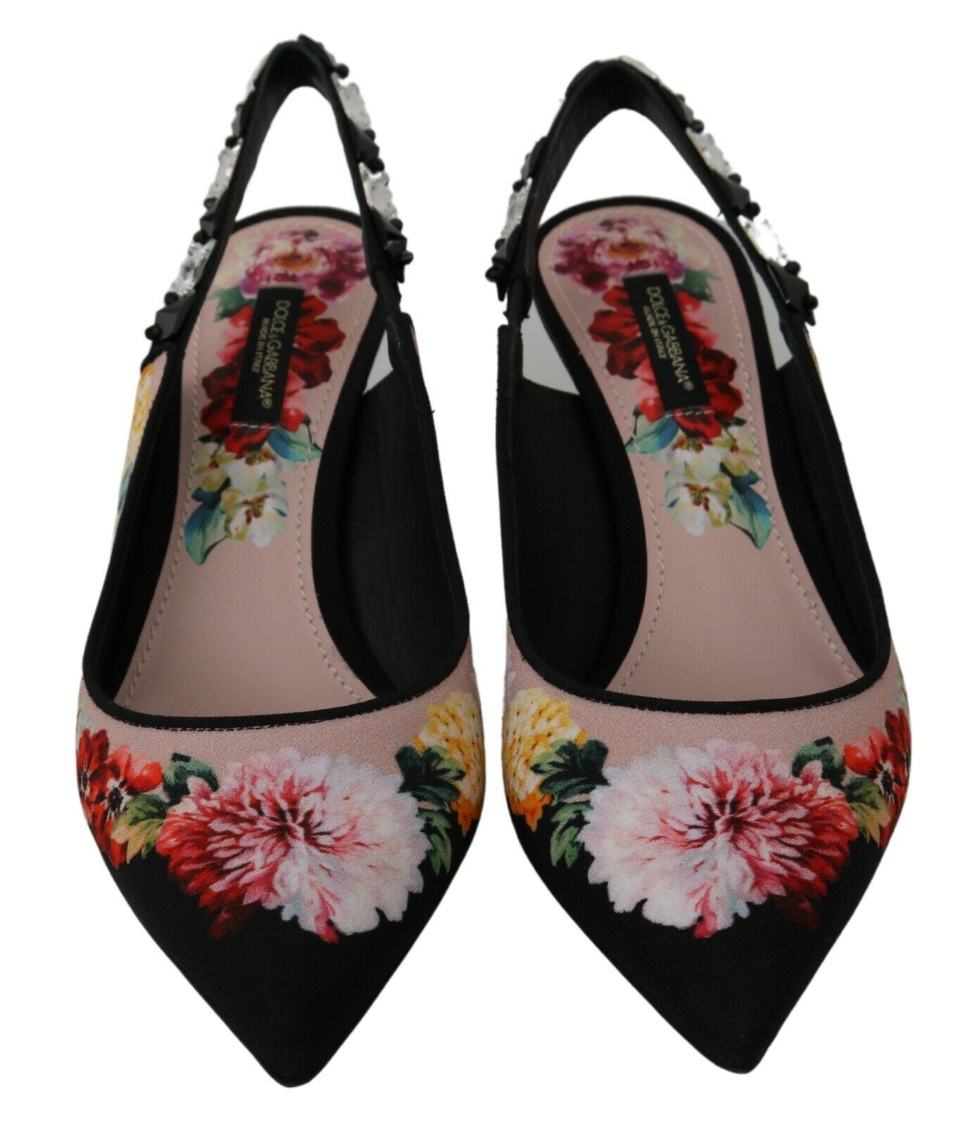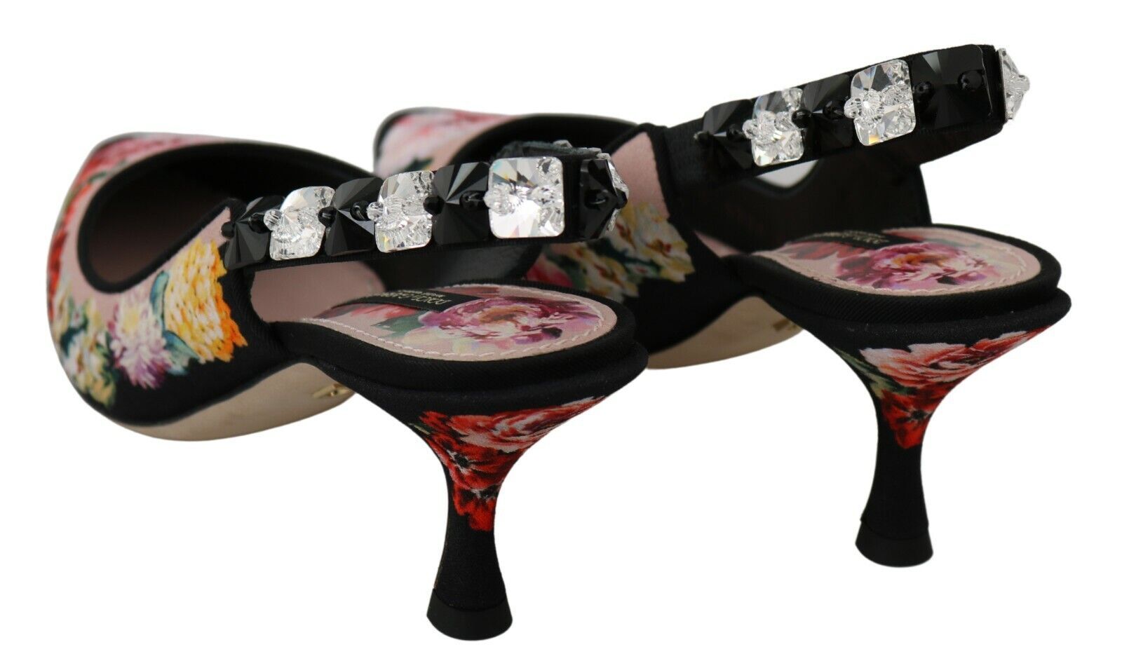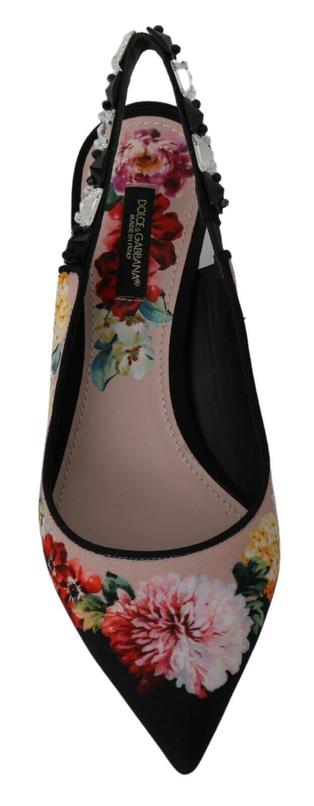 Step into luxury with these exquisite floral slingback heels from Dolce & Gabbana. Crafted with the utmost attention to detail, these black heels feature a vibrant, multicolor floral print that exudes elegance for any high-end outing or event. Enhanced with sparkling white and black crystals, these shoes don’t just make a statement, they whisper sophistication. Experience the blend of high-quality materials and unrivaled Italian craftsmanship that ensure both comfort and style.
