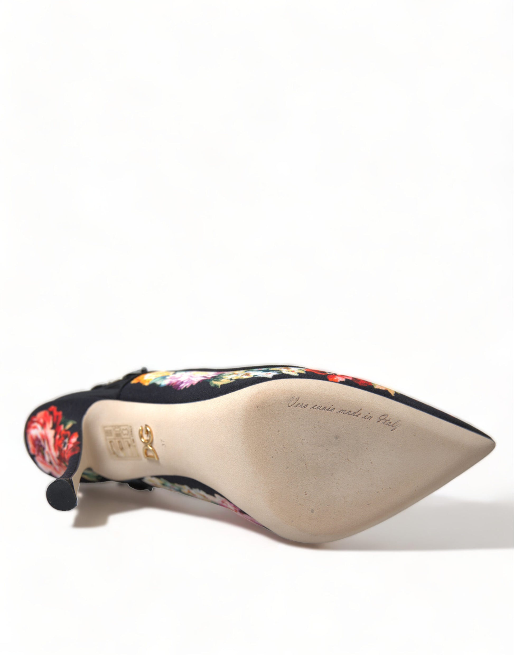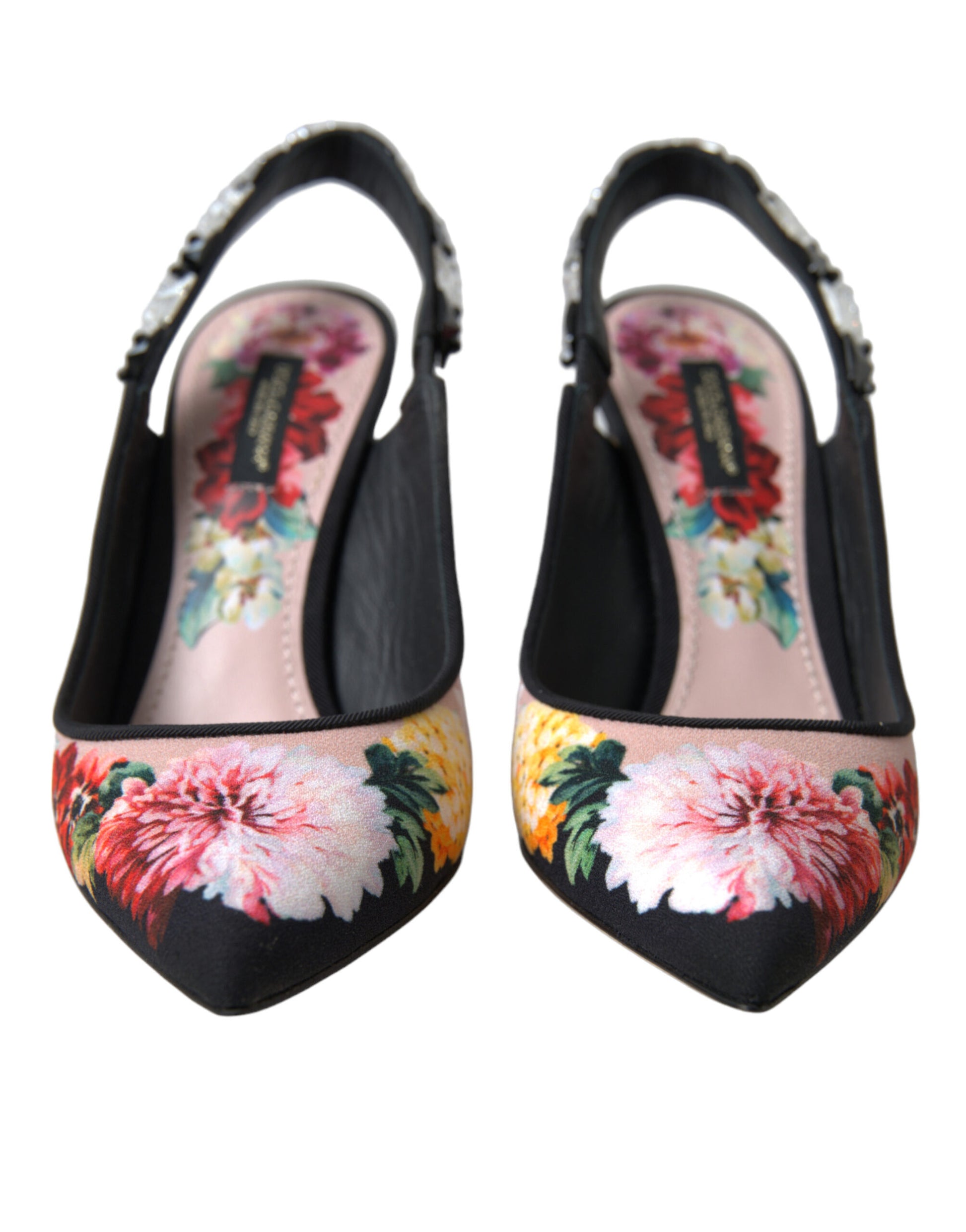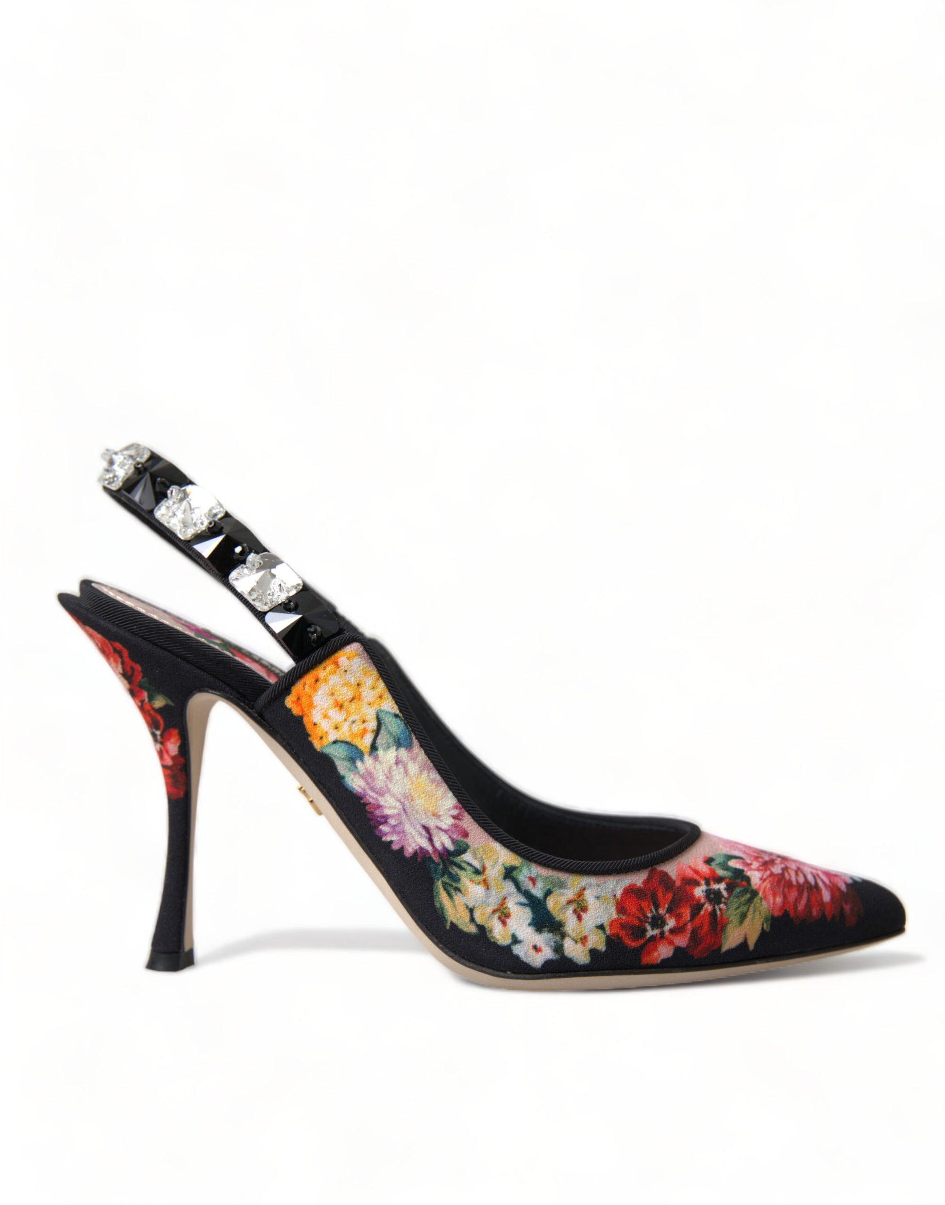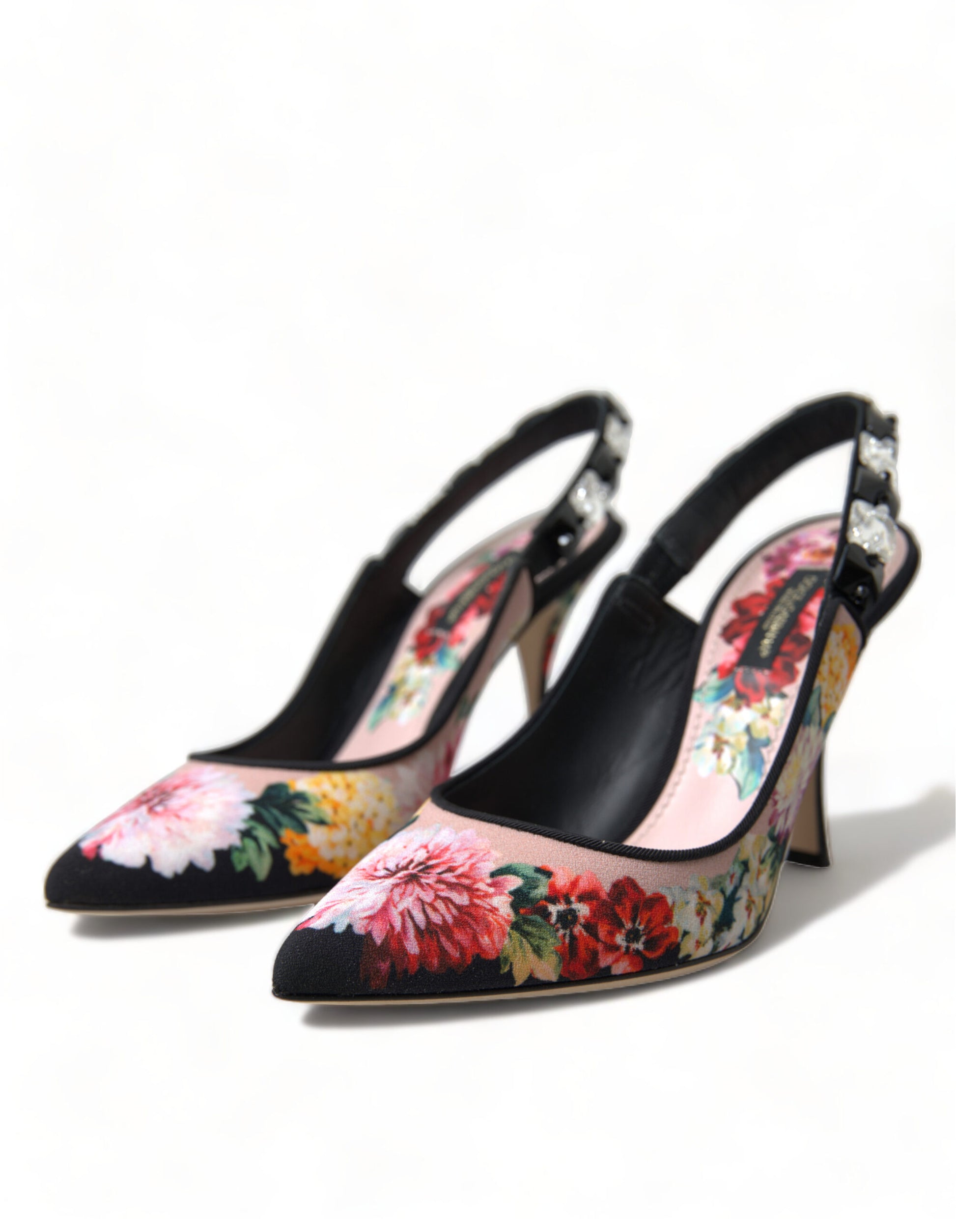 Step into style with these exquisite Floral Slingback Heels, a testament to the sophisticated craftsmanship of Dolce & Gabbana. Adorned with a vibrant multicolor floral print, these shoes are the epitome of elegance. The black base is elegantly contrasted with white and black crystals that catch the light with every step. The pair is completed with a luxurious leather sole, ensuring both high quality and comfort. Perfect for adding a touch of glamour to any outfit, these heels are crafted in Italy, promising to bring a sophisticated edge to your footwear collection.