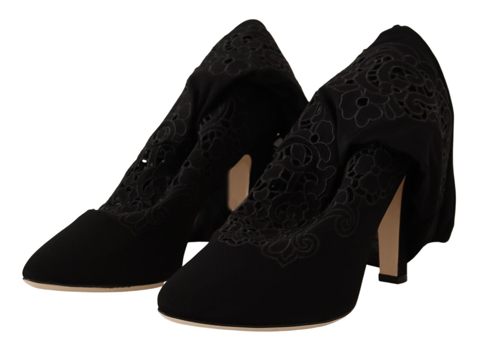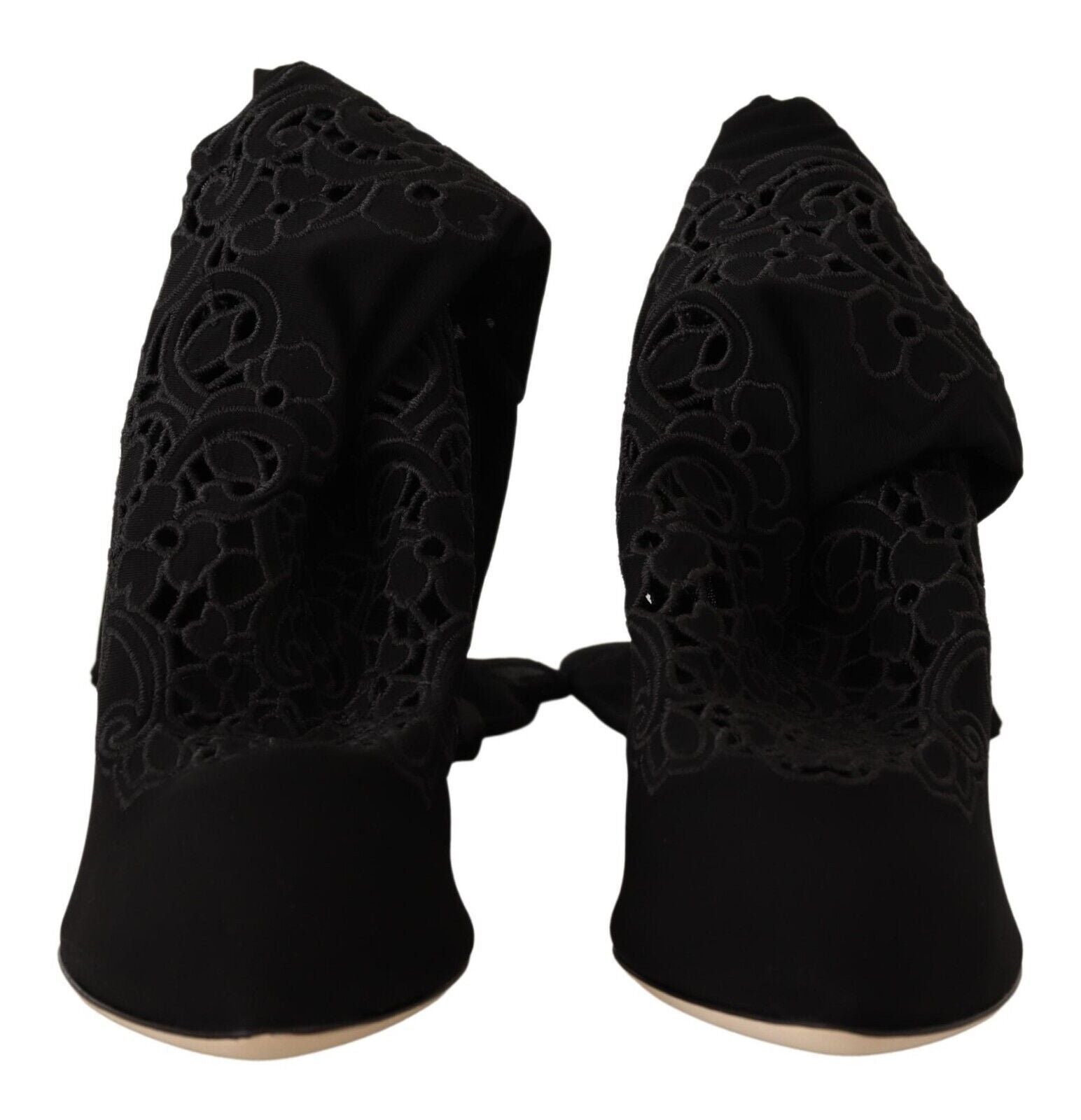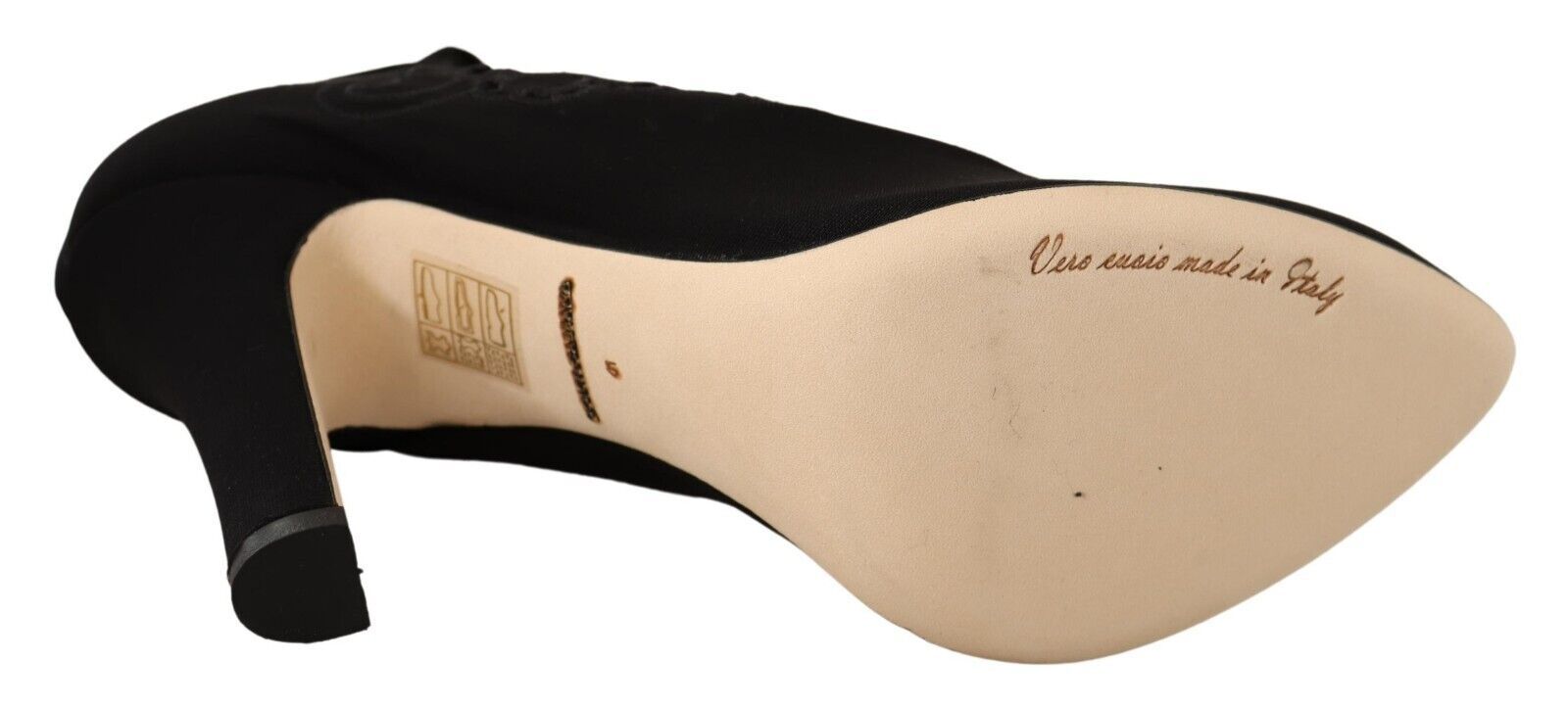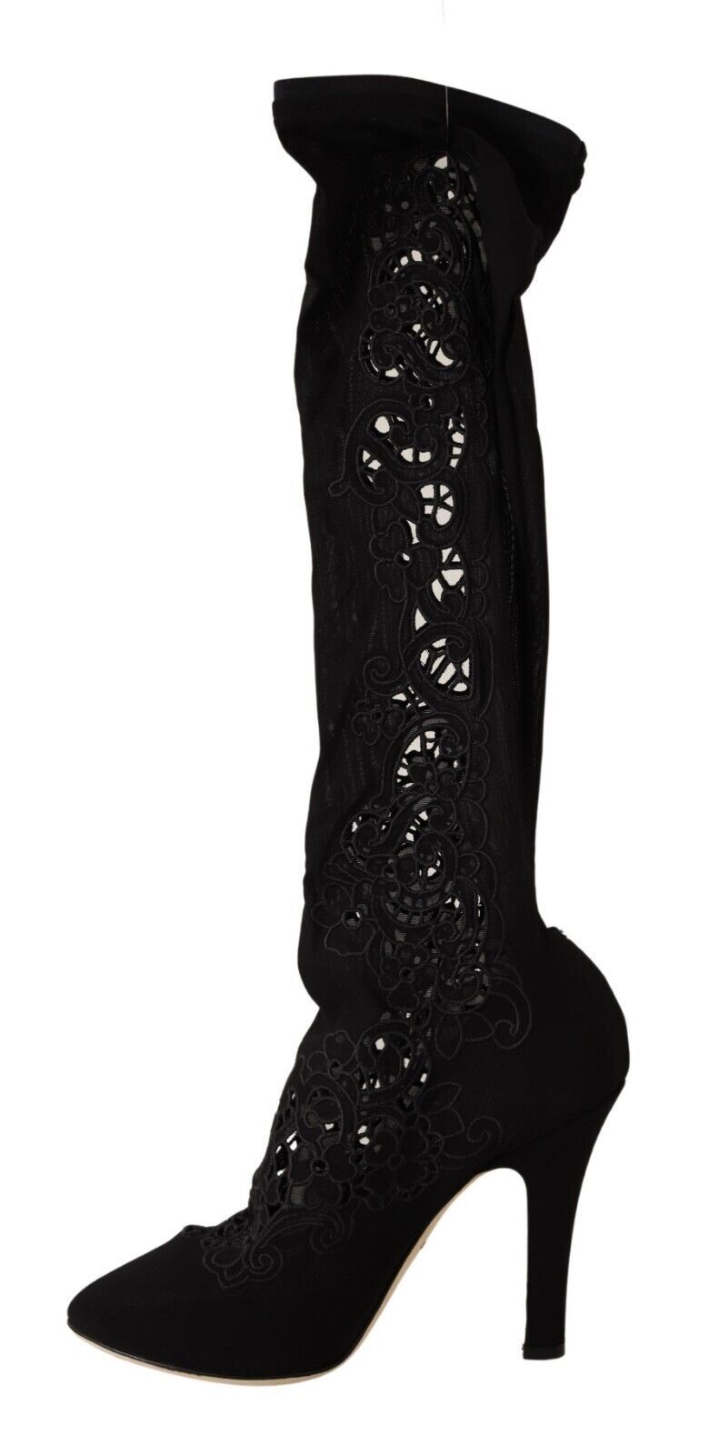 Step into luxury with these stunning Dolce &Gabbana Elastic Sock Pumps. Featuring a gorgeous floral design against a sleek black background, these boots blend comfort with high-end fashion. Impeccably crafted in Italy, with a leather bottom sole for durability and logo details for an exclusive touch, they’re perfect for stylish ladies seeking to make a statement.