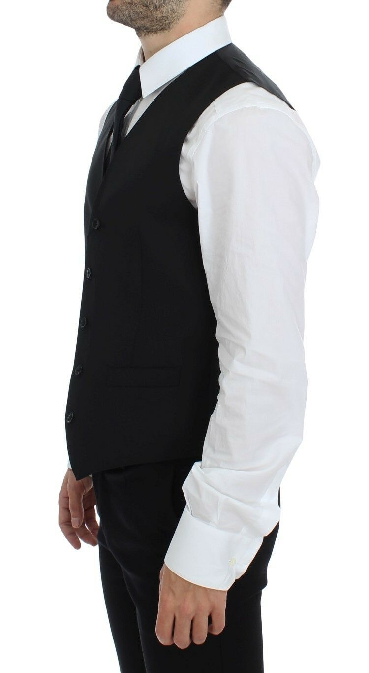 Embrace sophistication with the Dolce & Gabbana black dress vest, a timeless piece for men who value classic style and superior quality. Designed for the sartorial gentleman, this single-breasted waistcoat is crafted from 100% wool, offering unmatched comfort and durability. With features like a full front button closure, an adjustable back waist strap for a custom fit, and the signature logo details, this vest is made to leave an impression. Perfect for formal events or elevating your professional wardrobe, this vest represents Italian craftsmanship at its finest, proudly made in Italy.