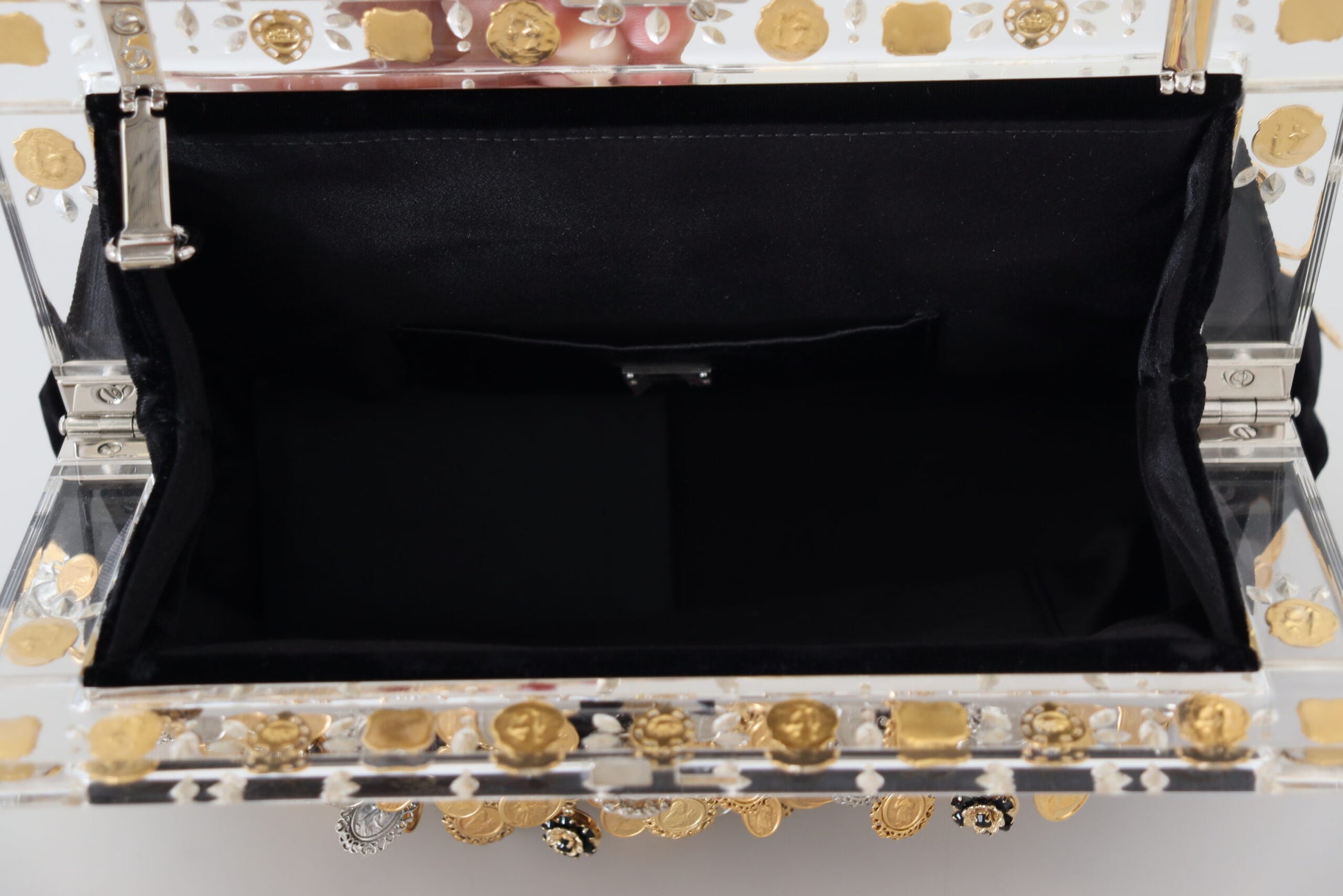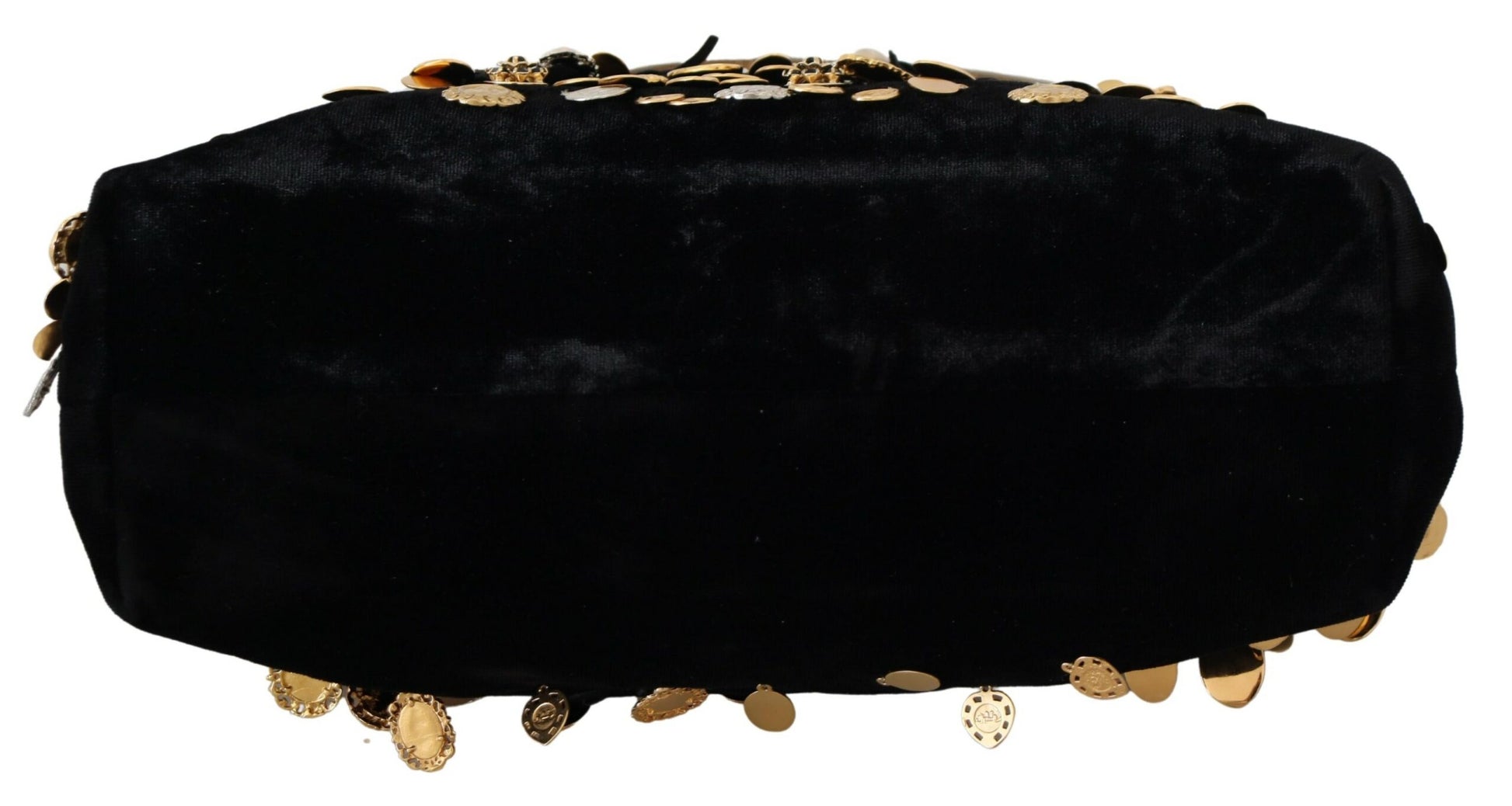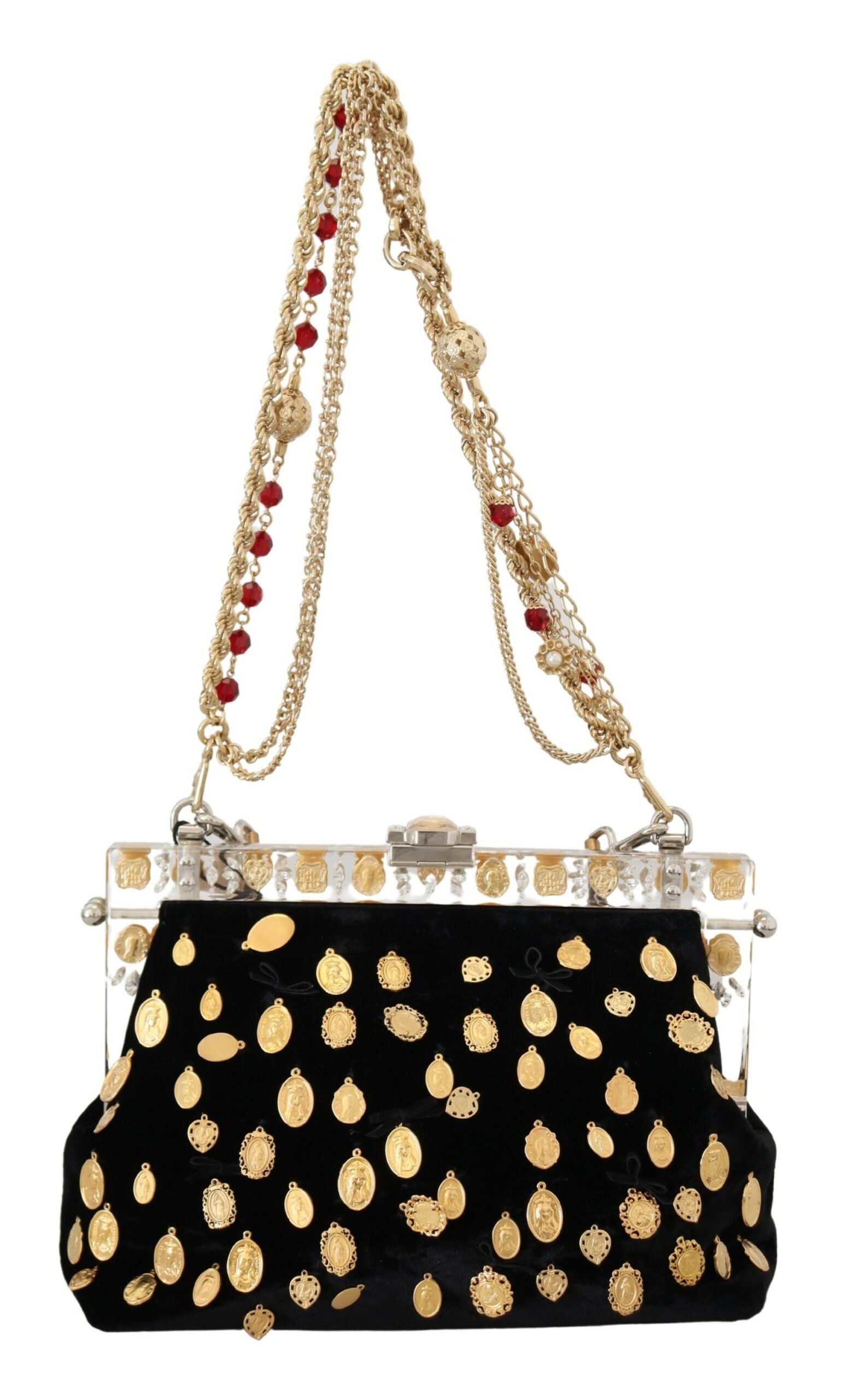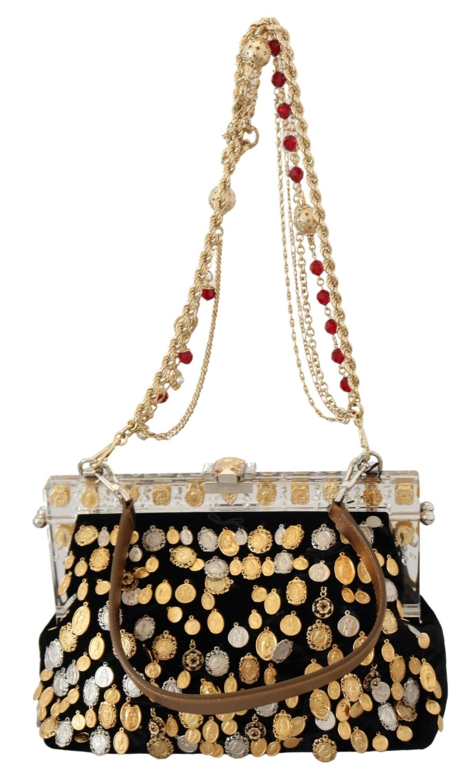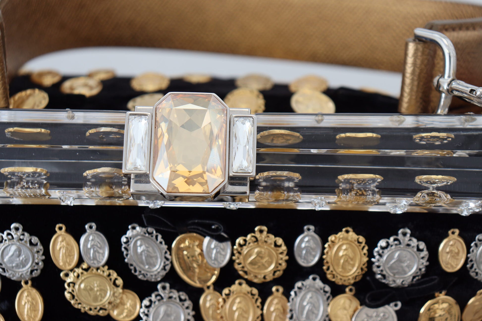 Indulge in the opulent touch of an authentic Dolce & Gabbana evening bag. Perfect for exclusive events, the VANDA style offers a sumptuous blend of black velvet with exquisite silver and gold metal detailing. This clutch seamlessly transitions into a shoulder bag with its detachable chain, providing versatility for your night out. Lined with elegant black silk, it boasts a luxurious feel both inside and out. Expertly crafted in Italy, it promises to add a touch of sophistication to your soirée.