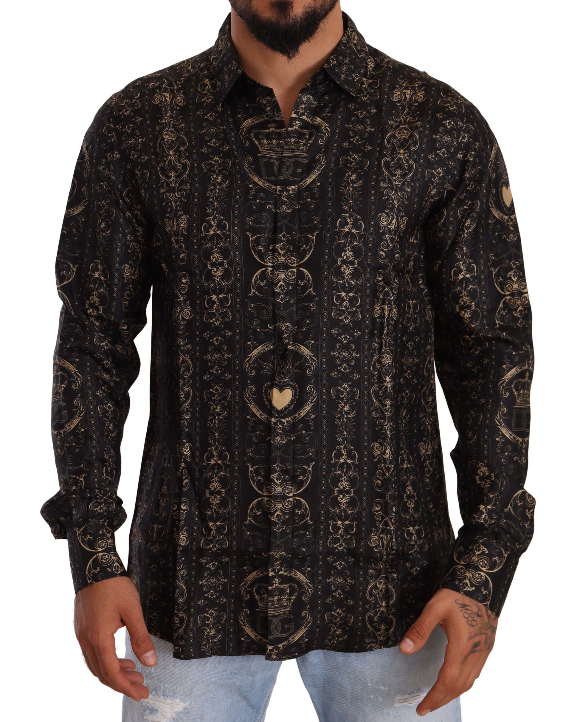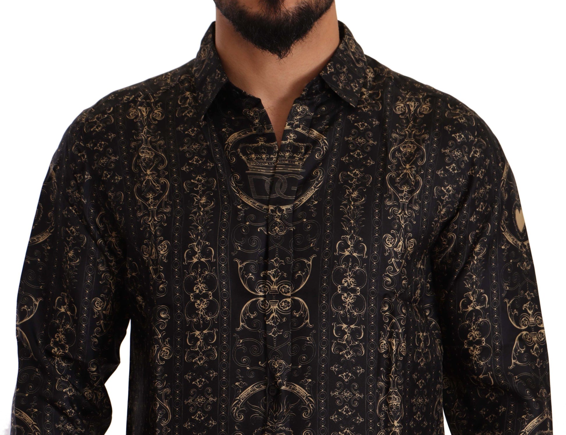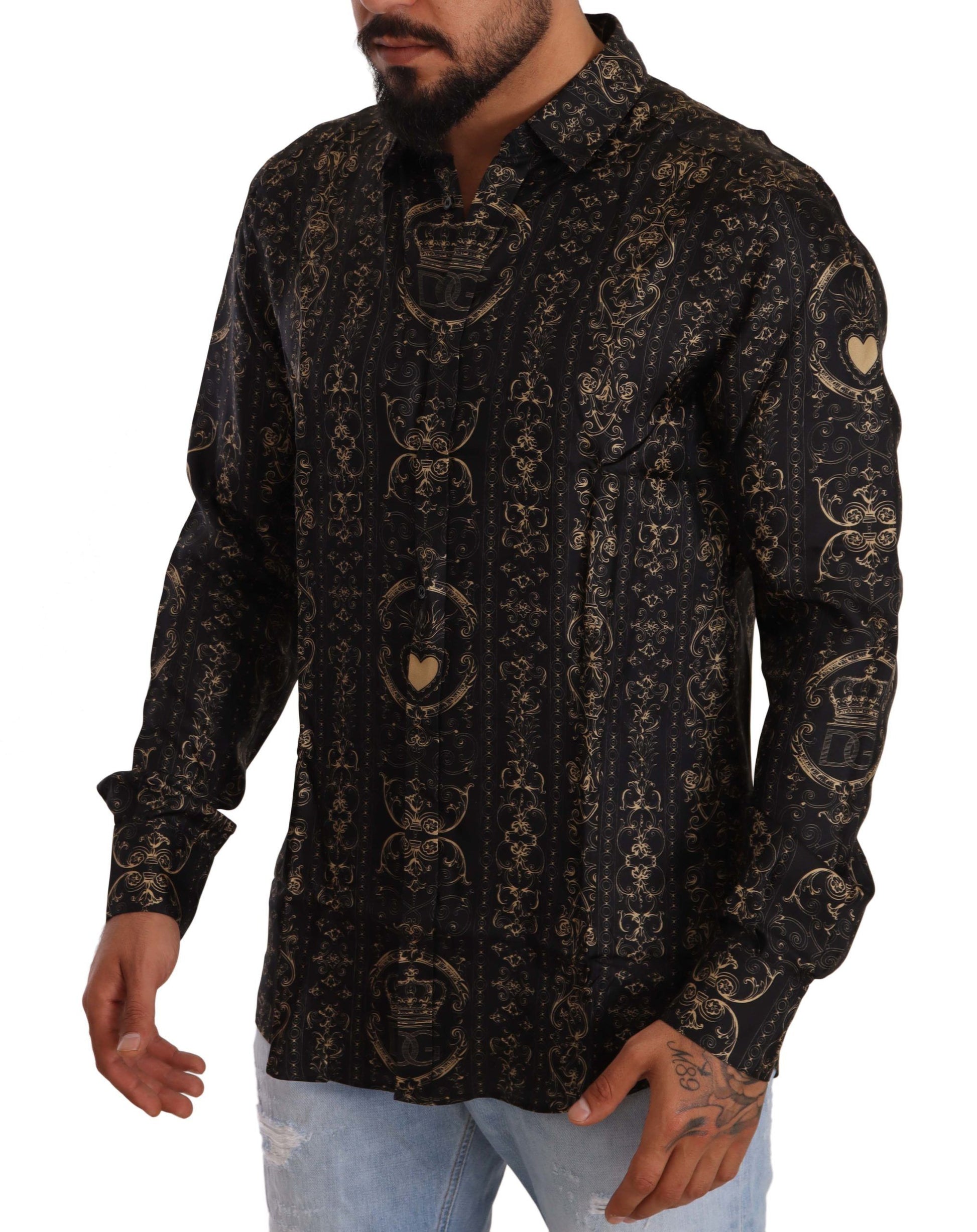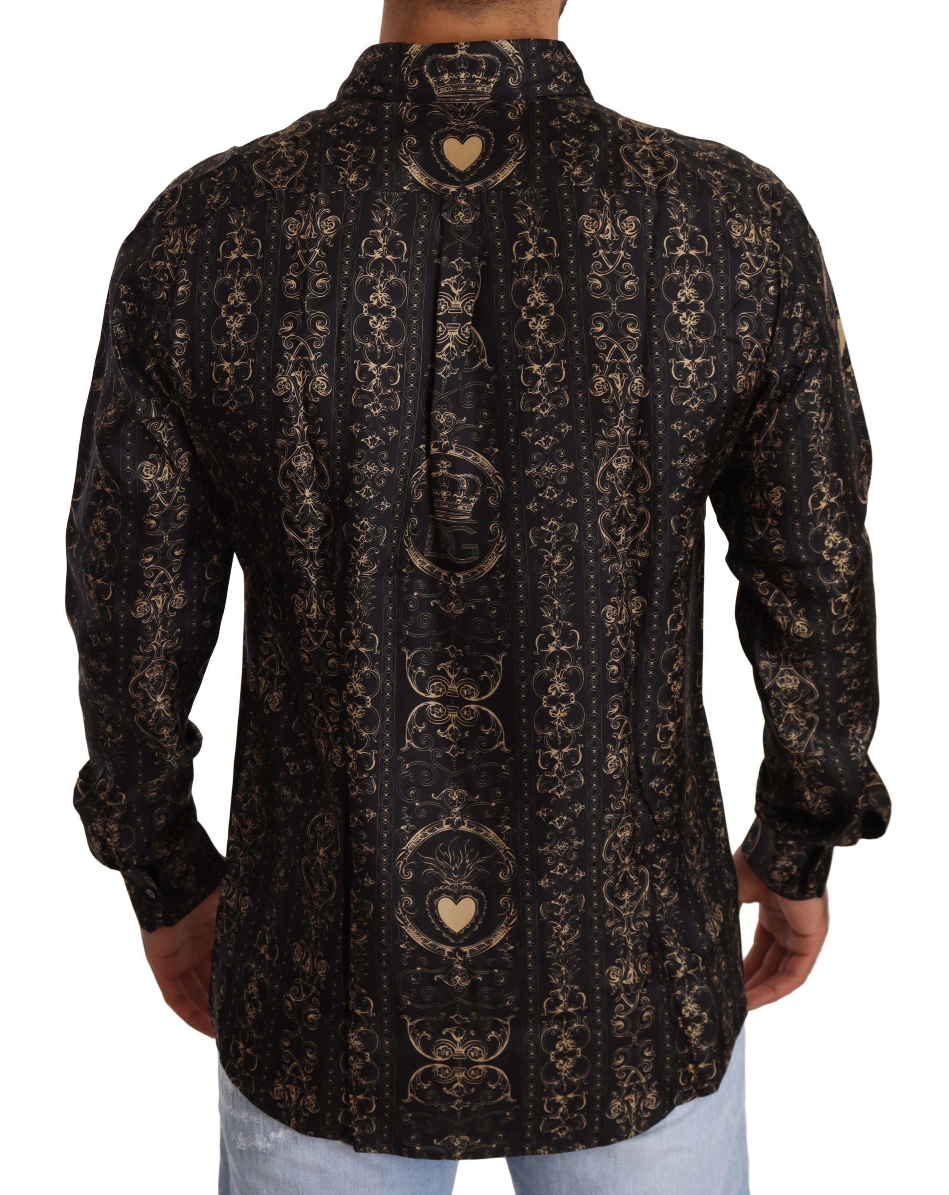 Elevate your wardrobe with the luxurious touch of Dolce & Gabbana’s stunning silk Martini dress shirt. This 100% authentic, brand new piece boasts an eye-catching logo, crown, and heart print, set against a rich black and gold canvas. It features a classic collar, sophisticated long sleeves, and a sleek button-down closure. Perfectly tailored with a slim fit, this Italian-made masterpiece adds an air of elegance to any ensemble.