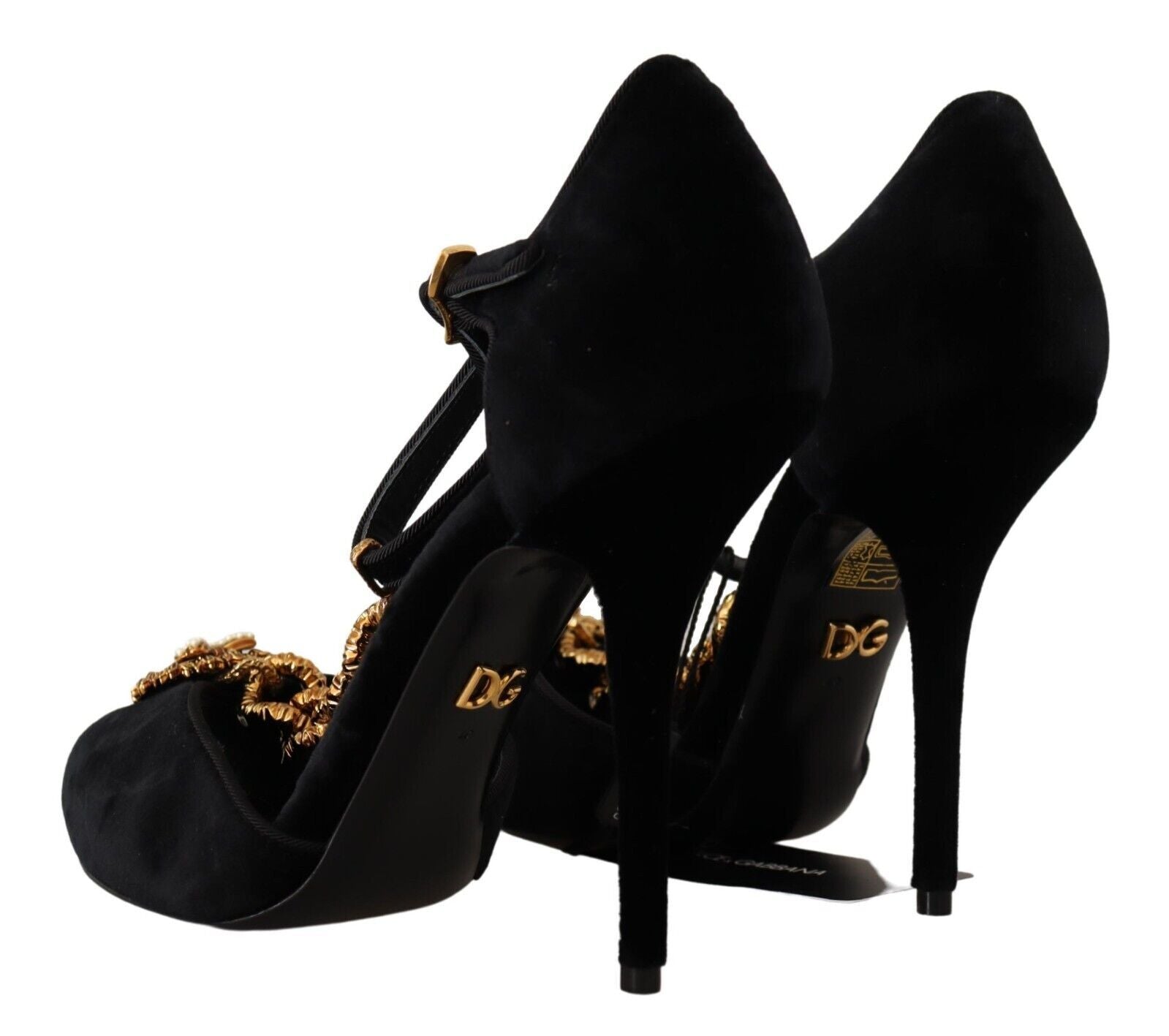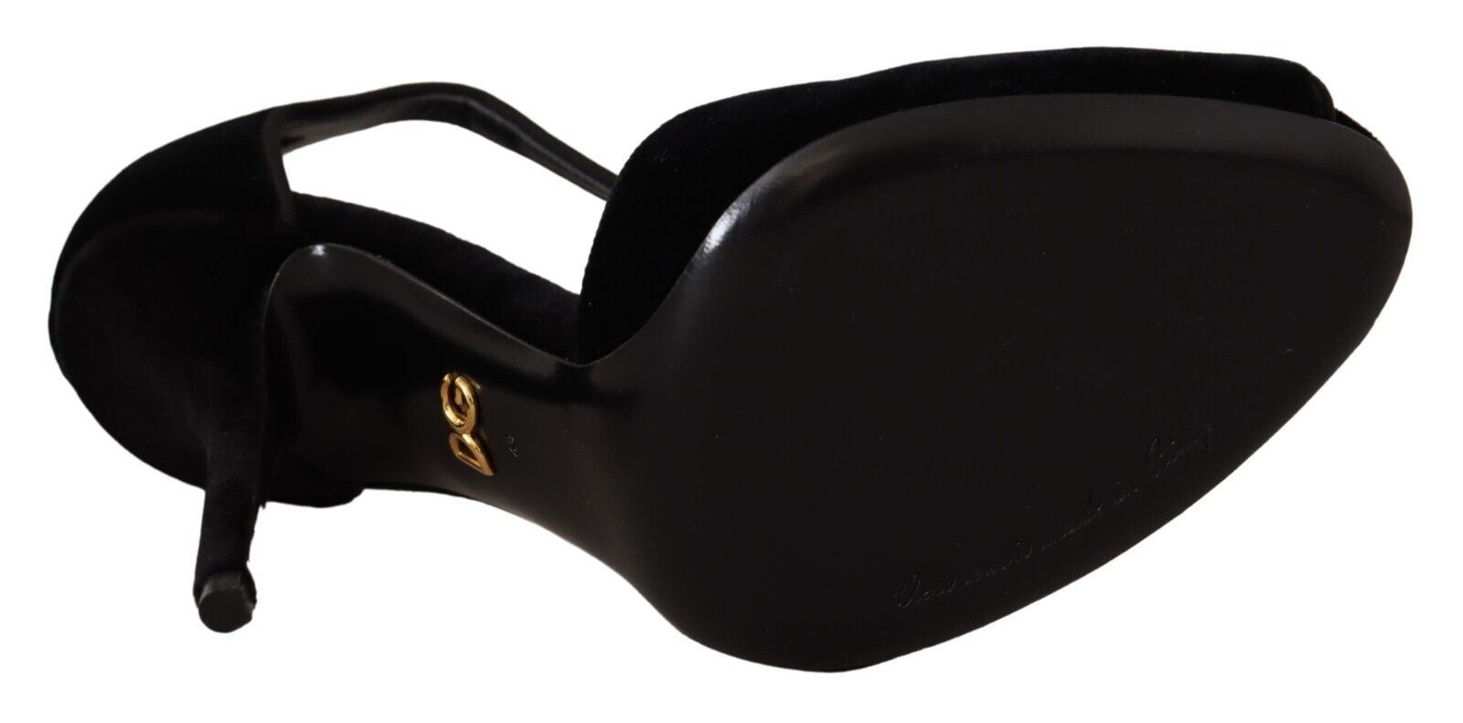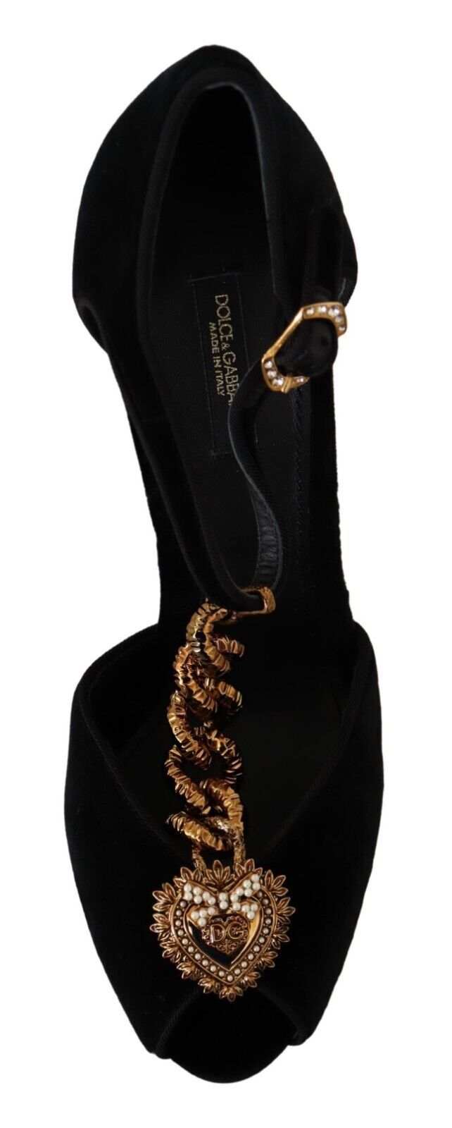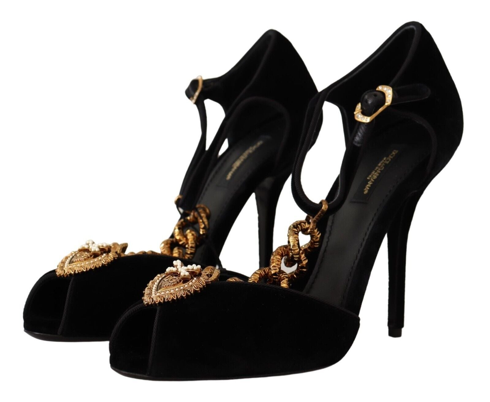 Elevate your style with a touch of elegance and romance, courtesy of Dolce & Gabbana. These stunning black velvet Devotion sandals are a testament to Italian luxury, featuring a golden heart emblem and meticulous details. Perfect for a dazzling evening event or a sophisticated soiree, they promise to be the centerpiece of your ensemble.