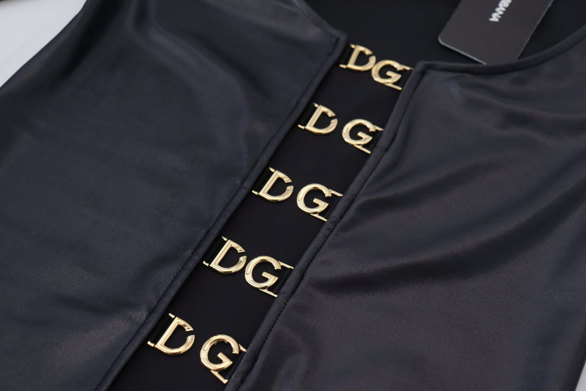 Indulge in the epitome of Italian elegance with this exquisite Dolce & Gabbana 3/4 sleeve blouse. Featuring a sophisticated DG logo buckle closure, this top is a perfect blend of style and comfort. Crafted from a luxurious blend of nylon and elastane, it offers a comfortable fit with a touch of stretch. With its sleek black hue and signature logo details, this blouse is an ideal choice for those seeking high-end fashion with a timeless appeal. Perfect for upscale gatherings or simply elevating your everyday look. Made with care in Italy.