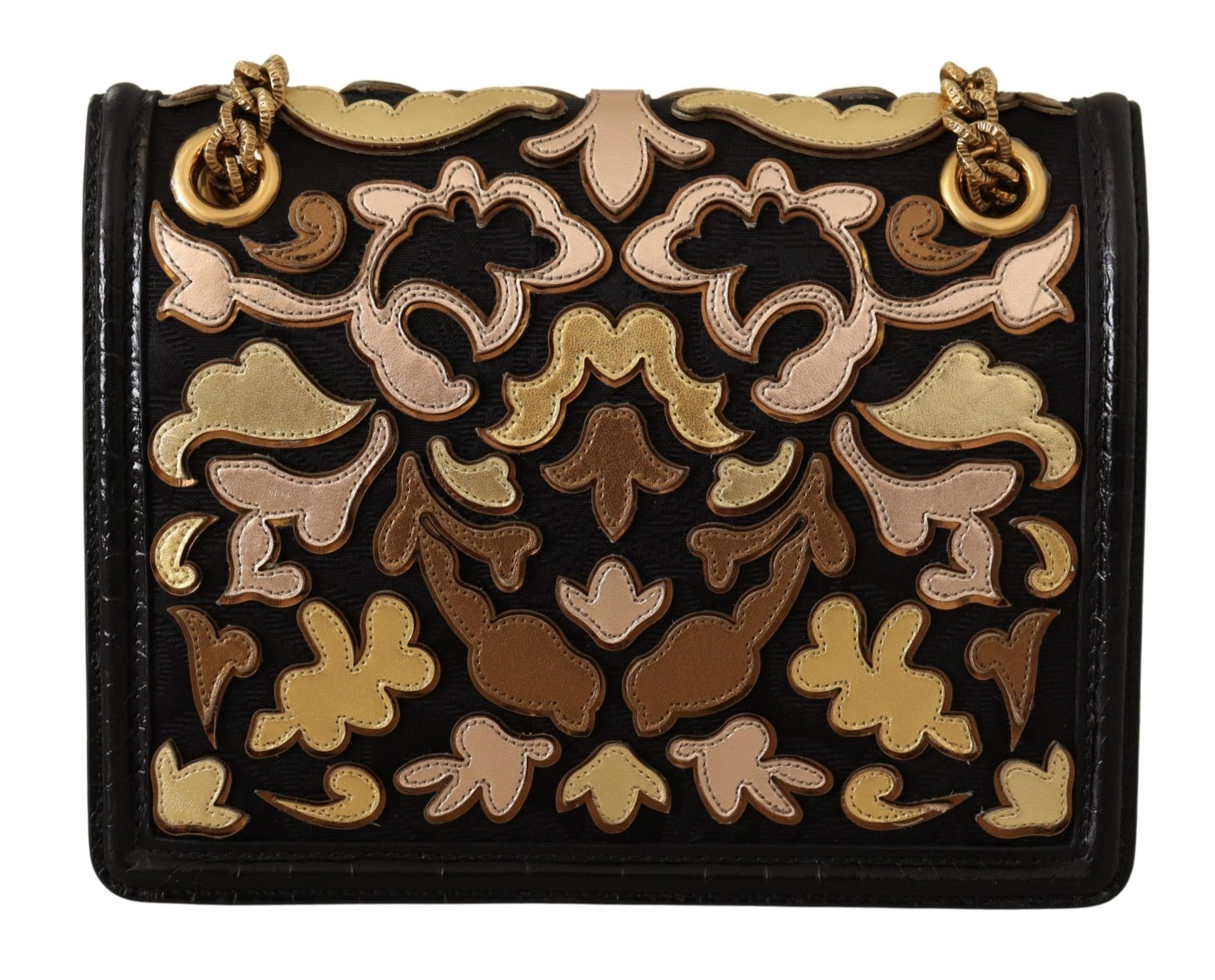 Step out in style with this exquisite gold and black shoulder bag from the beloved Dolce & Gabbana Devotion Collection. This stunning accessory blends fashion-forward design with the brand’s iconic romantic touch, featuring a bejeweled heart with pearl inlay and elegant gold metal detailing. Its sophisticated craftsmanship offers a versatile wear, perfect for transitioning from day to night with its convertible chain strap.