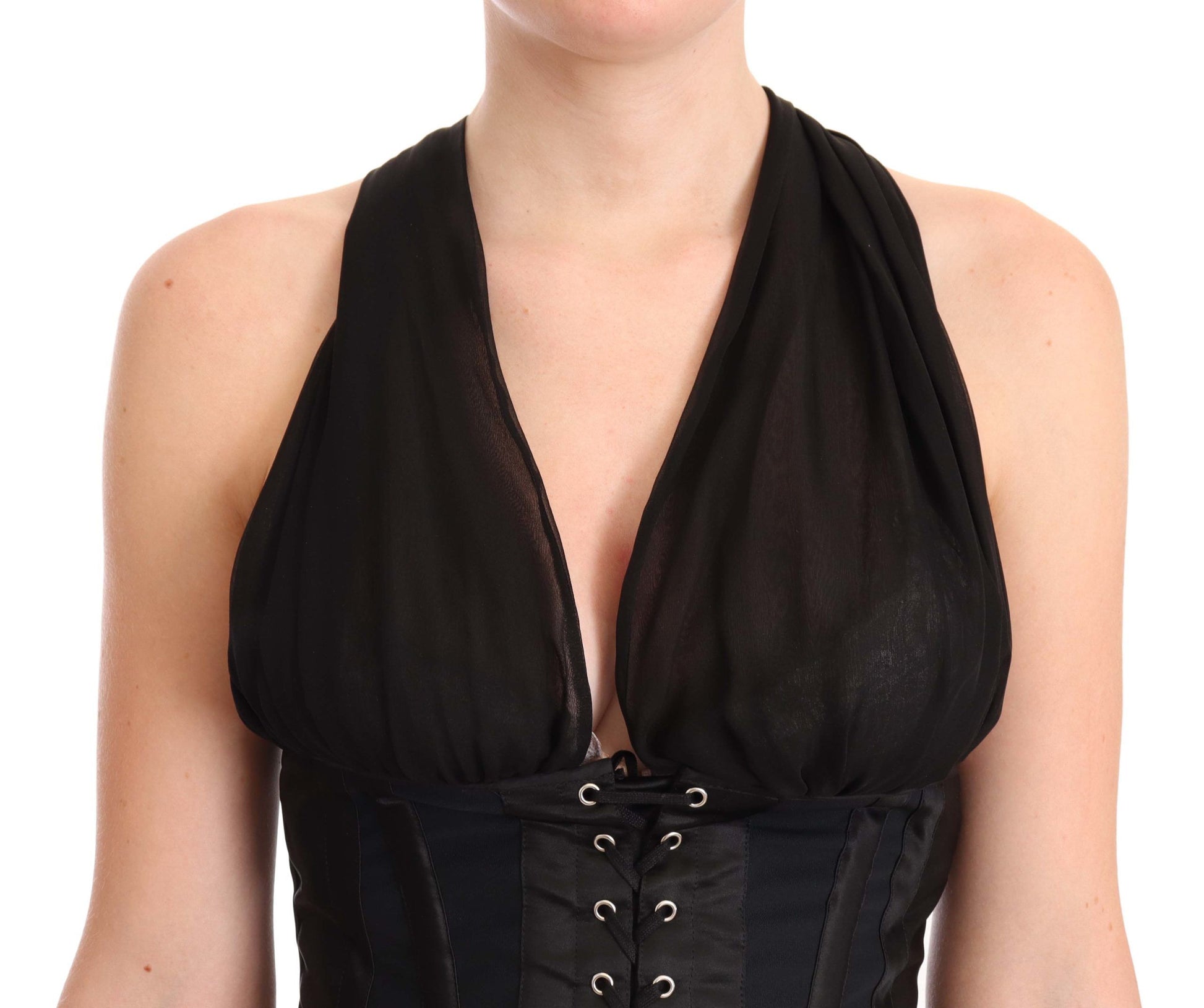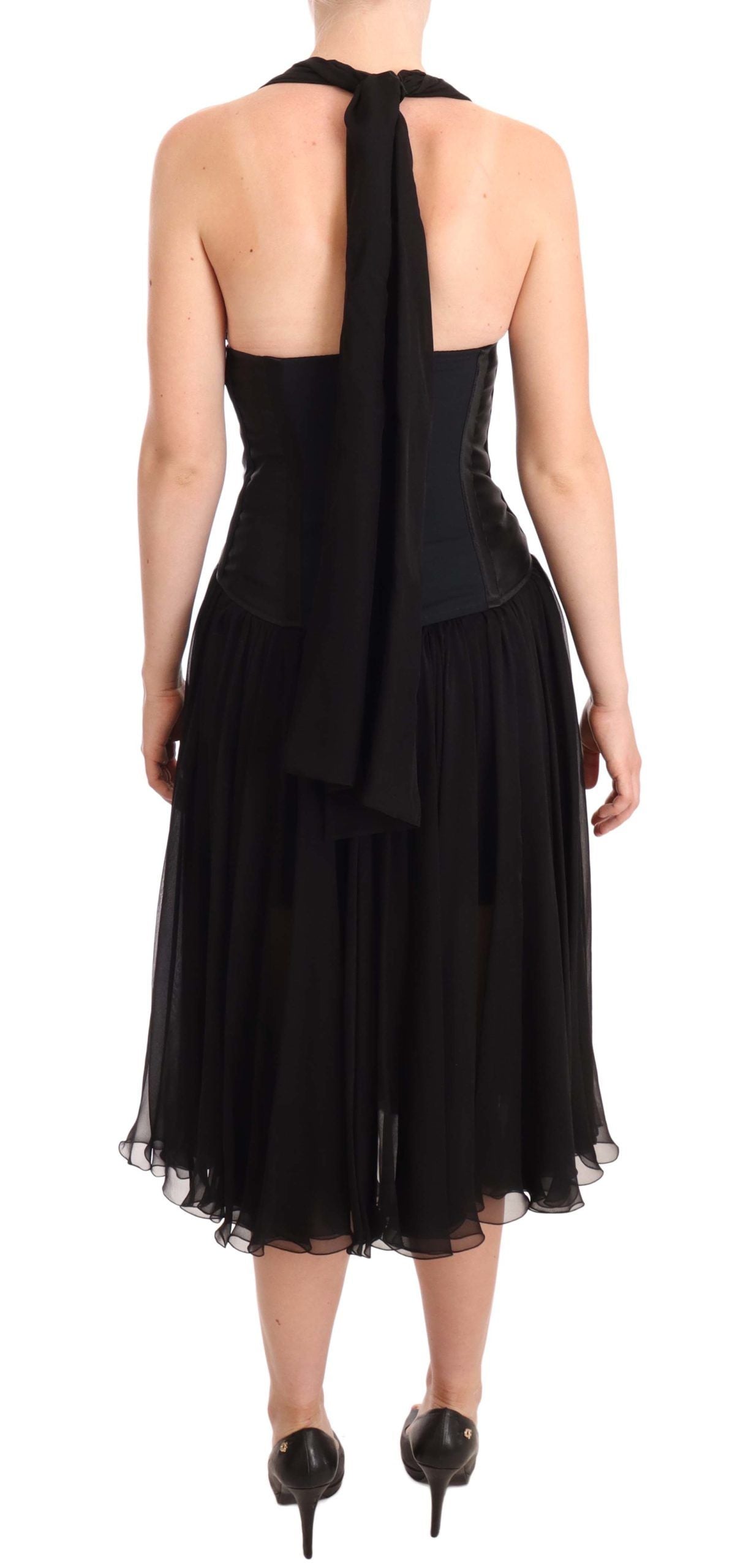Step into the world of high fashion with this stunning Dolce & Gabbana dress. Brand new with tags, this 100% Authentic dress beautifully highlights the feminine silhouette. It features a corset and cutout bodice supported by halter back straps, leading into a graceful midi length with soft pleats. The inner lining is crafted from luxurious black silk stretch, ensuring both comfort and elegance. Its fine craftsmanship makes this dress not just an outfit, but a work of art, perfect for exclusive events. Made in Italy, this dress is a testament to timeless style and exquisite quality.