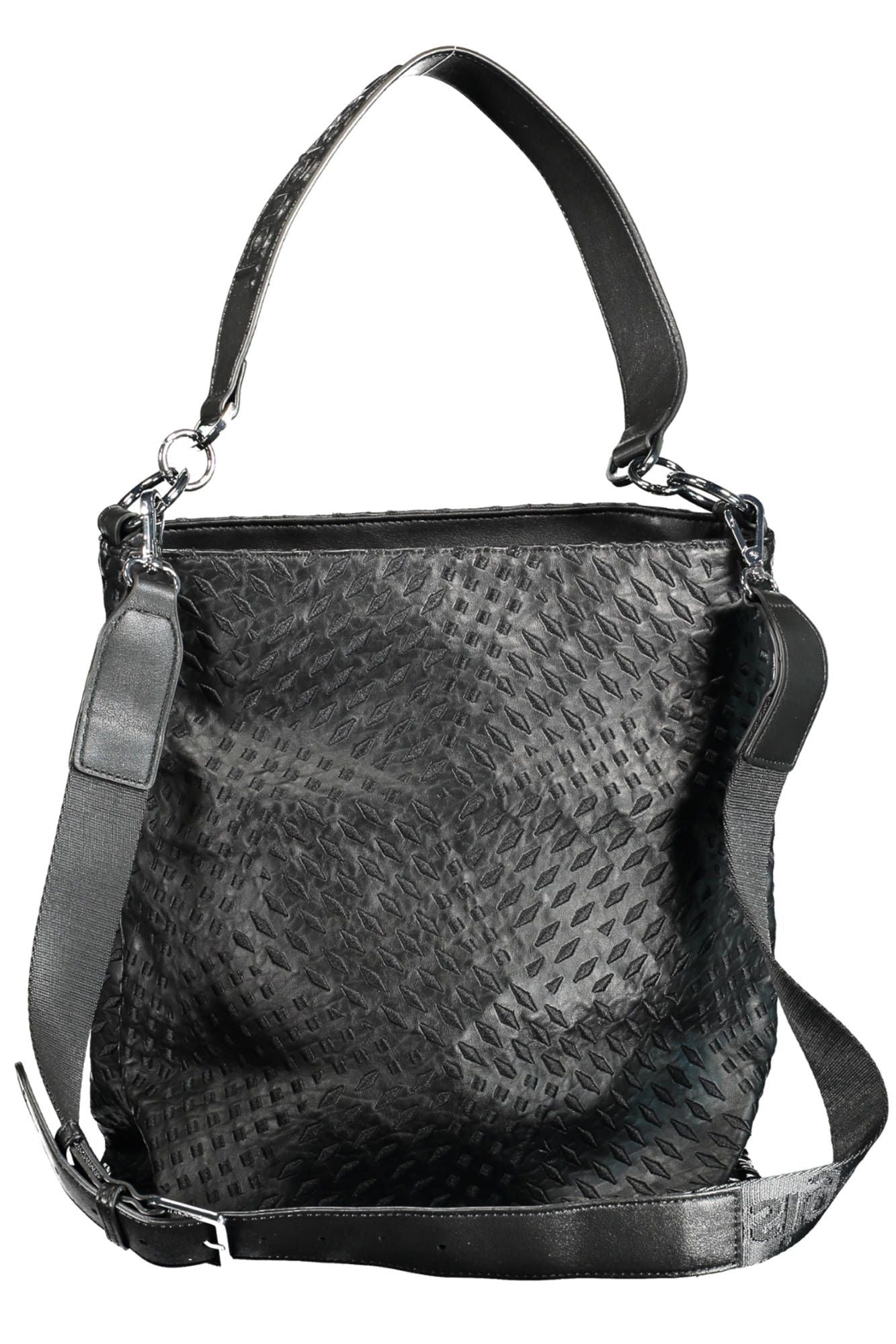 Elevate your accessory game with this iconic Desigual handbag, designed for the woman who dares to stand out. Featuring a versatile removable handle and an adjustable shoulder strap, this piece smoothly transitions from day to night. Impeccably crafted from luxurious polyurethane, it boasts a sleek black hue with contrasting details that make a bold statement. Secure your essentials with the effortless zip closure and organize seamlessly with its handy inside pocket. Emblazoned with the Desigual logo, it’s the epitome of bold and trendy chic.