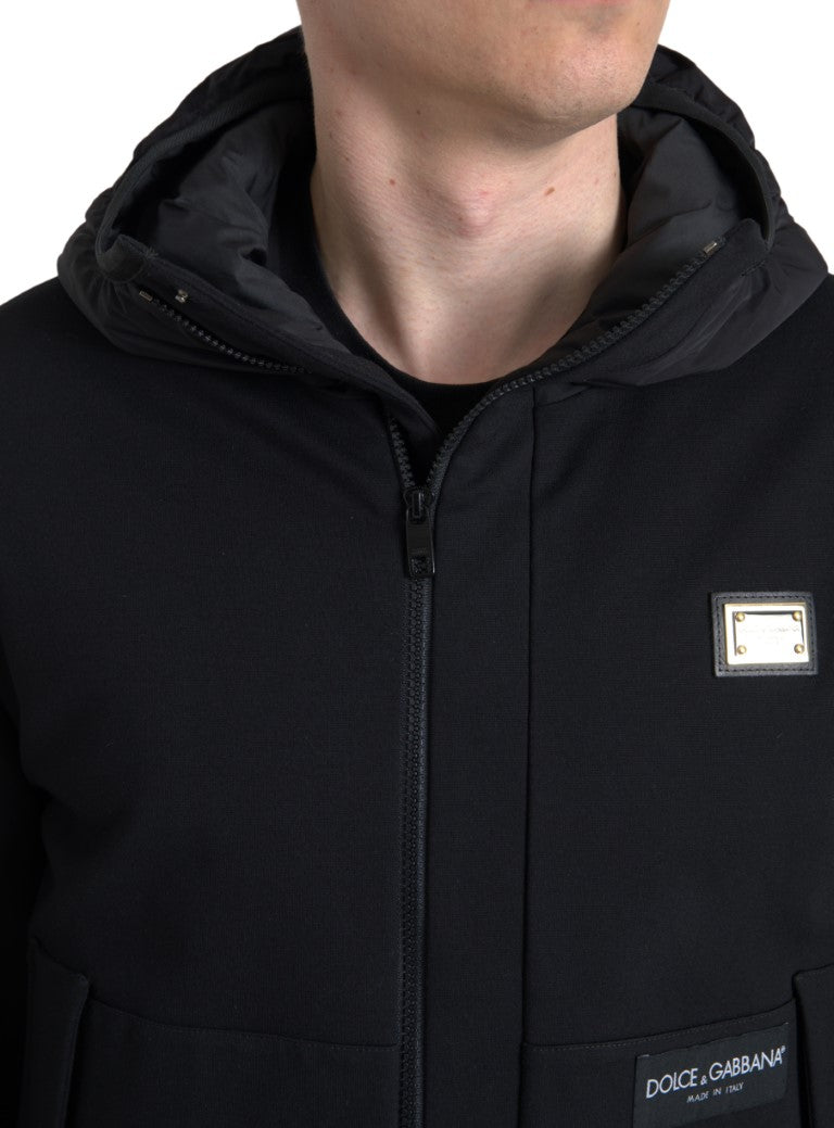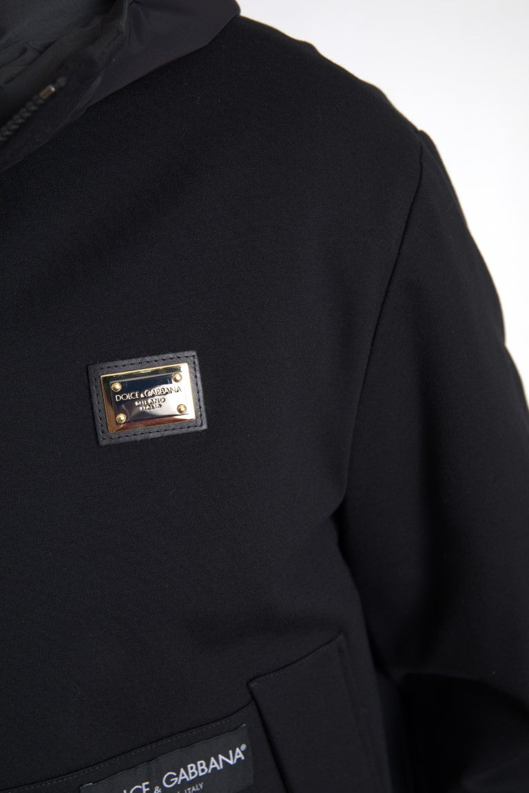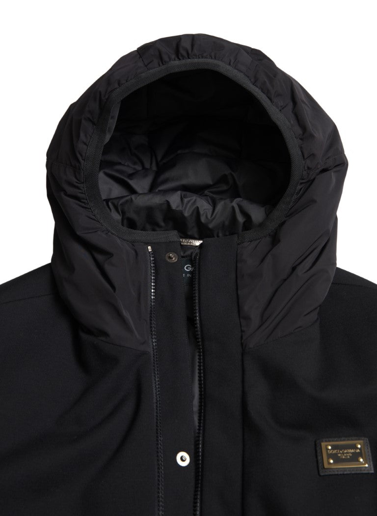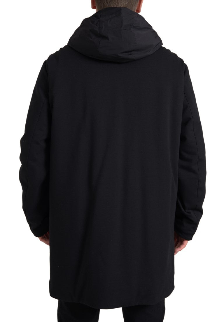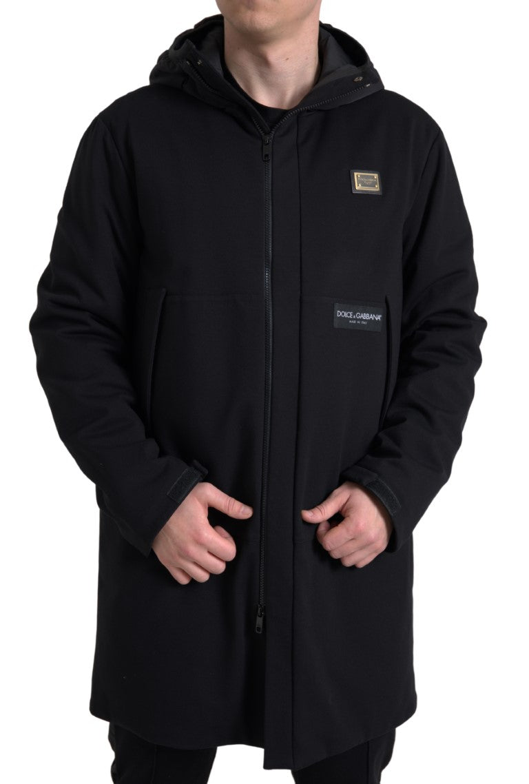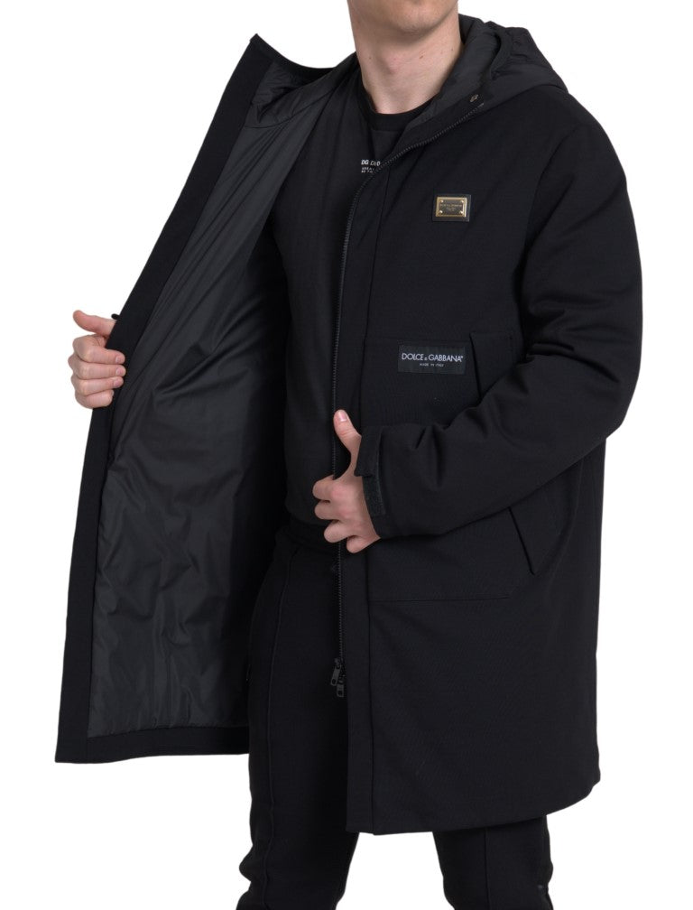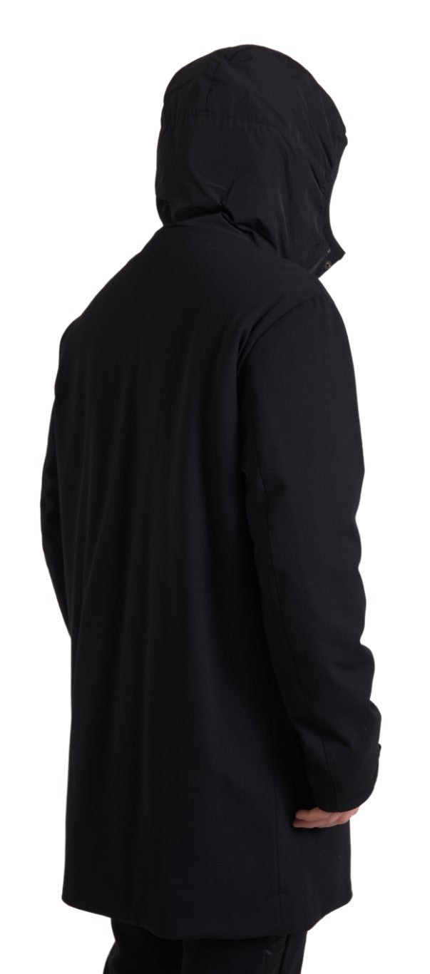 Step out in sophisticated style with this absolutely stunning black hooded trench coat jacket from Dolce & Gabbana. A perfect blend of luxury and functionality, this exclusive piece from the MainLine collection is ideal for fashion-forward individuals seeking to make a statement while staying protected against the elements. Crafted in Italy with meticulous attention to detail, the coat features both button and zipper closure for versatile styling. Its sleek black color ensures it can be paired seamlessly with any outfit, making it a versatile addition to your wardrobe. Discover the ultimate in high-end outerwear with this Dolce & Gabbana creation.