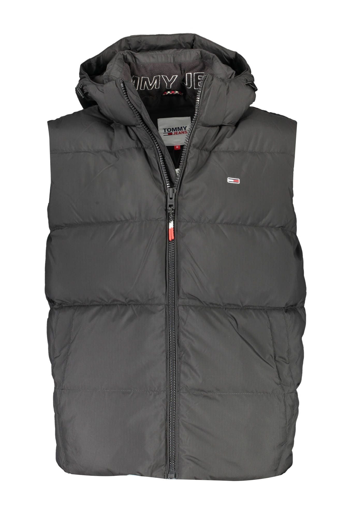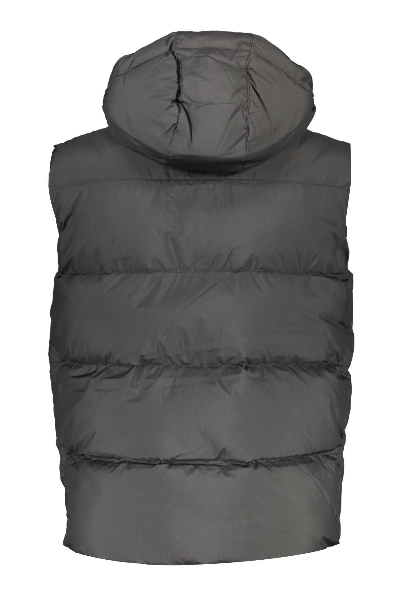 Elevate your cold-weather style with the high-performance sophistication of Tommy Hilfiger’s sleeveless down jacket. Designed for the modern urbanite, this jacket features a practical removable hood and ample pocket space, including two external pockets and a discreet interior pocket for your essentials. Adorned with the iconic Tommy Hilfiger logo, this sleek black garment not only makes a statement but upholds an eco-conscious ethos with its 100% recycled polyester fabric.