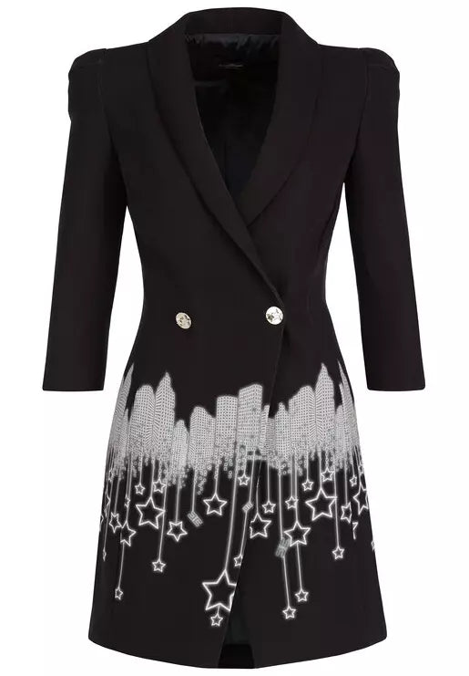 Infuse elegance and a touch of artistic flair into your wardrobe with this exquisite double-breasted jacket. Lined for comfort and adorned with a captivating abstract theme print, this piece is a testament to sophisticated design and fine craftsmanship. Gleaming star buttons add a whimsical touch, ensuring you stand out with every wear. Proudly made in Italy for unmistakable quality.
