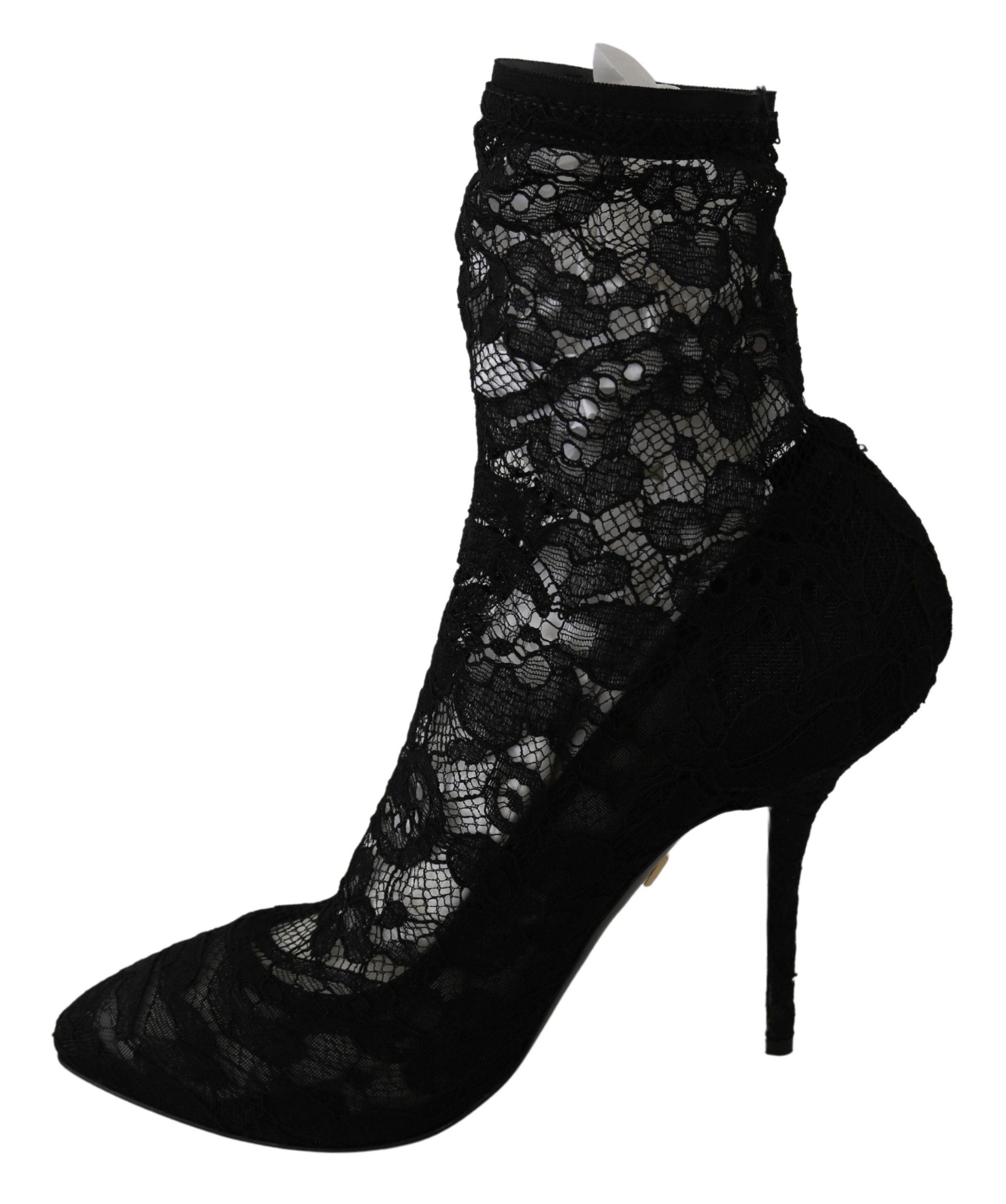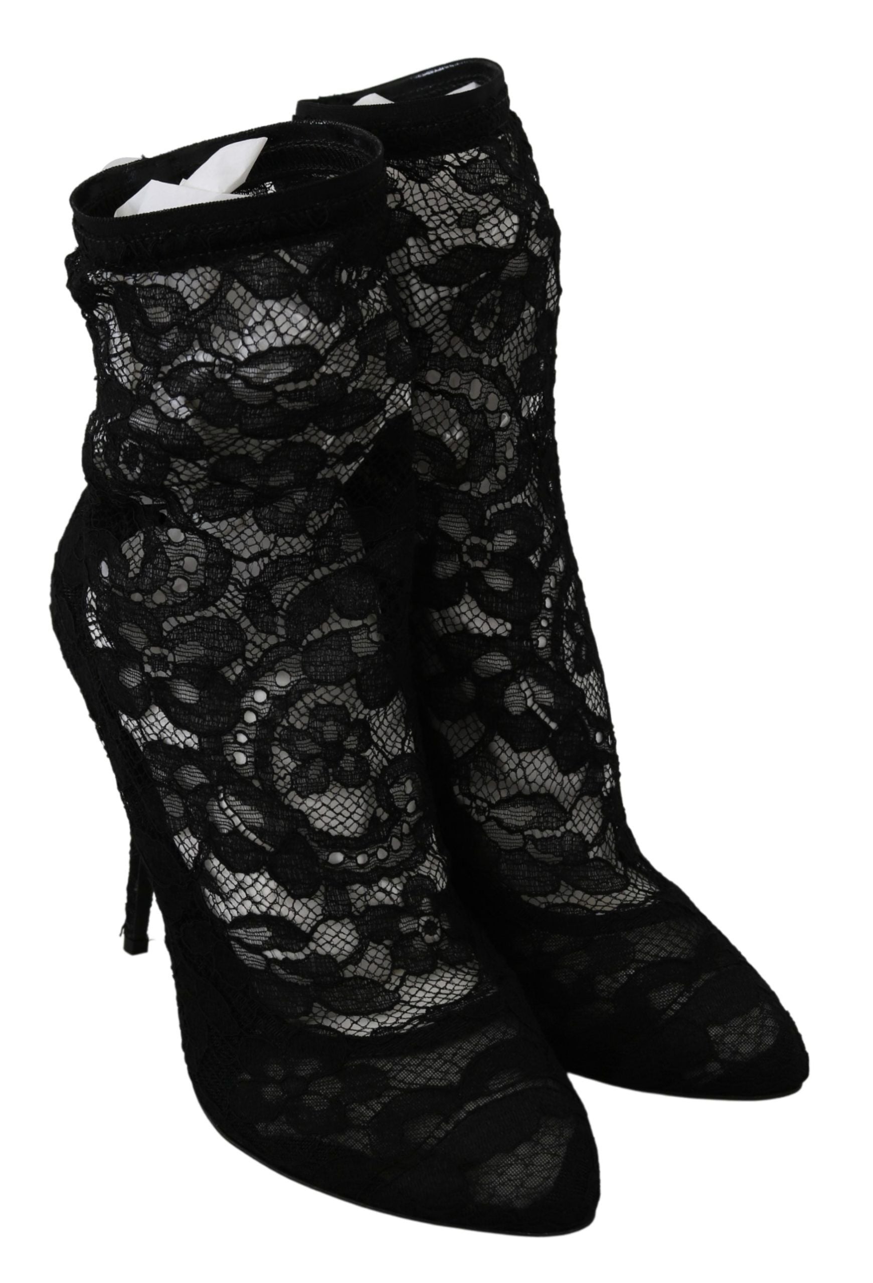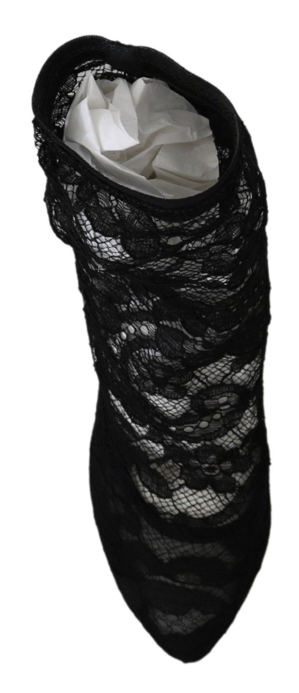 Step into luxury with these stunning Dolce & Gabbana high heel boots. Crafted with utmost precision, they feature delicate nylon floral lace that exudes elegance. Fashioned in a classic black, these boots are perfect for evenings out or adding a touch of sophistication to any outfit. The boots are not only gorgeous but also synonymous with comfort and durability, featuring a leather sole that promises to carry you with grace. Each step you take will showcase the intricate details and the iconic logo that is subtly placed for an exclusive feel. Embrace Italian craftsmanship and make a statement with these exquisite lace boots from Dolce & Gabbana.