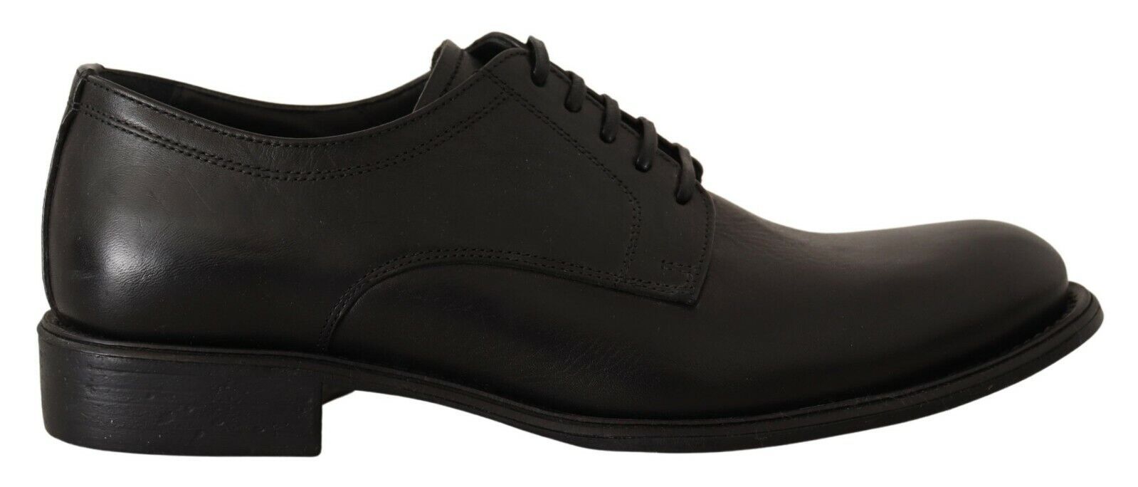 Step into sophistication with these brand new, 100% Authentic Derby formal shoes from Dolce & Gabbana. Perfect for any formal occasion, these shoes boast exquisite craftsmanship and an undeniable elegance with a sleek black leather finish. Made in Italy, they feature a classic lace-up closure, leather sole, and inner lining, all adorned with the subtle logo details that speak of luxury. Your stride will be the epitome of style and comfort.