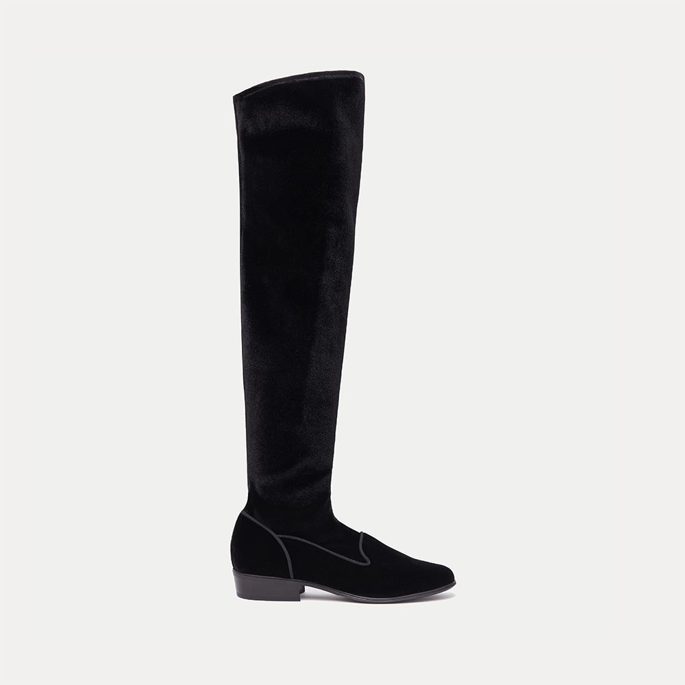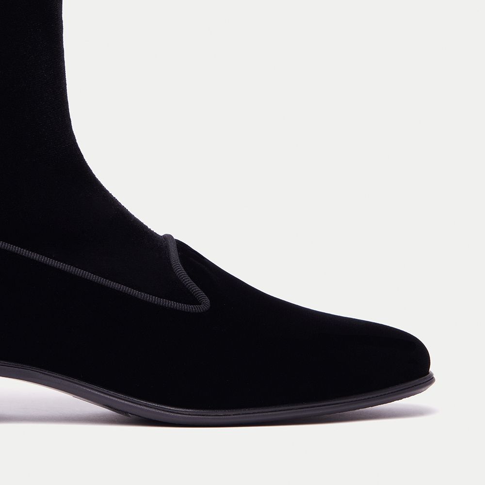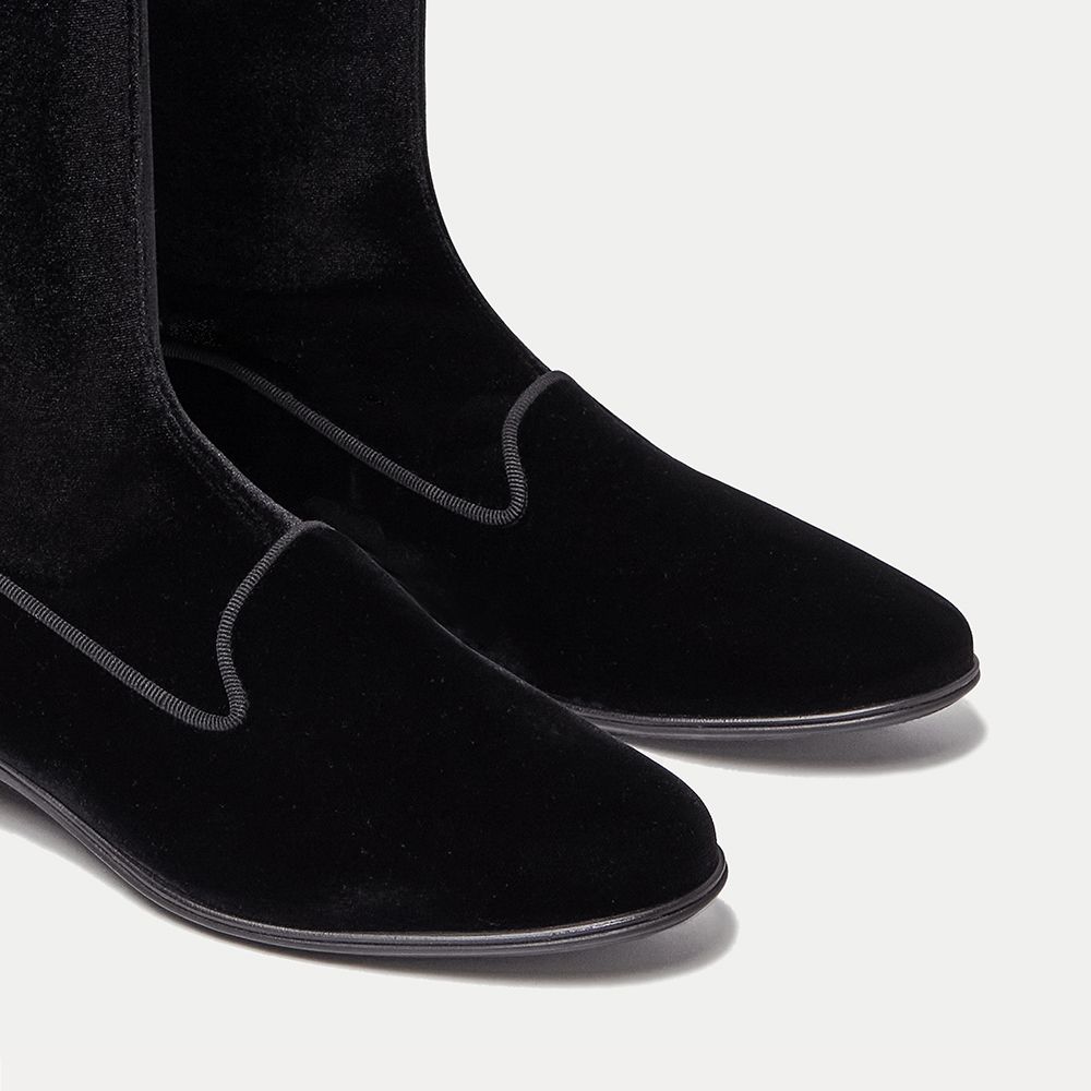 Step into sophistication with these Grace Velvet ankle boots by Charles Philip . Designed with the modern woman in mind, these black leather boots blend elegance with comfort. Handmade in Italy, they feature a long elasticated knee-high design and a luxurious leather upper. The heel height is a comfortable 3 cm, paired with a non-slip rubber sole. Inside, the leather lining and insole offer a premium feel, while the cotton heel pad ensures maximum comfort for all-day wear.
