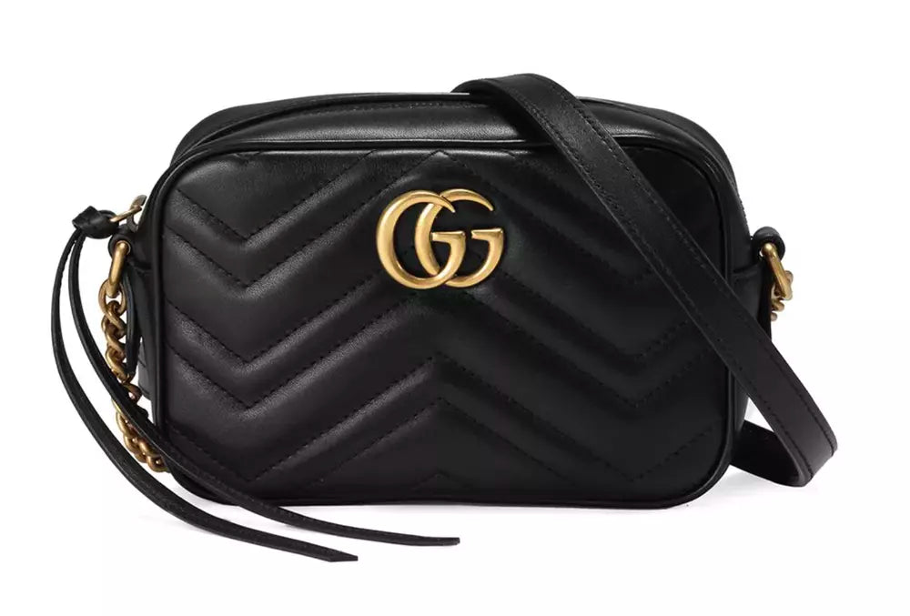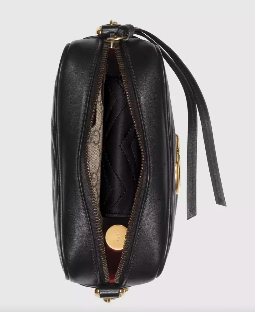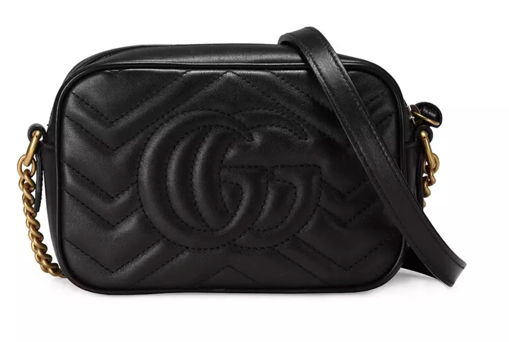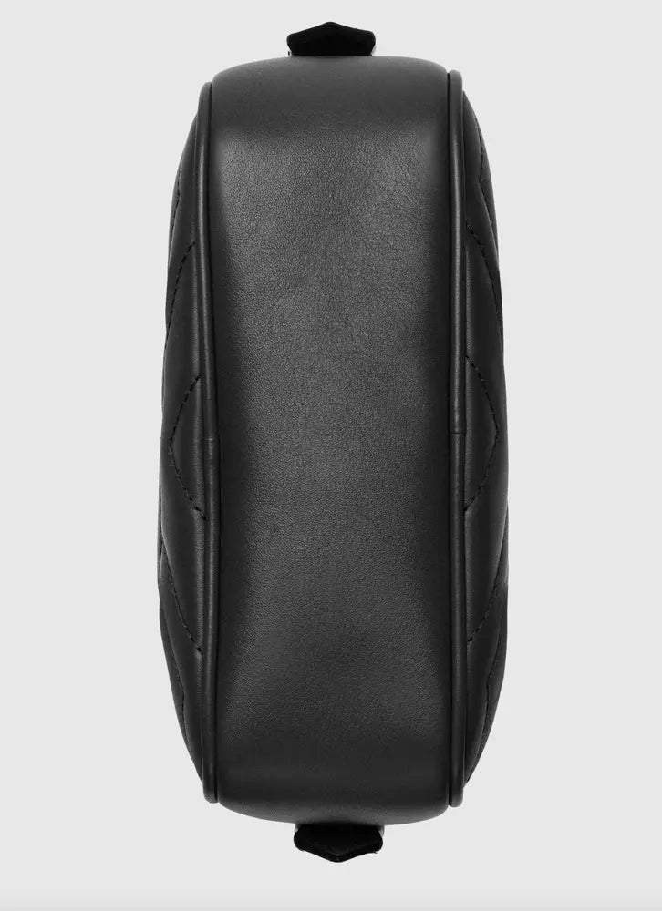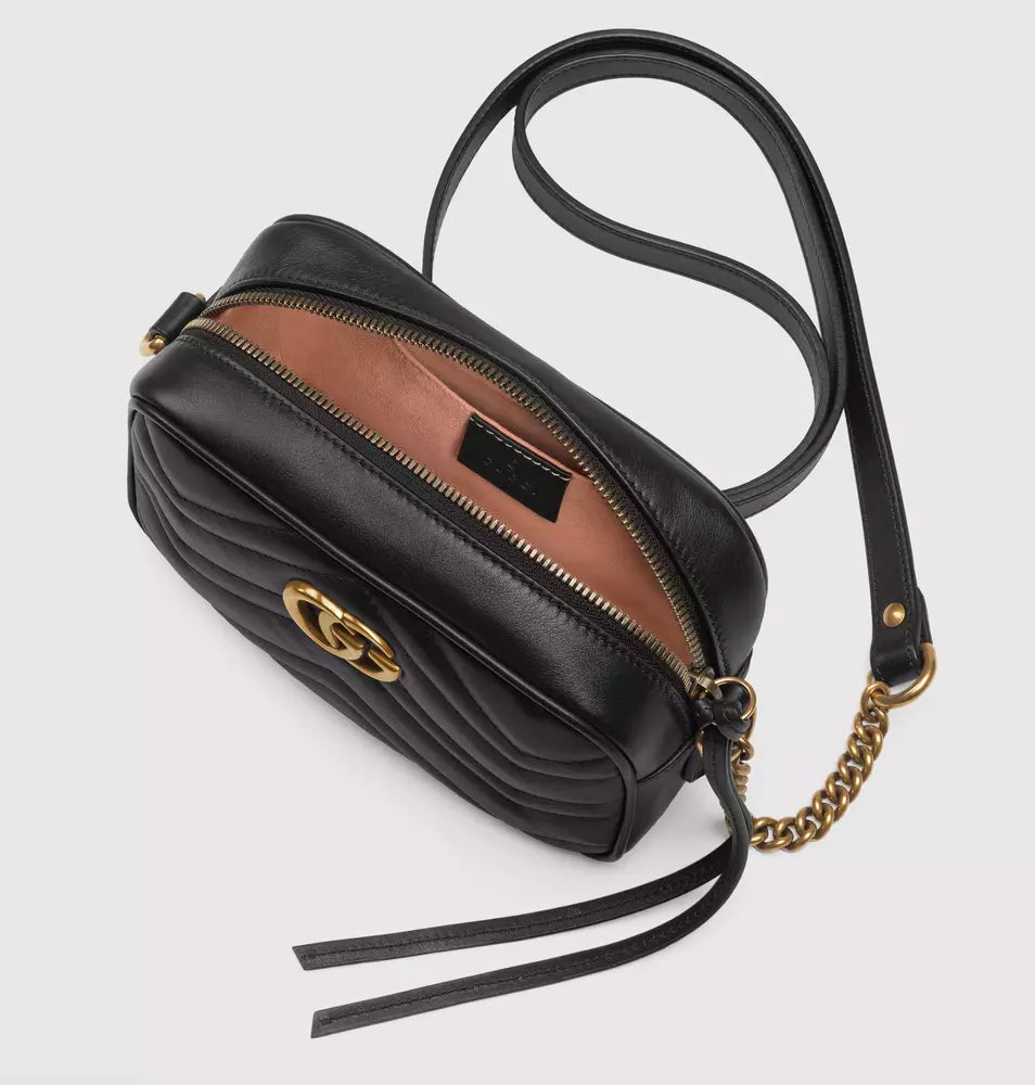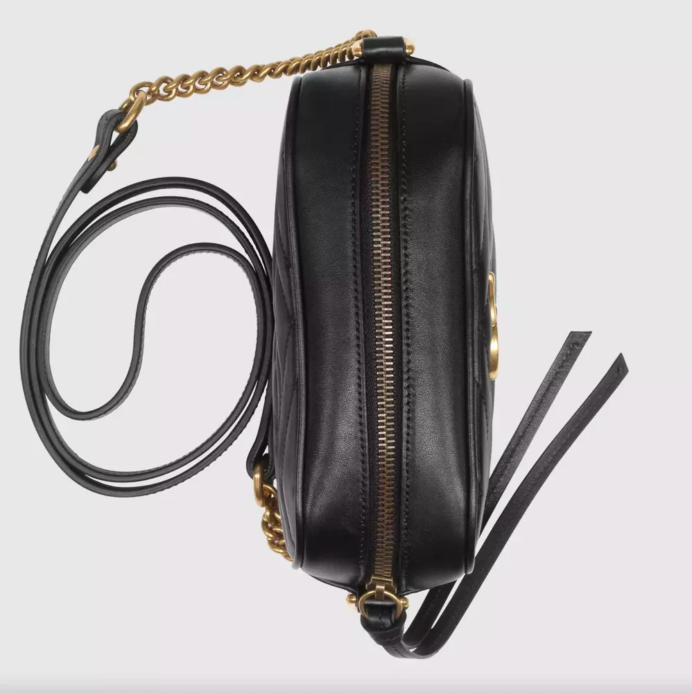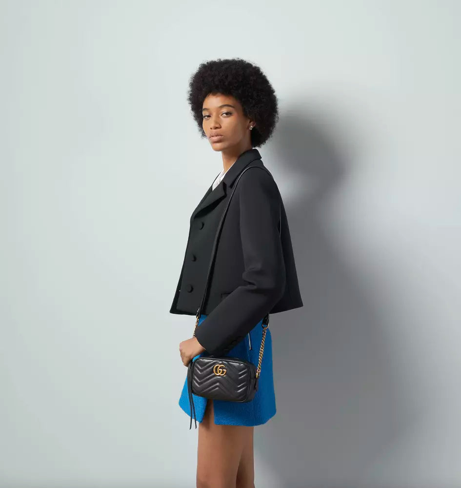 Experience luxury and style with our mini size chevron quilted leather shoulder bag. Its exquisite chain design and Double G detail epitomize sophistication. The bag’s compact form is complemented by a practical top zipper closure, while the chain strap’s leather detail ensures comfortable wear. With its iconic quilting and GG motif, this bag is a statement piece for any fashion-forward wardrobe.