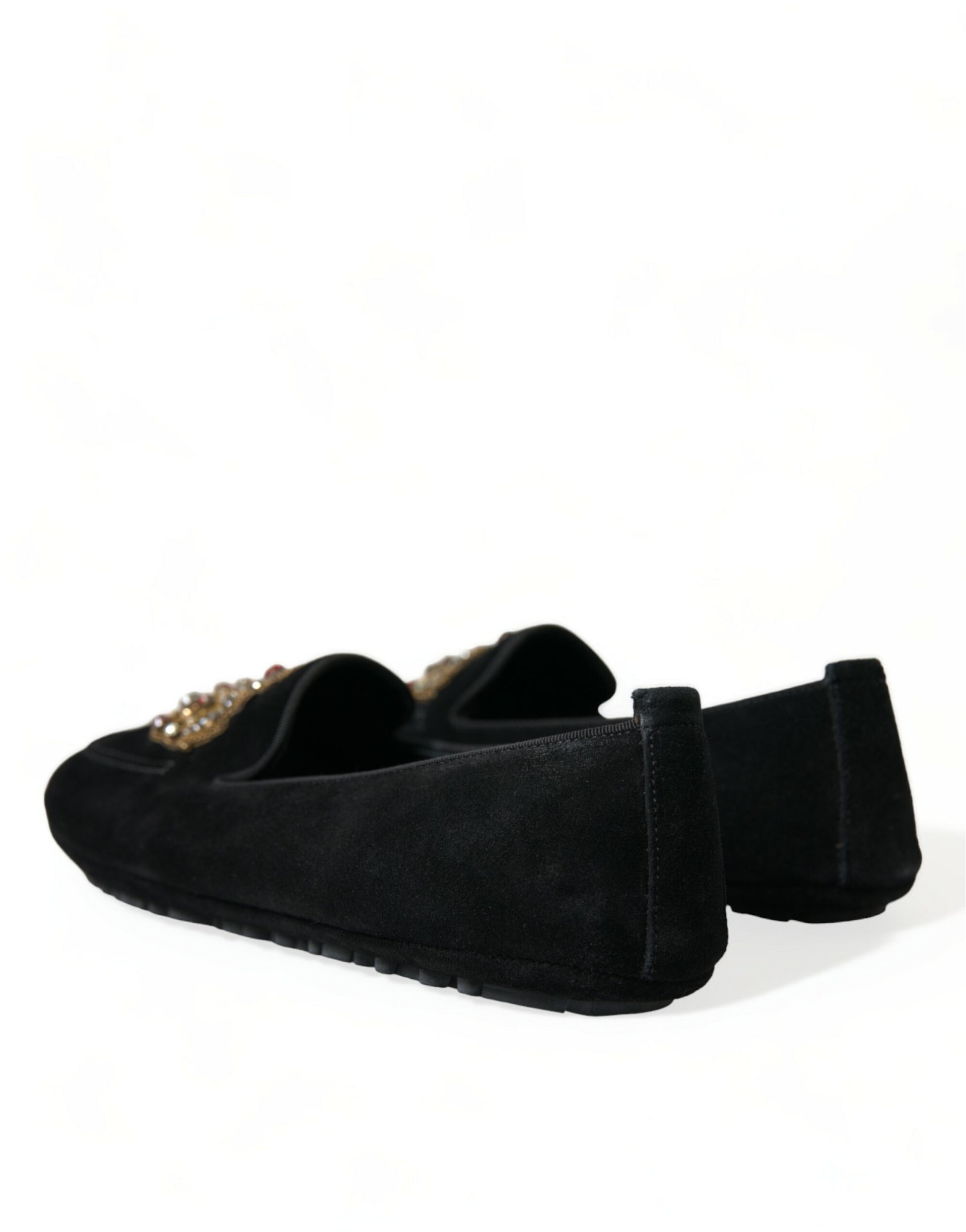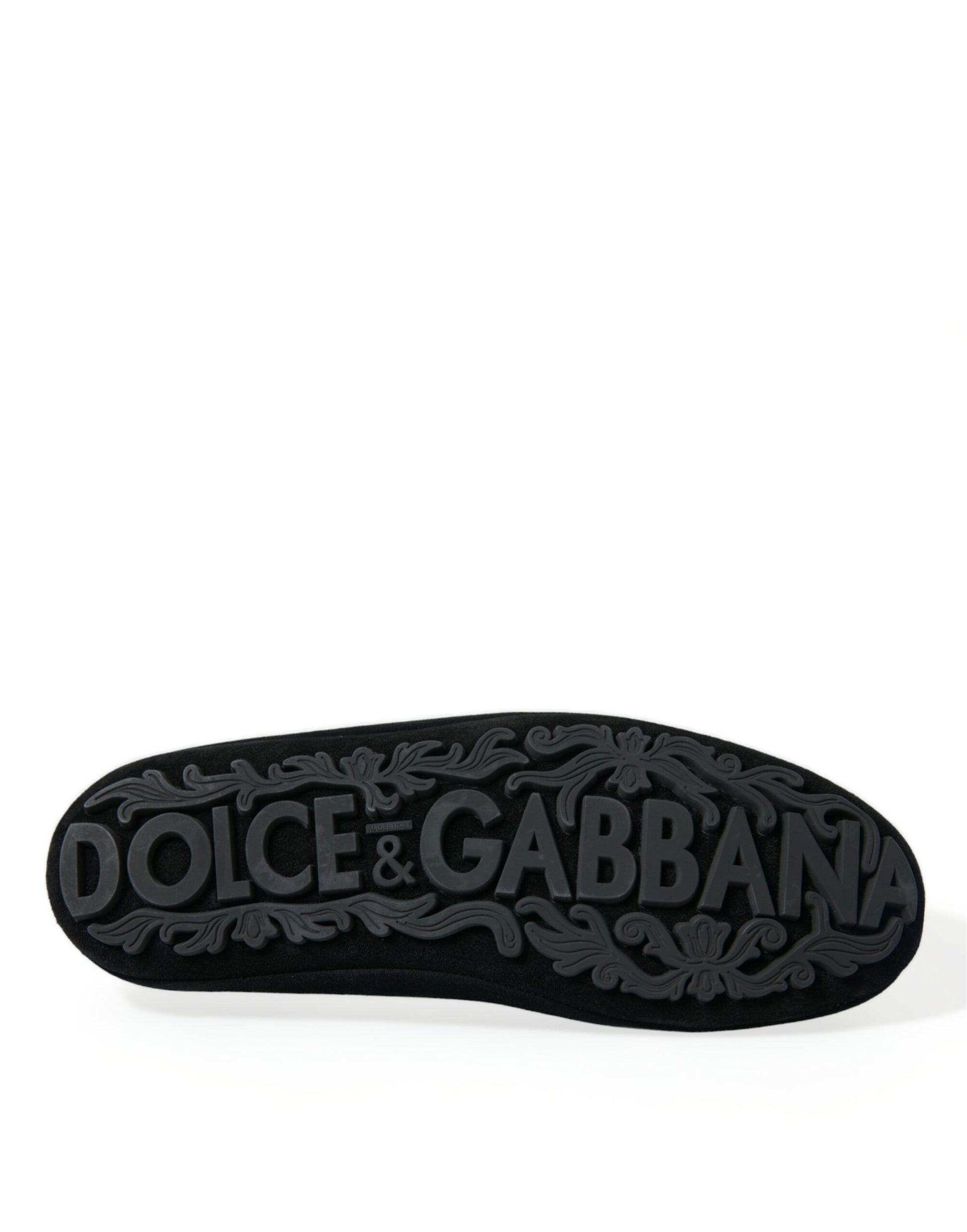 Step into luxury with these stunning Black Calfskin Loafers from Dolce & Gabbana, expertly crafted in Italy and adorned with sparkling crystal embellishments for an exclusive touch of elegance. Perfect for any gentleman seeking to elevate his footwear collection with high craftsmanship and iconic logo details. Step out with confidence and sophistication.