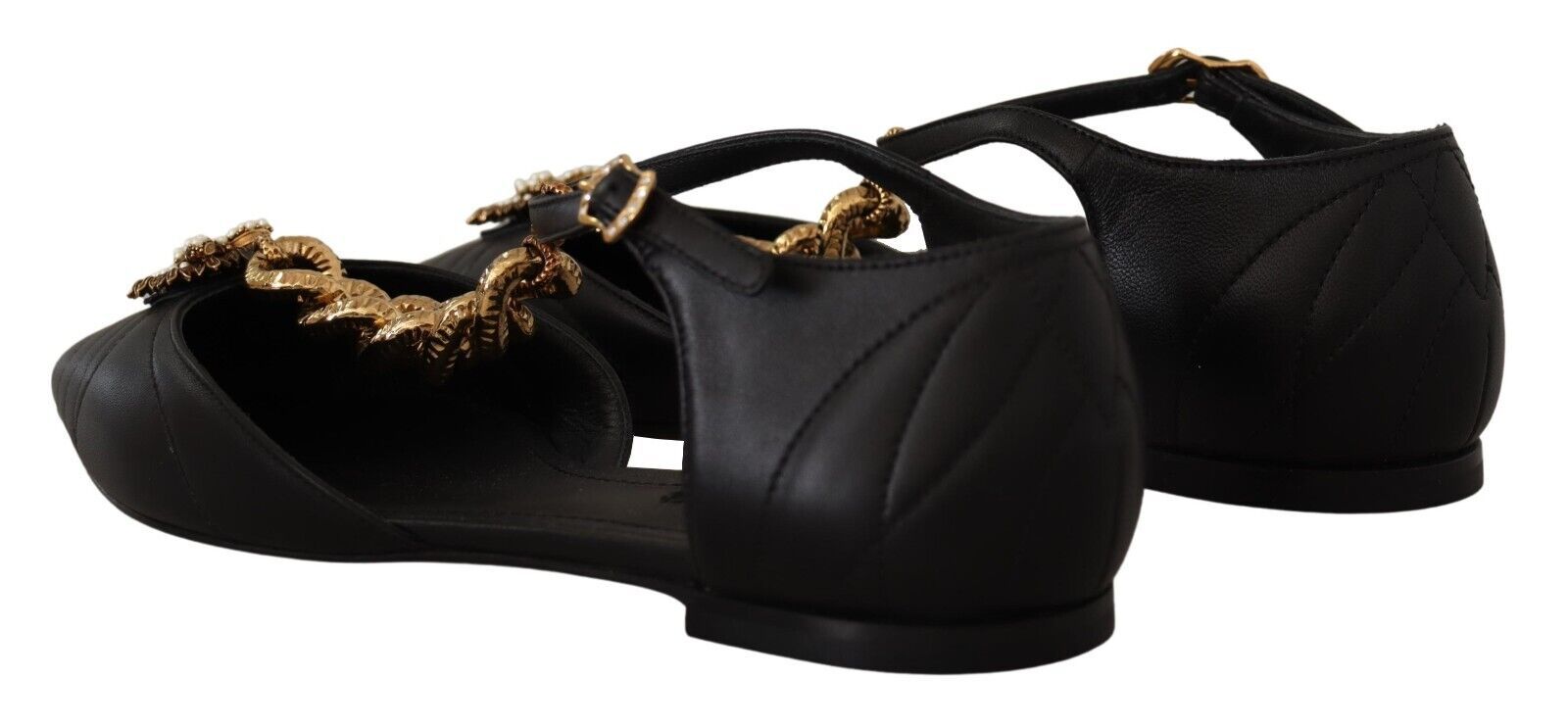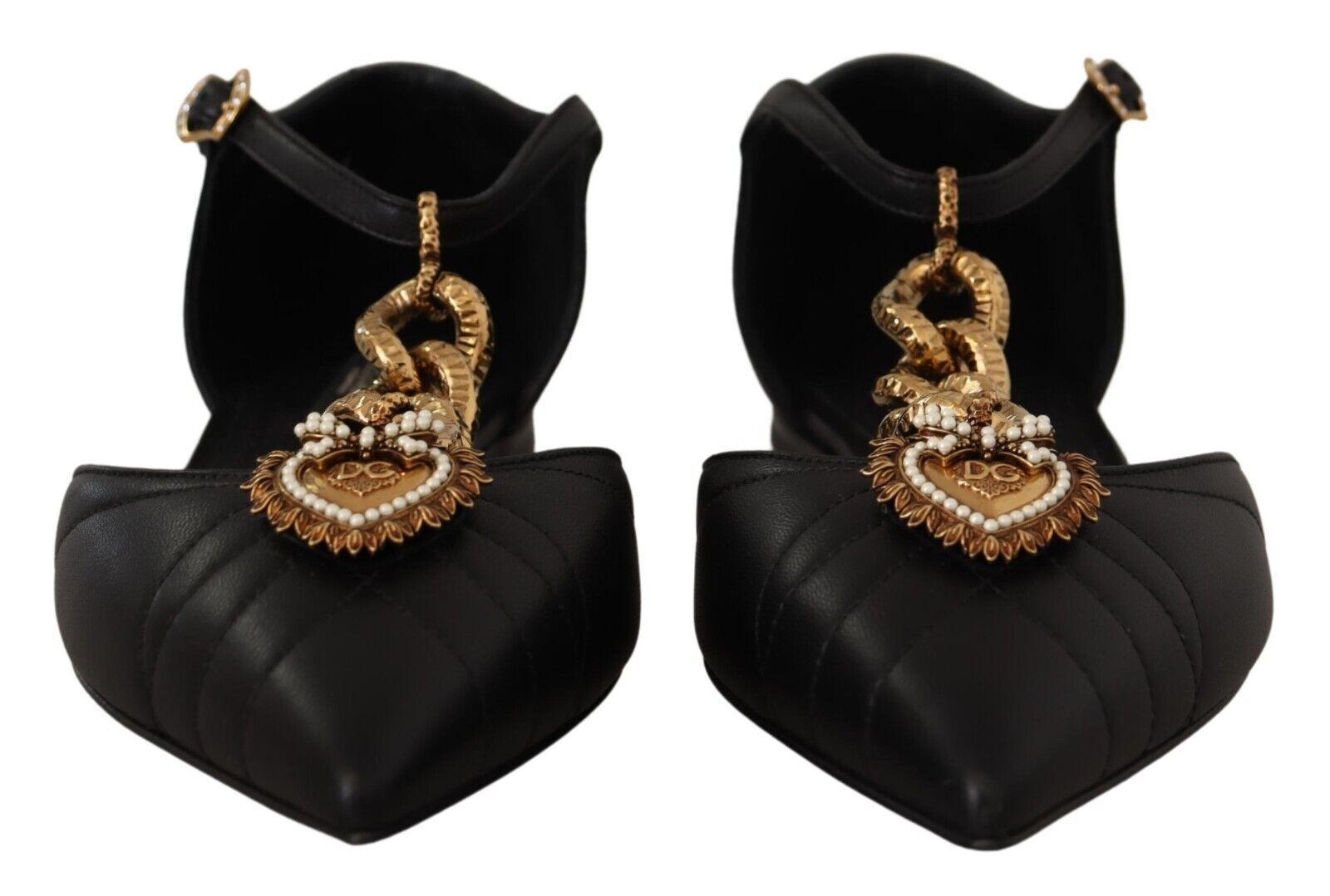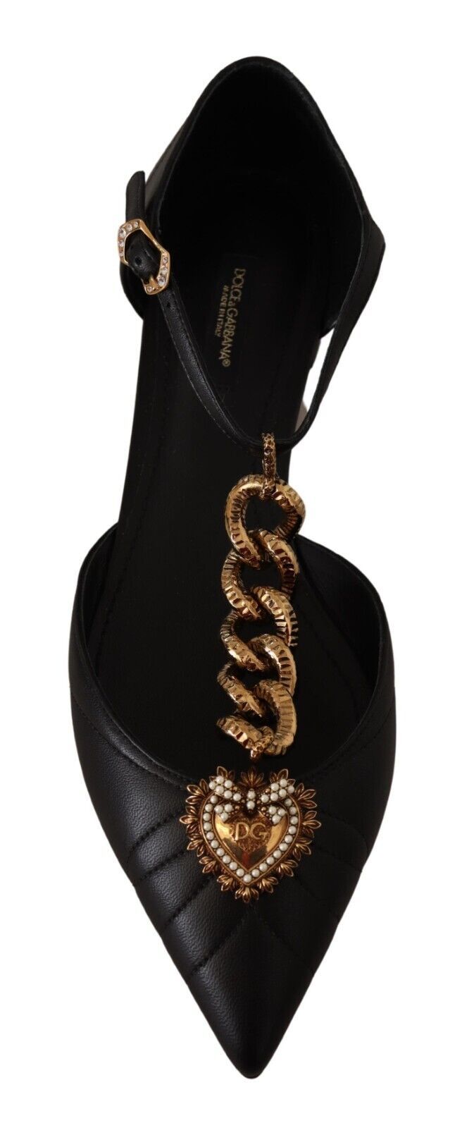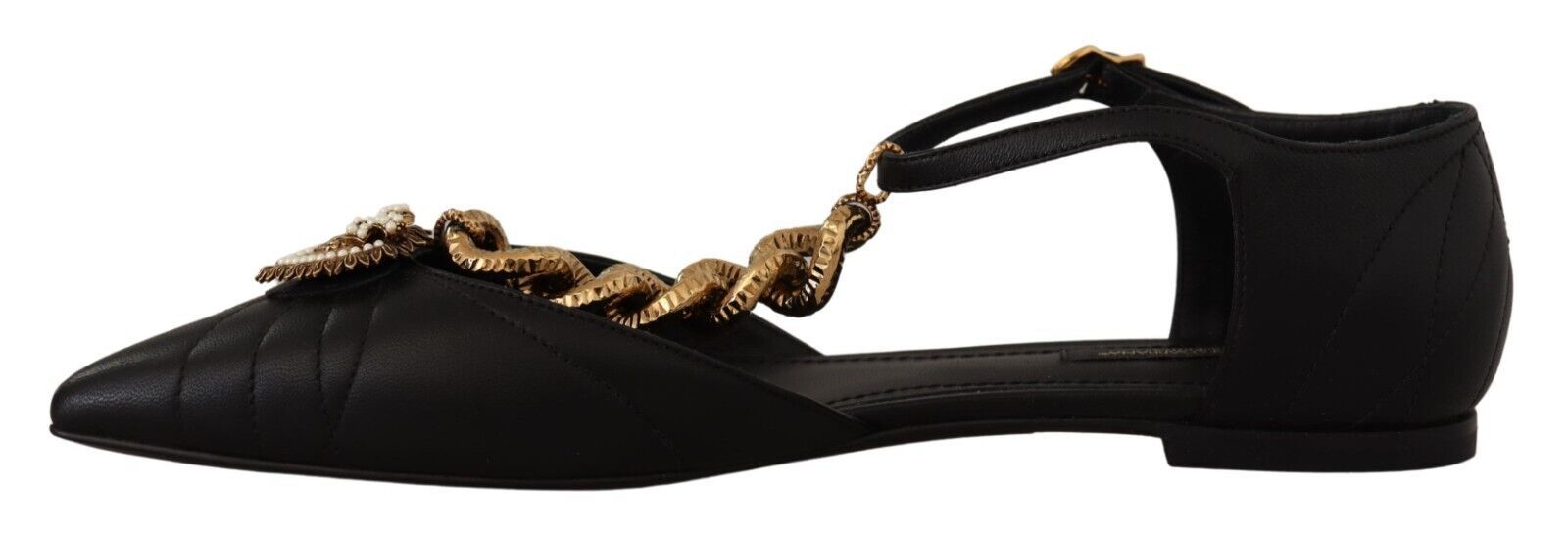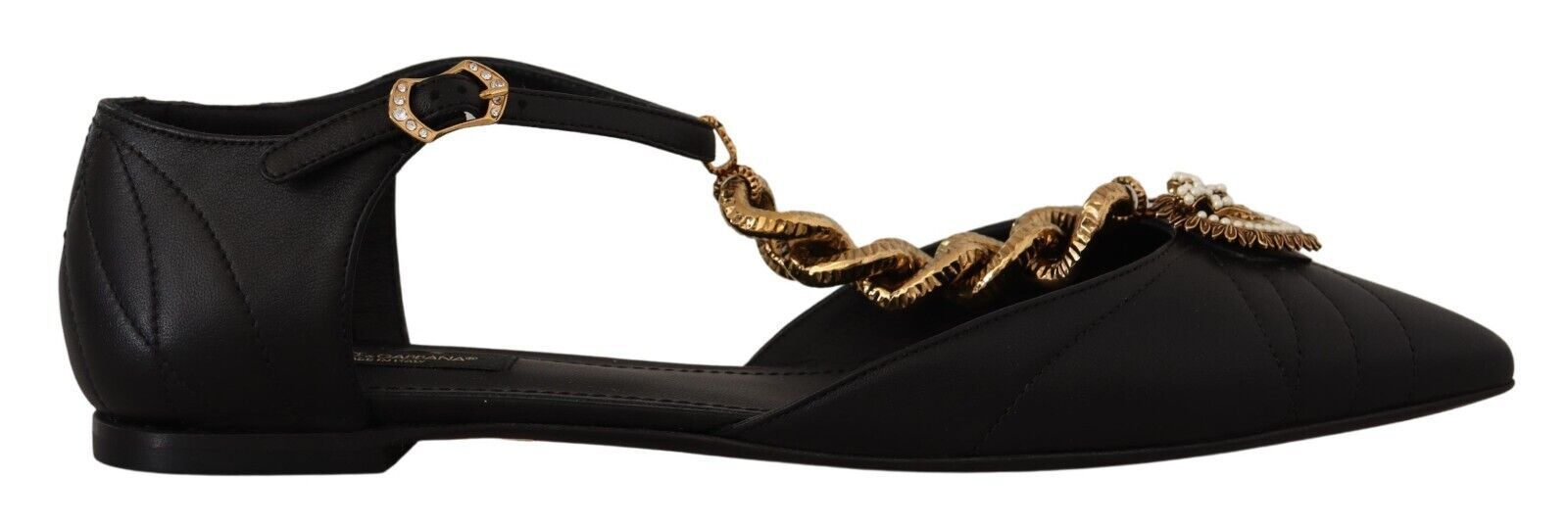 Step into luxury with these exquisite T-Strap Flat Sandals by Dolce & Gabbana. These sandals are the epitome of high-end fashion, brand new with tags and 100% authentic. The stunning gold chain embellishment adds a touch of glamour, while the gold devotion heart showcases the brand’s meticulous attention to detail. Crafted in Italy, they feature a comfortable leather bottom sole for all-day wear. Perfect for elevating any sophisticated ensemble.