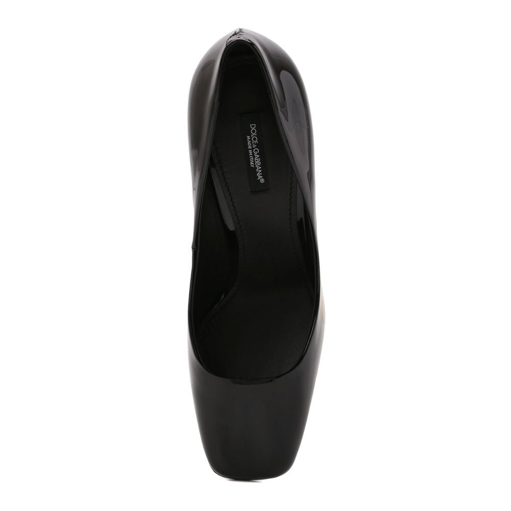 Dolce & Gabbana décolleté in black patent calfskin, gold-painted heel with three-dimensional DG logo.