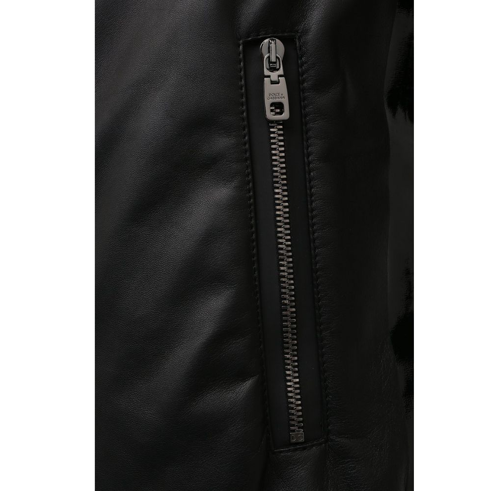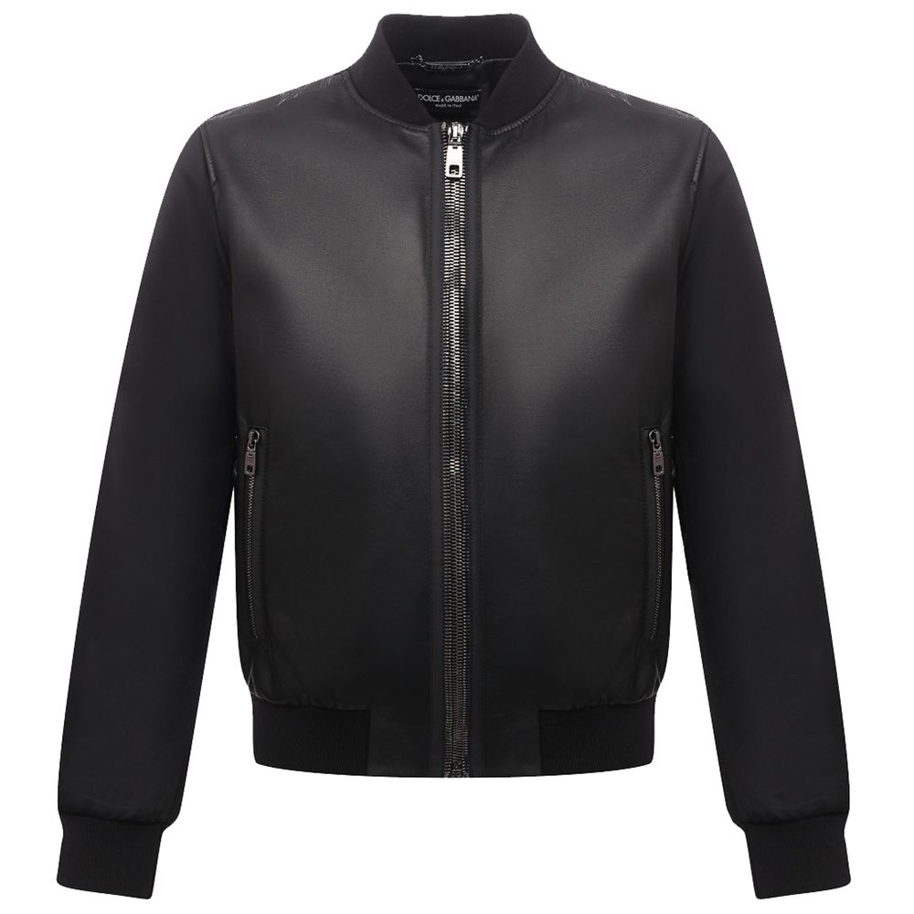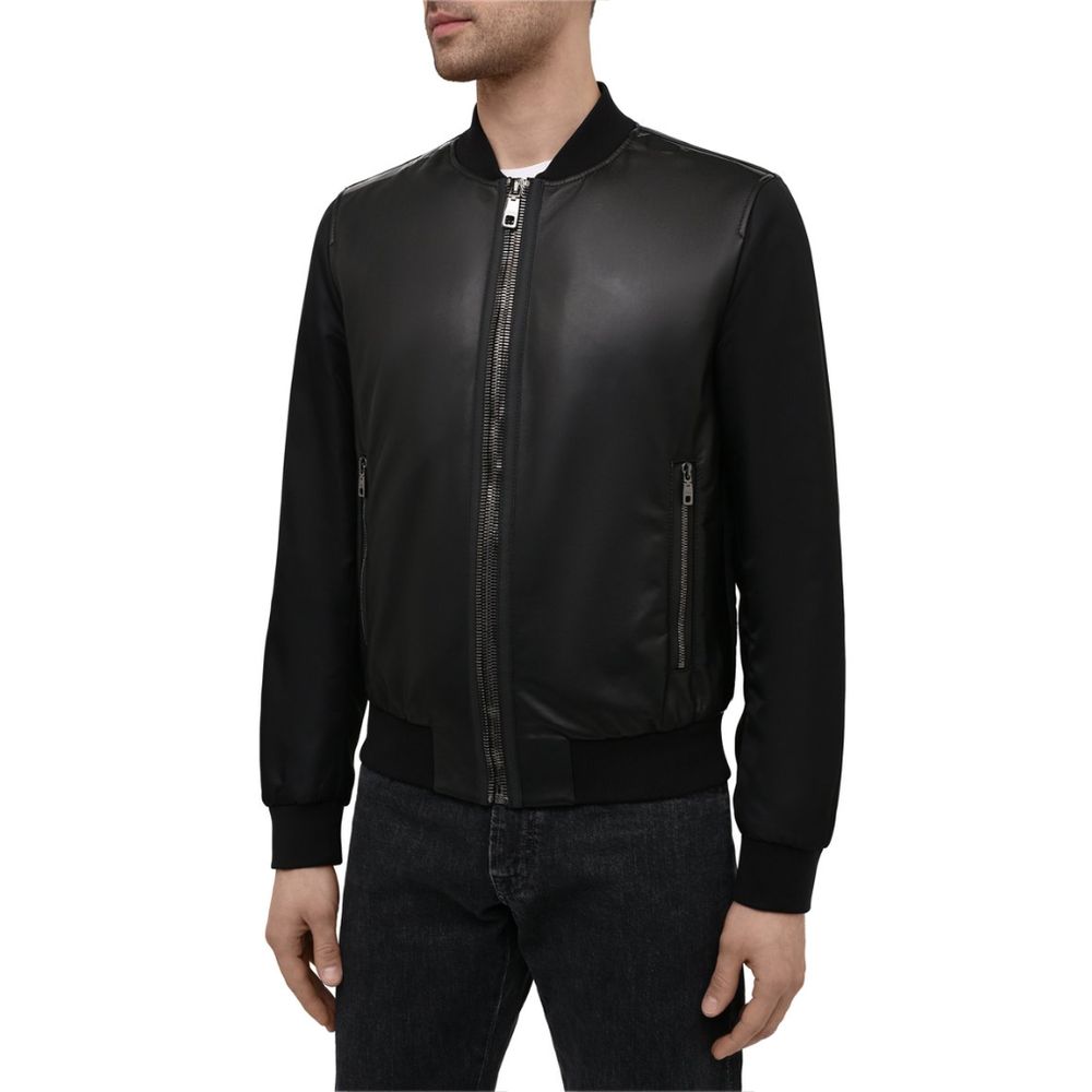 Dolce & Gabbana jacket made of soft smooth lambskin and matte windproof nylon, shiny stripes on the shoulders. On the back is a spur with a shiny stripe and fabric label. Two side pockets and zipper closure